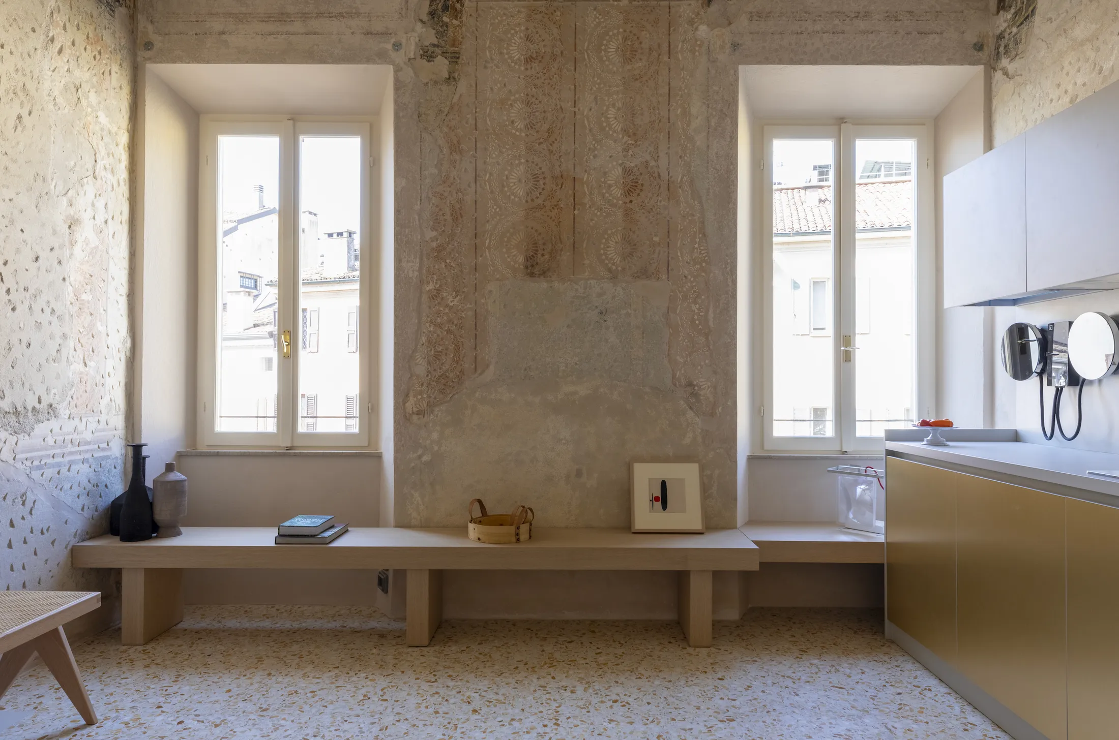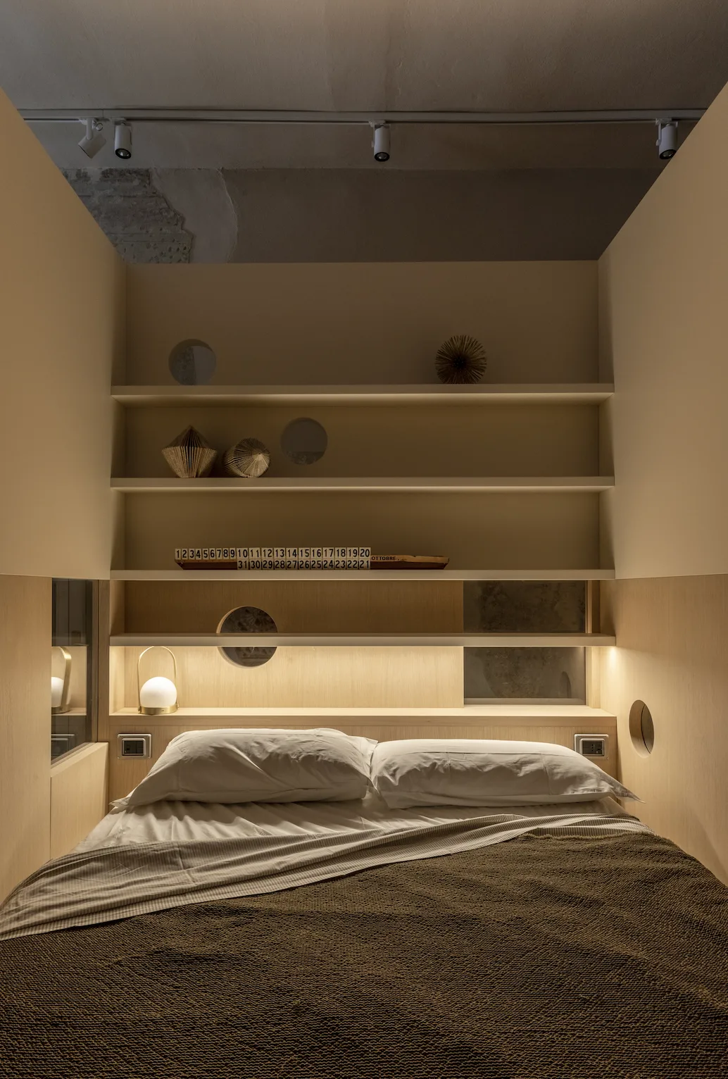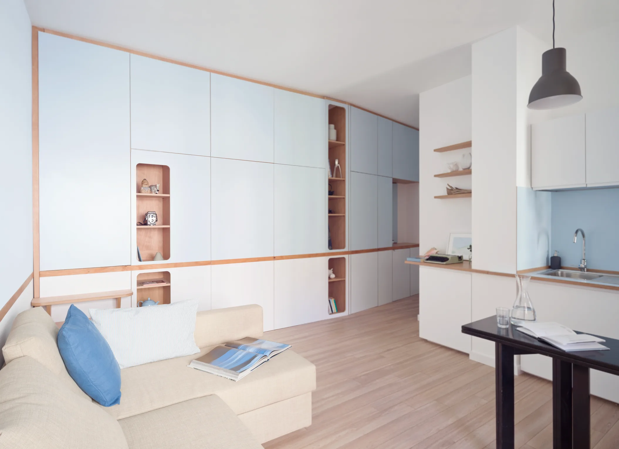 In the heart of Milan, architect Bianca Magi of ATOMAA reimagined a 21sqm/226sqft micro-apartment — turning their smallest project to date, aptly named So far the Tiniest, into a showcase of compact, creative living. Once dark and cramped, the space was completely transformed by removing interior walls, relocating the bathroom and introducing layered zones for living, sleeping and storage. A curved walnut kitchen features a fold-down backsplash to extend prep space, while a fold-out dining table and modular benches reflect the project’s guiding principle: overlapping function without shrinking experience. From the walk-in wardrobe tucked beneath the raised bed to the handcrafted mosaic tile floor, every element maximises light, flow and joy.