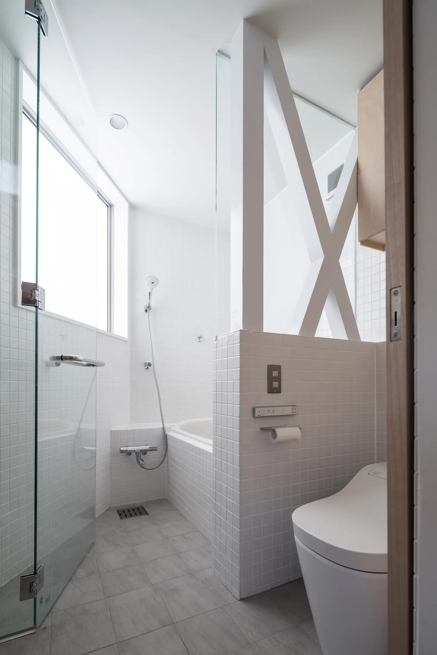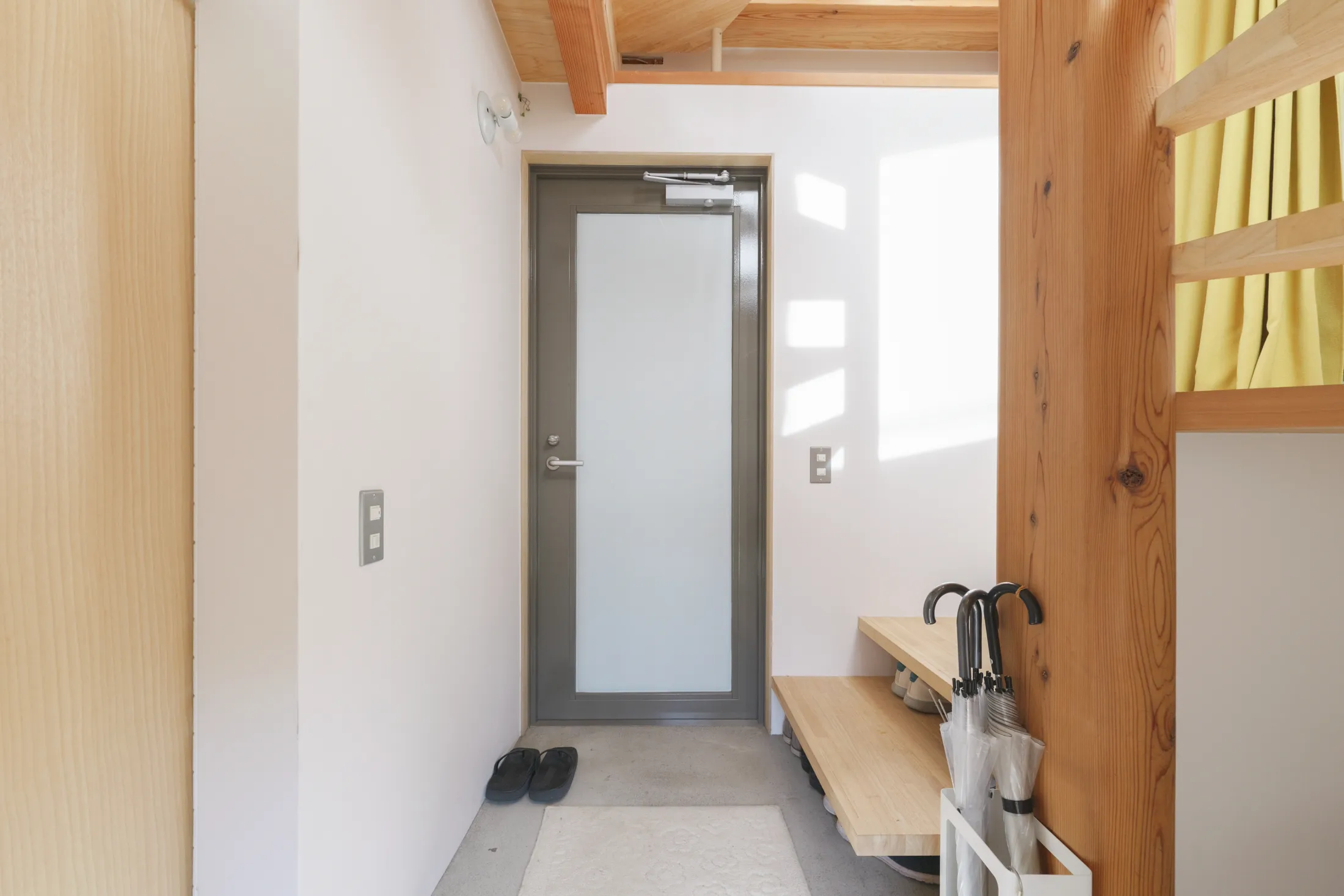 At the entrance, the first stair treads do more than lead upward. They widen slightly and remain open beneath. Shoe storage tucks neatly below, while the steps themselves double as a place to sit and put shoes on. By folding seating and storage into the staircase itself, the genkan becomes an active part of the home, setting the tone for a space where circulation is designed to be used, not just passed through.
