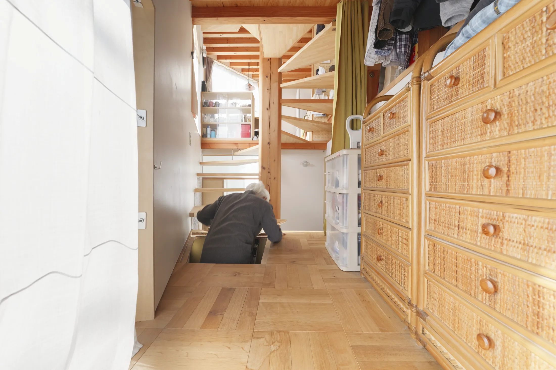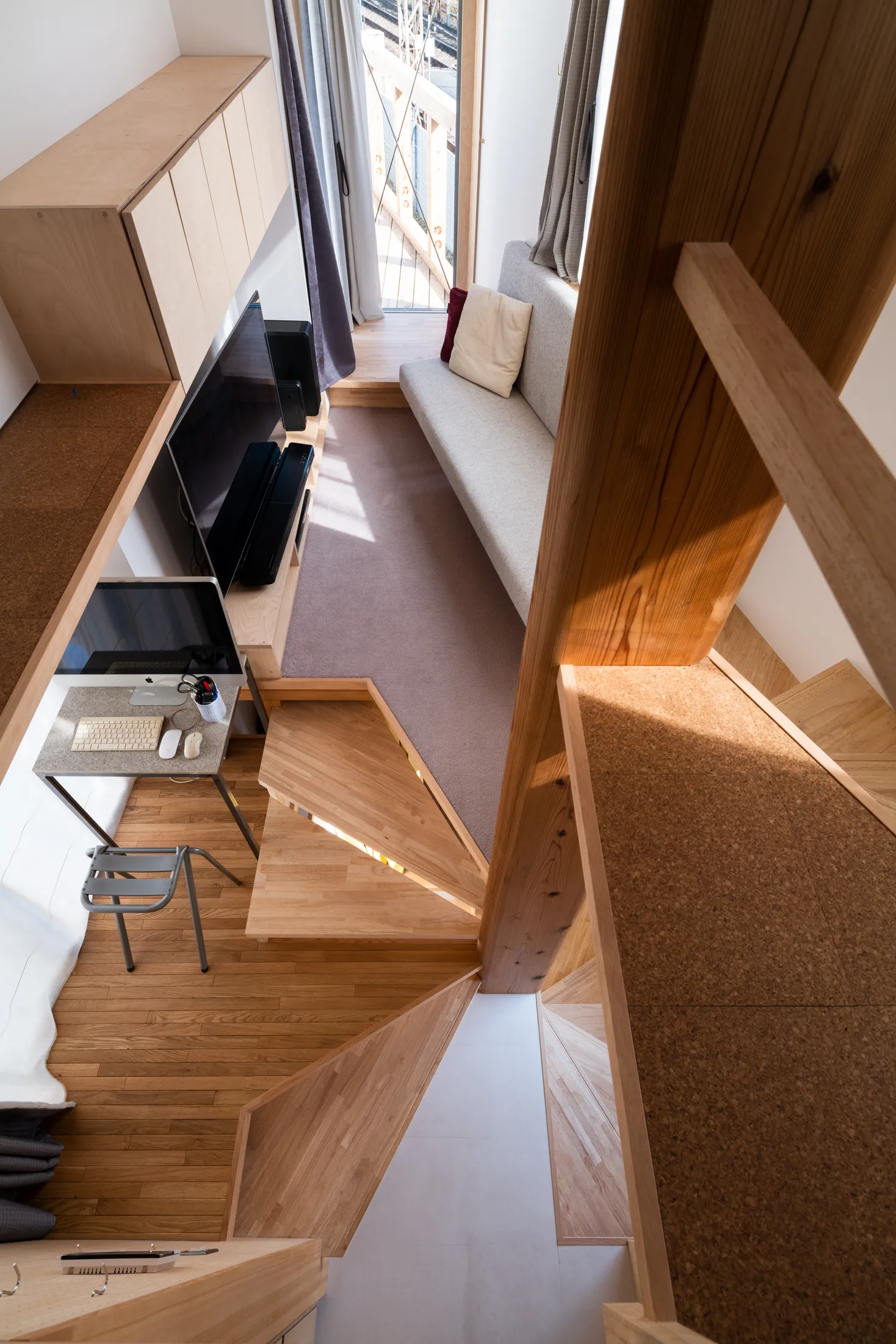From the genkan to the loft, each level flows into the next through carefully calibrated changes in height, light, and material, making the house feel expansive despite its compact size. Birch plywood furniture, exposed beams, and varied window openings soften the density of the plan. Stair treads widen, then contract. They become places to sit, pause, or store everyday belongings. Below, we highlight five design decisions that show how House M transforms circulation, storage, and structure into places to be.