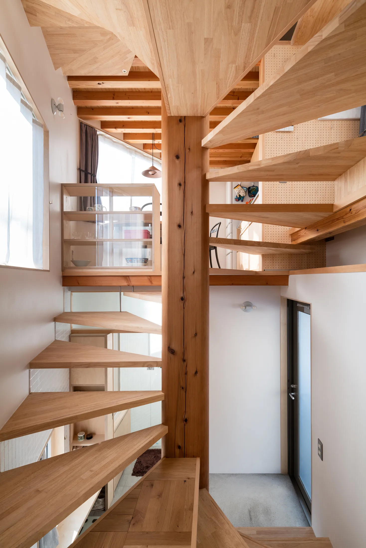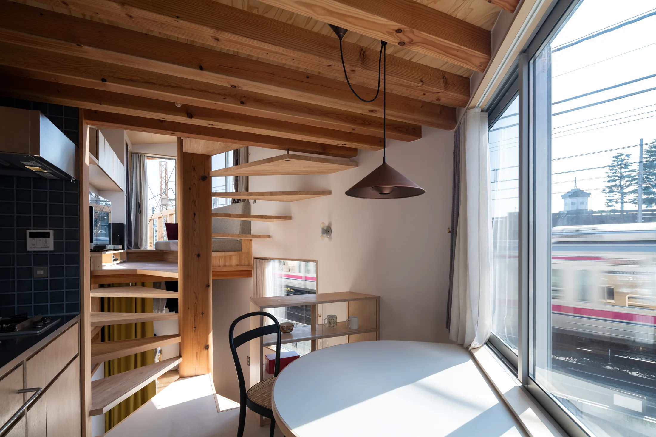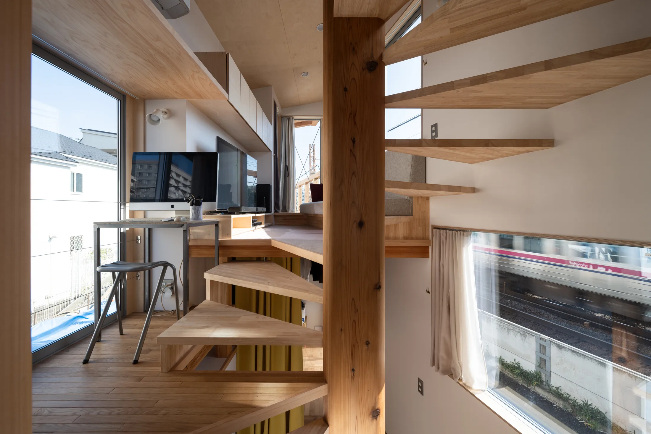 Set on a narrow, irregular site in Tokyo’s Setagaya Ward, House M sits beside an active railway line. Architect Takehiko Suzuki created the home on a compact 30sqm/322sqft site. It was once much larger, but when plans were made to elevate the tracks, the owner chose to sell part of his land and rebuild on what remained, rather than leave the neighbourhood he had lived in for decades. Rather than treating the constraints as limitations, Suzuki used them to shape a vertically layered home organised around a central, tree-like pillar and spiral staircase. The split-level layout compresses private rooms and expands transitional spaces, allowing circulation to double as living space.
