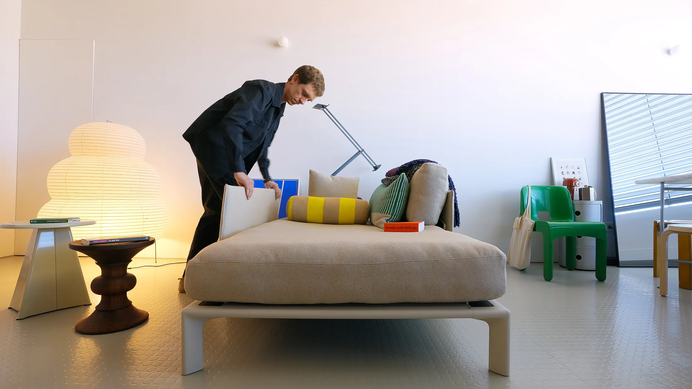 Industrial finishes set the stage for a collection that balances the contemporary and the iconic. A Vitra Anagram Sofa anchors the living area, its clip-on sides shifting to suit the moment, while an Eames walnut stool brings a thread of design history into the mix. Around the marble-topped dining table, Artek stools tuck neatly away when not in use, ready to be pulled out for dinners with friends. Across the apartment, artworks and objects – from Agnes Denes’ 1970s design manifesto to pieces by young designers – layer in a sense of personality and exploration.