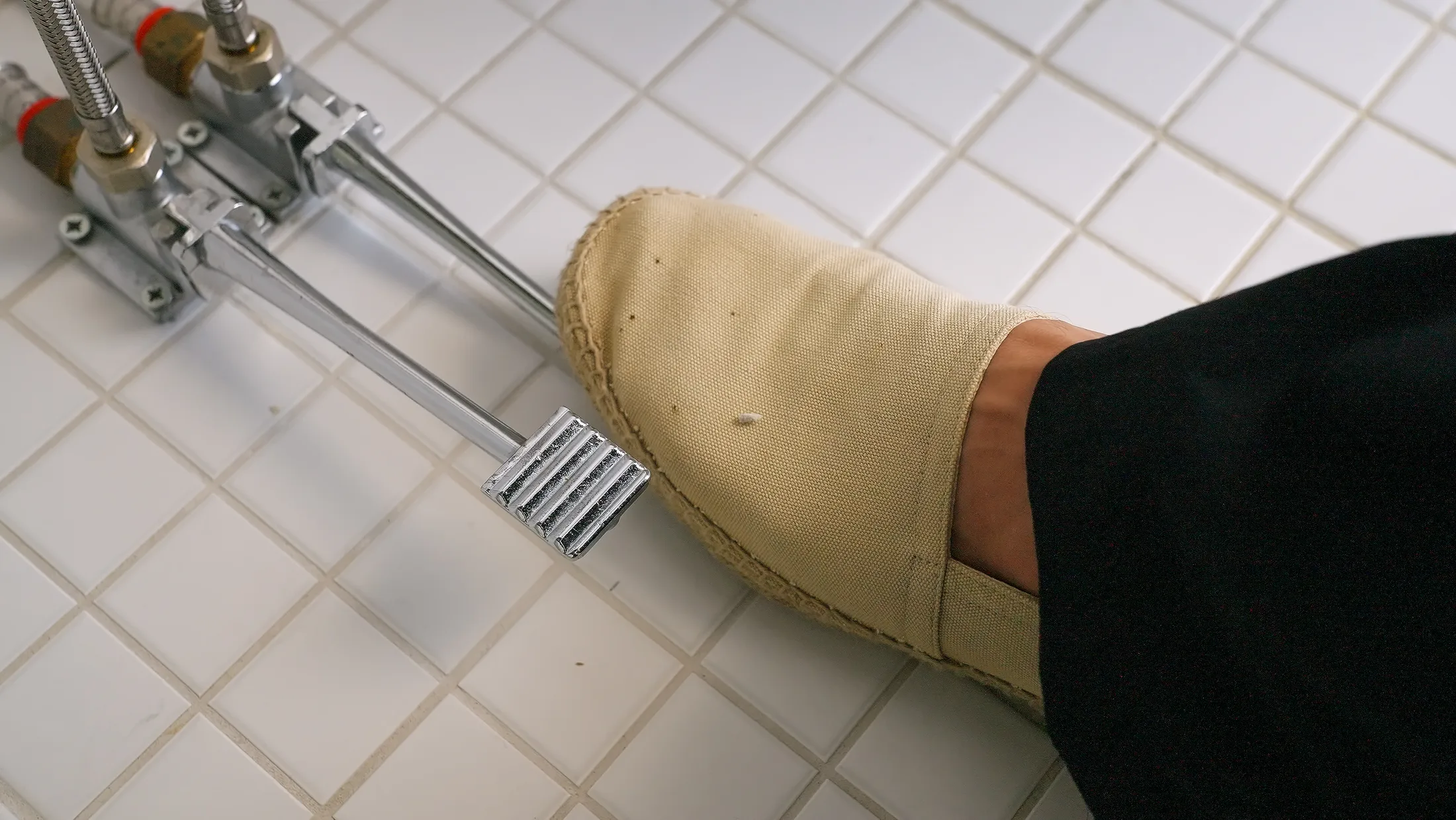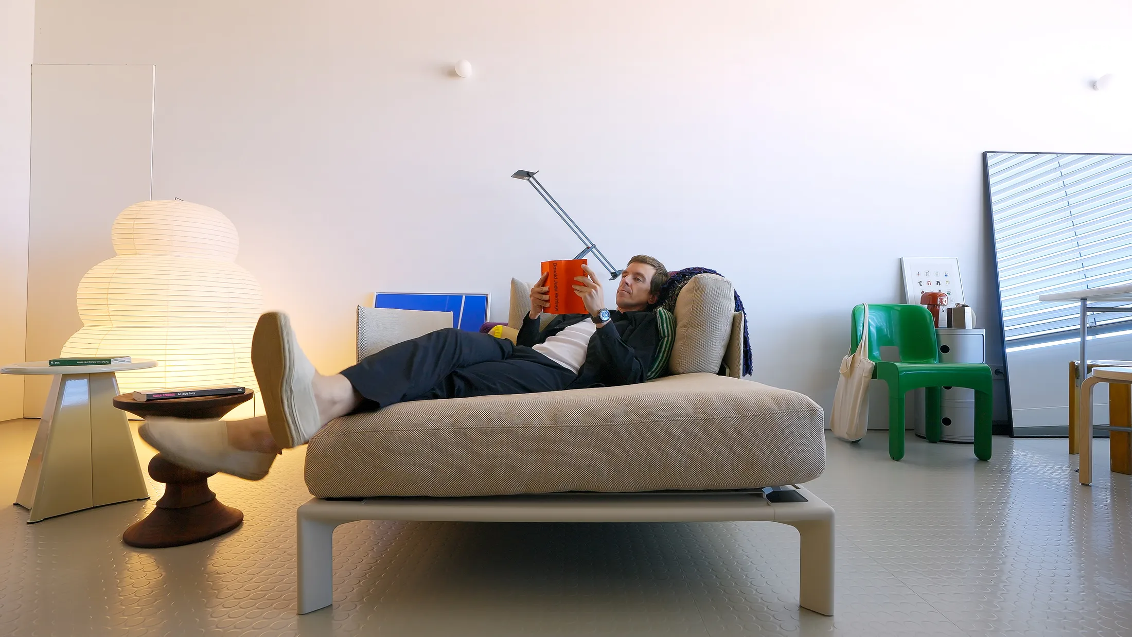 Mediero has shaped a home that acts as a canvas, though it is far from blank. He sees alternative materials as essential to this process, noting that they are “quite affordable and utilitarian, as well as innovative and surprisingly beautiful.” In Studiolo, this curiosity shows in the soft Pirelli rubber floors, the galvanised steel ceiling panels (more often seen in offices), and the stainless steel that defines both kitchen and bathroom. The kitchen unit was sourced from an industrial manufacturer, while the bathroom sink, operated by a foot pedal, adds an unexpected touch of play. “It makes washing our hands a little more exciting,” he notes with a grin.