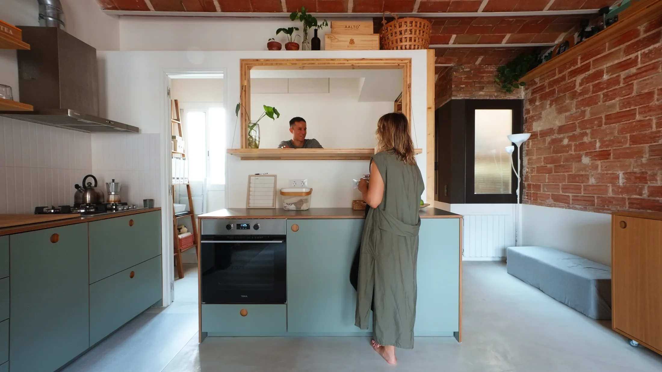 The kitchen was designed by Porta Díaz and Boehner as three lower units rather than a single fixed block, allowing the social area to shift depending on the day.Built withIKEA carcasses and customised high-pressure laminate fronts by CUBRO, the pieces sit low to keep sight lines clear and the space feeling open and airy. One unit, finished in a warm wood veneer so it reads more like living-room furniture than a kitchen element, sits on discreet casters. Most days, it stores dishware, pantry items, and a well-used bar, but when the couple hosts friends, it becomes a serving counter, a music table, or is simply rolled aside to clear room for a dance floor. Because it shares the same height as the other cabinetry, it naturally extends the worktop when needed, yet reads more like a piece of living-room furniture than part of the kitchen.