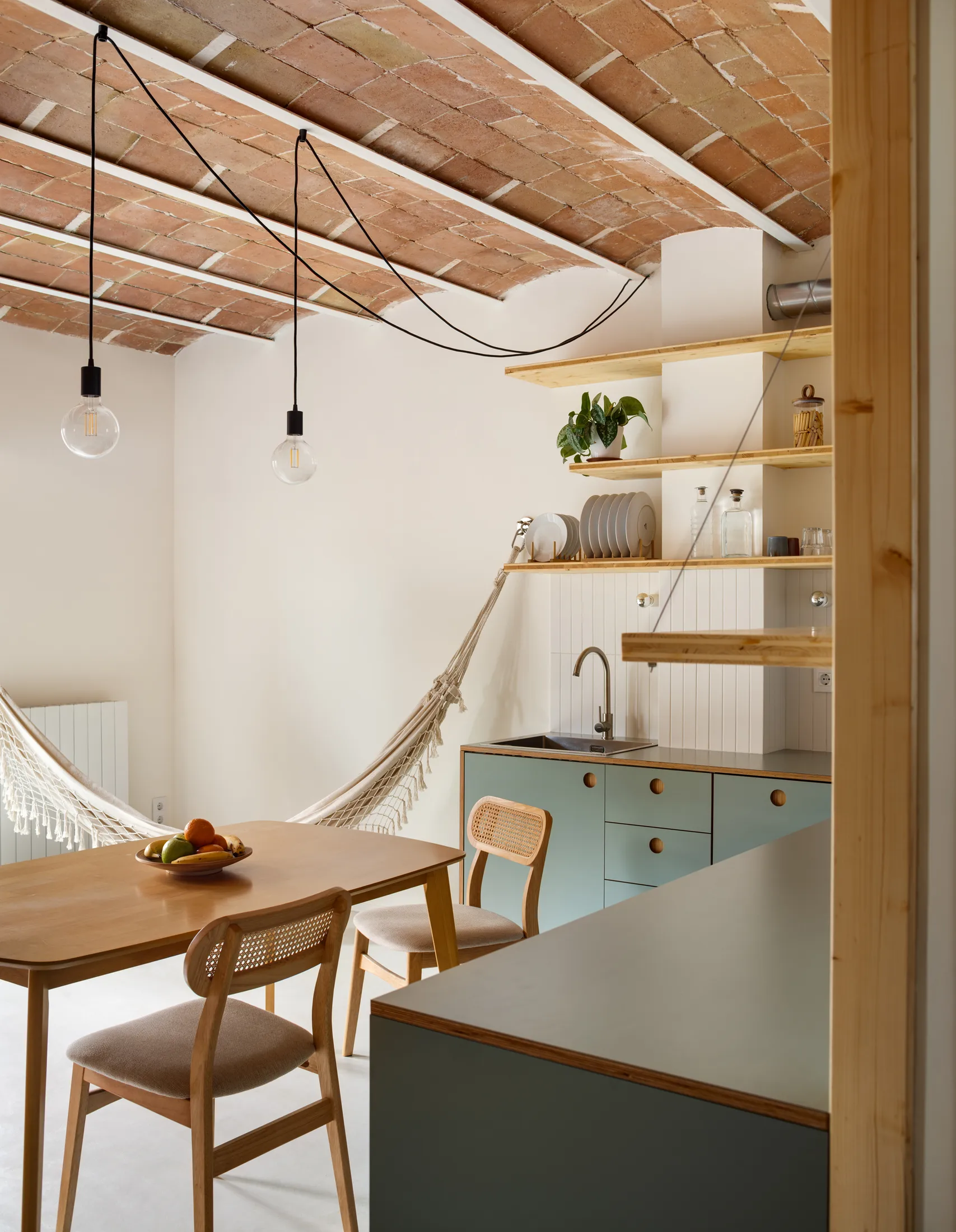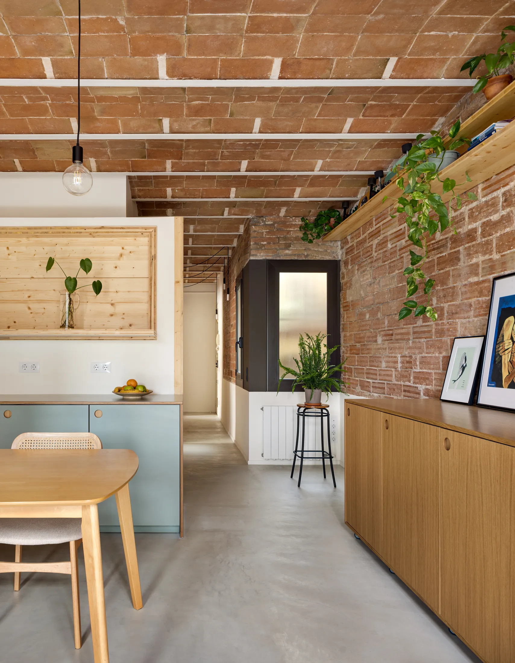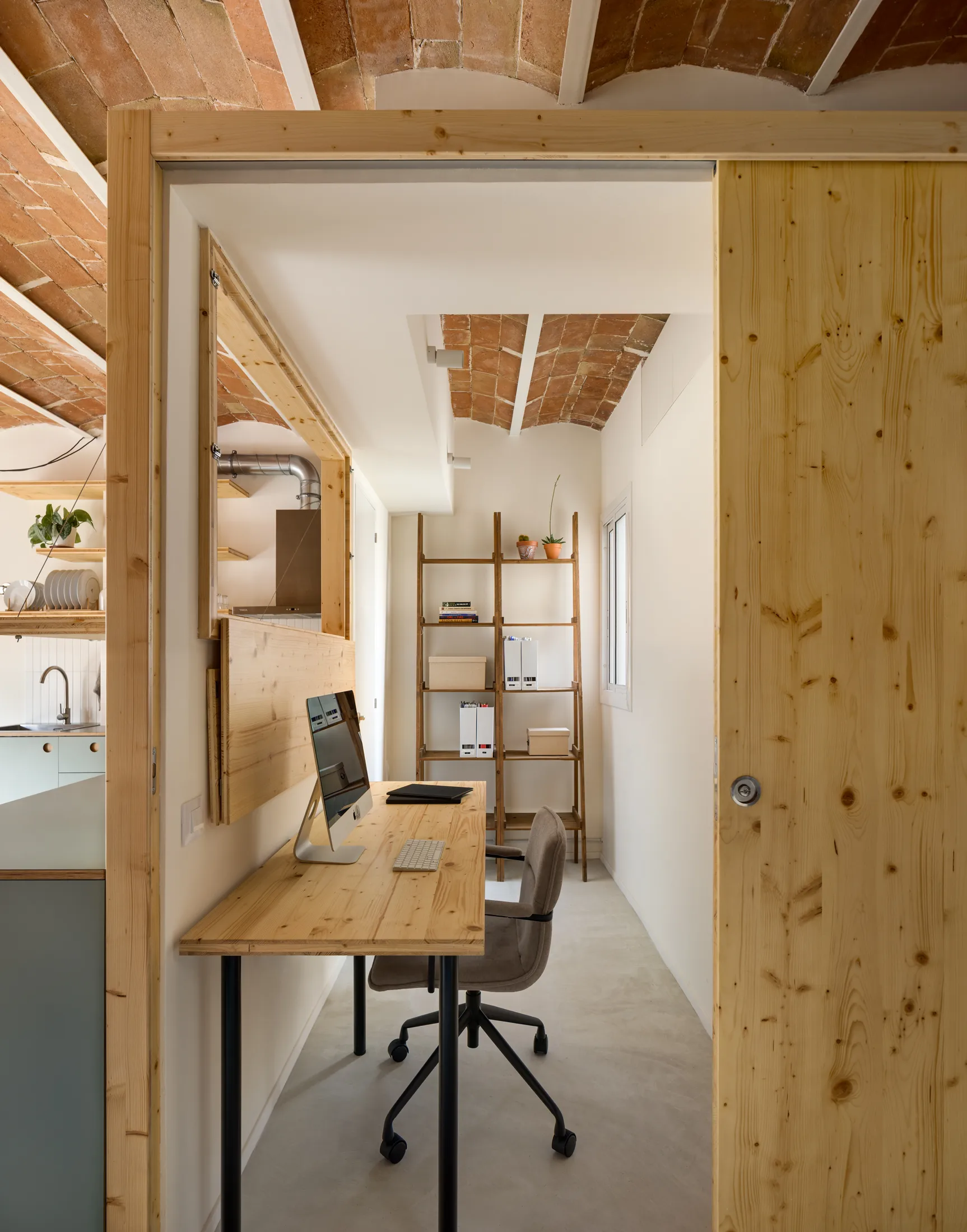 Designed around a brief that prioritised light, openness, and flexibility, Cristina Porta Díaz and Patrick Boehner of atelier pbo reimagined this once dark and cramped 45sqm/484sqft apartment in Barcelona. Rather than dividing the plan into separate rooms, they built a compact central “box” for the bedroom, bathroom, and office, leaving the rest of the space open as a bright, shared living area beneath restored Catalan vaulted ceilings. A home of this size relies on smart, subtle decisions. Here are five details that show how the architects made the space unique and full of light.