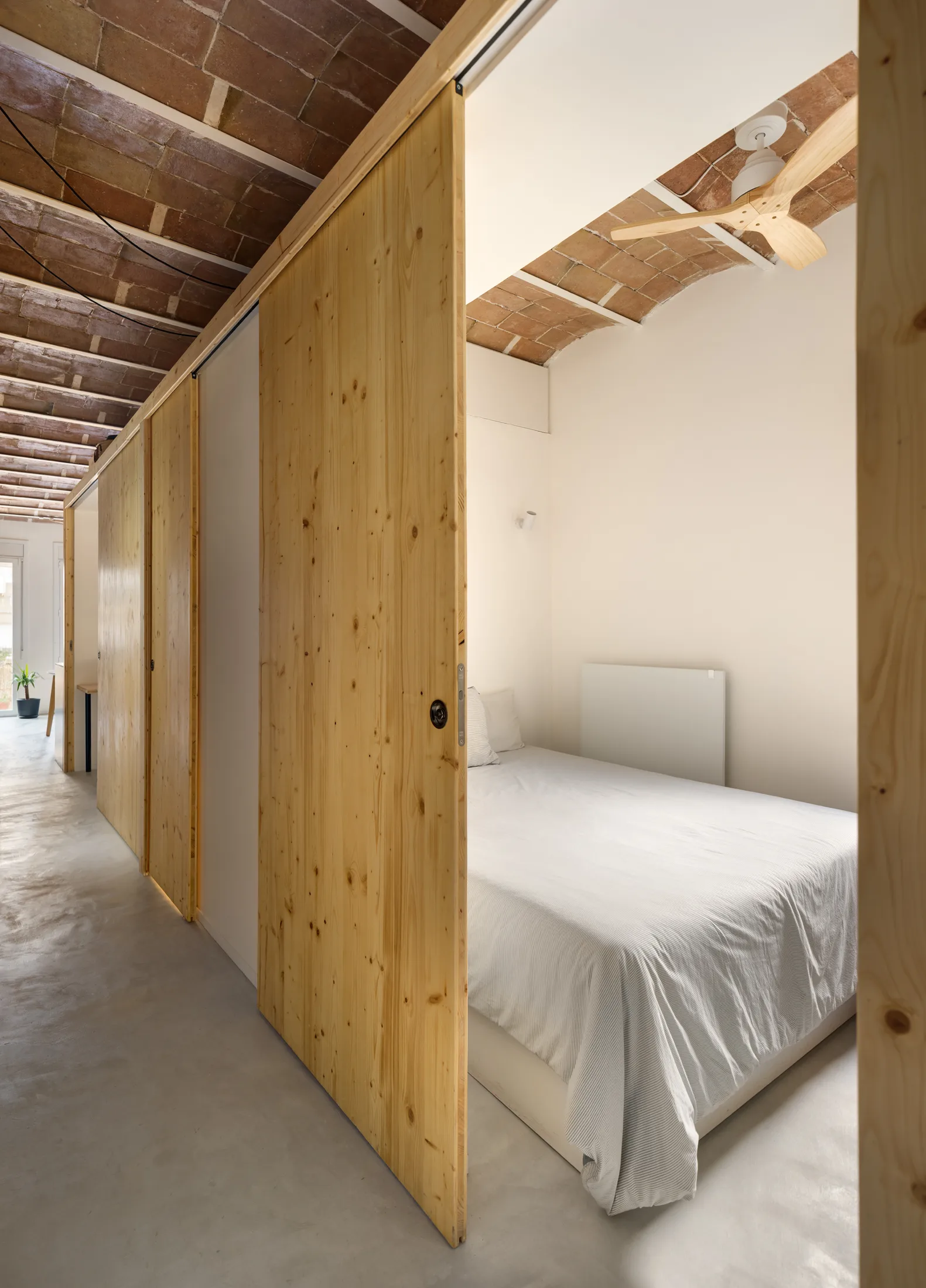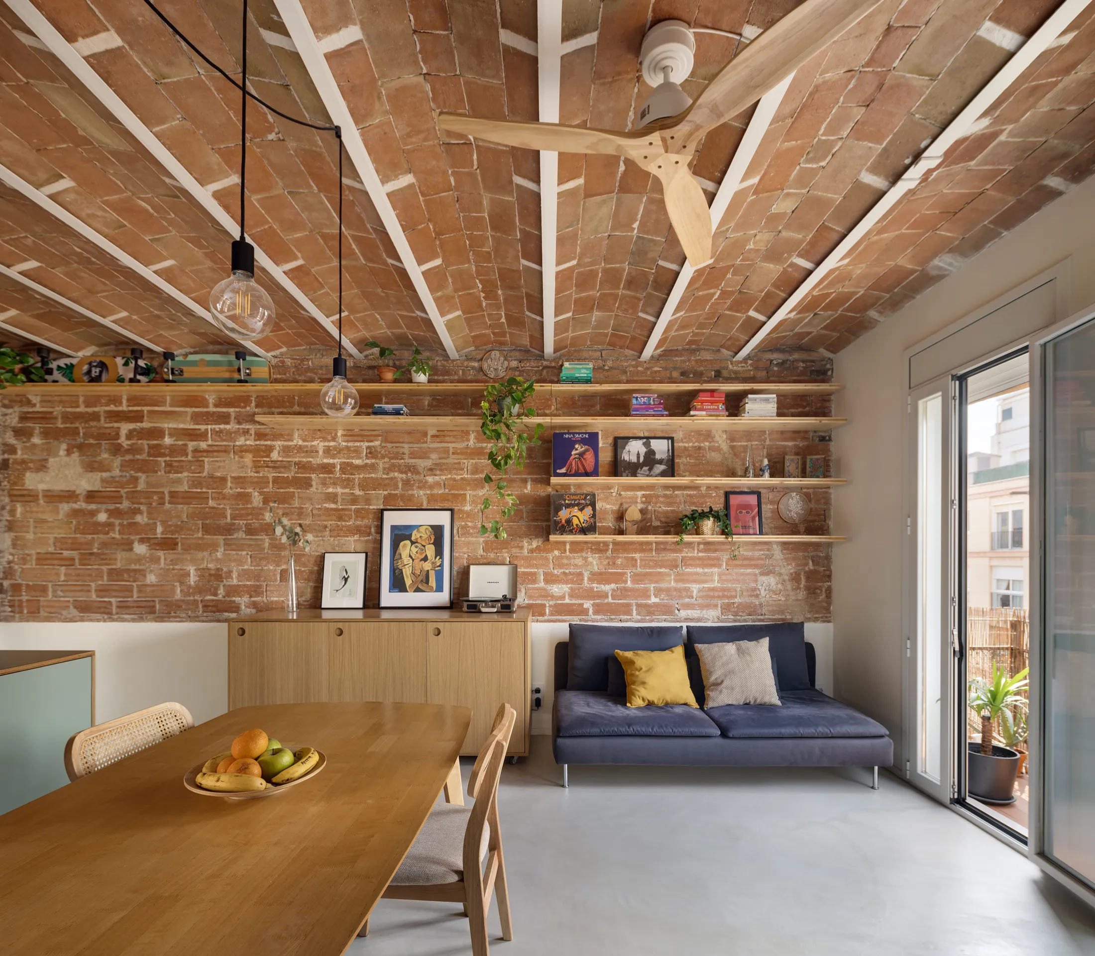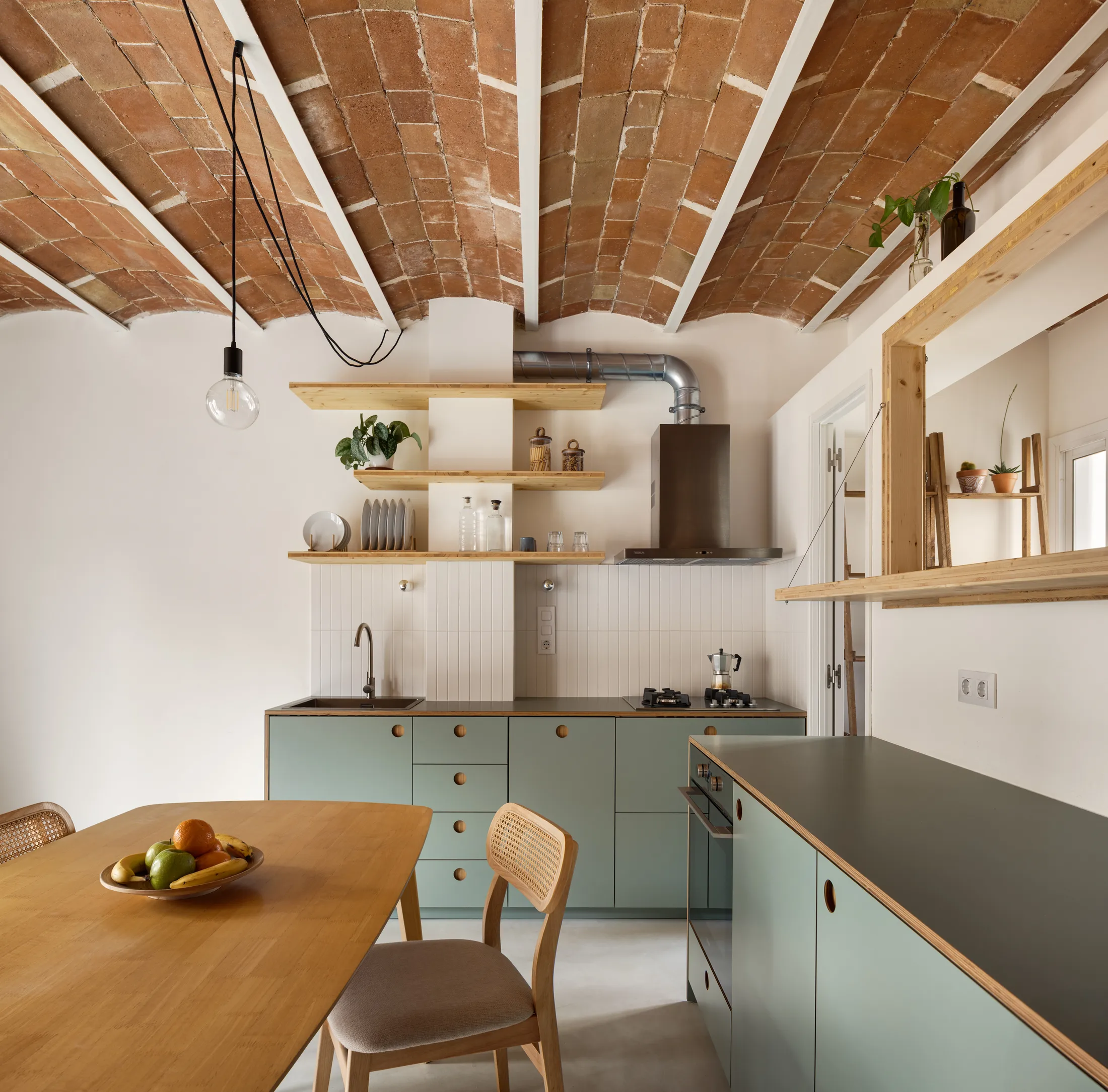 Designed around a brief that prioritised light, openness, and flexibility, Cristina Porta Díaz and Patrick Boehner of atelier pbo reimagined this once dark and cramped 45sqm/484sqft apartment in Barcelona. Rather than dividing the plan into separate rooms, they built a compact central “box” for the bedroom, bathroom, and office, leaving the rest of the space open as a bright, shared living area beneath restored Catalan vaulted ceilings. A home of this size relies on smart, subtle decisions. Here are five details that show how the architects made the space unique and full of light.