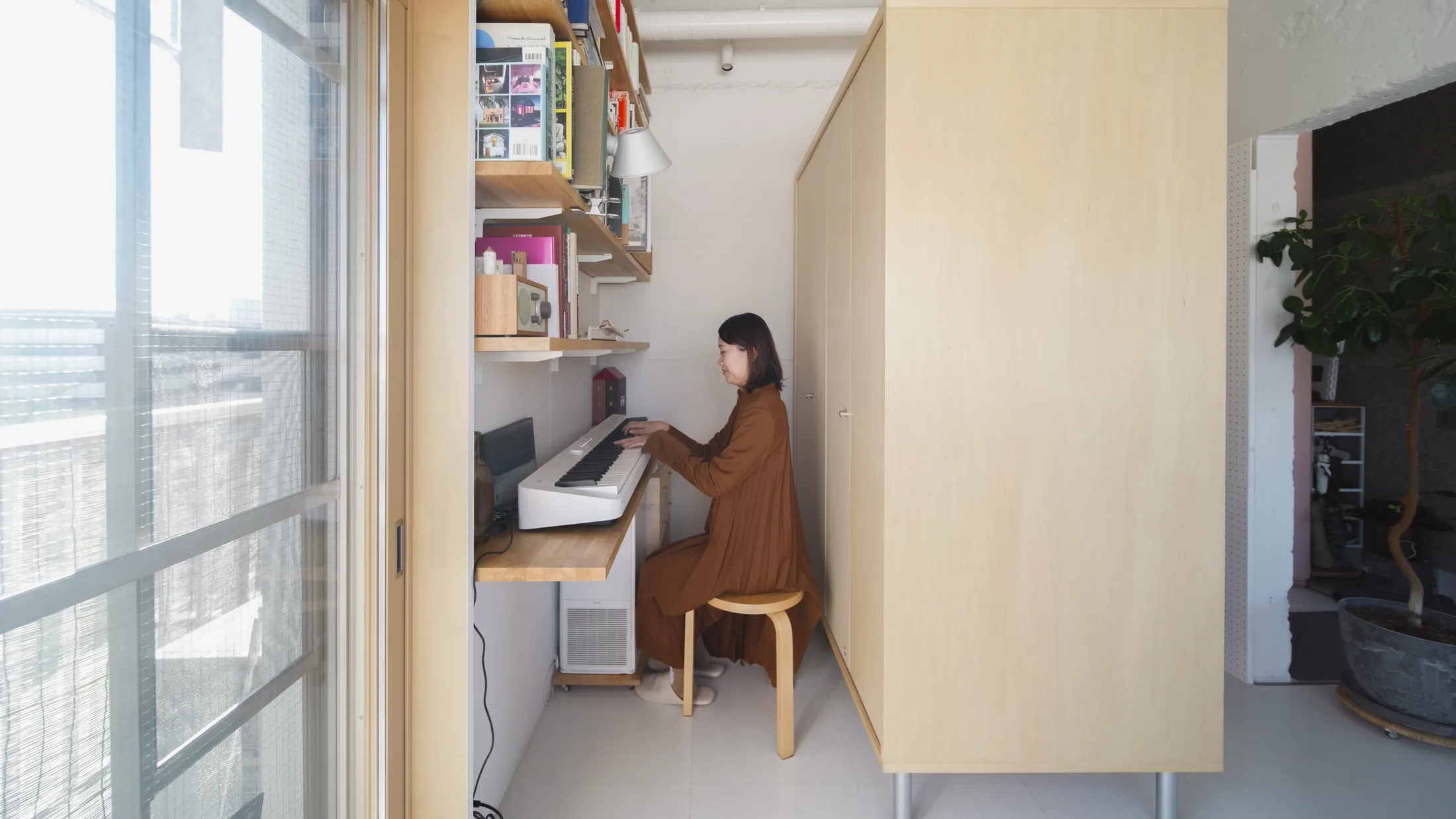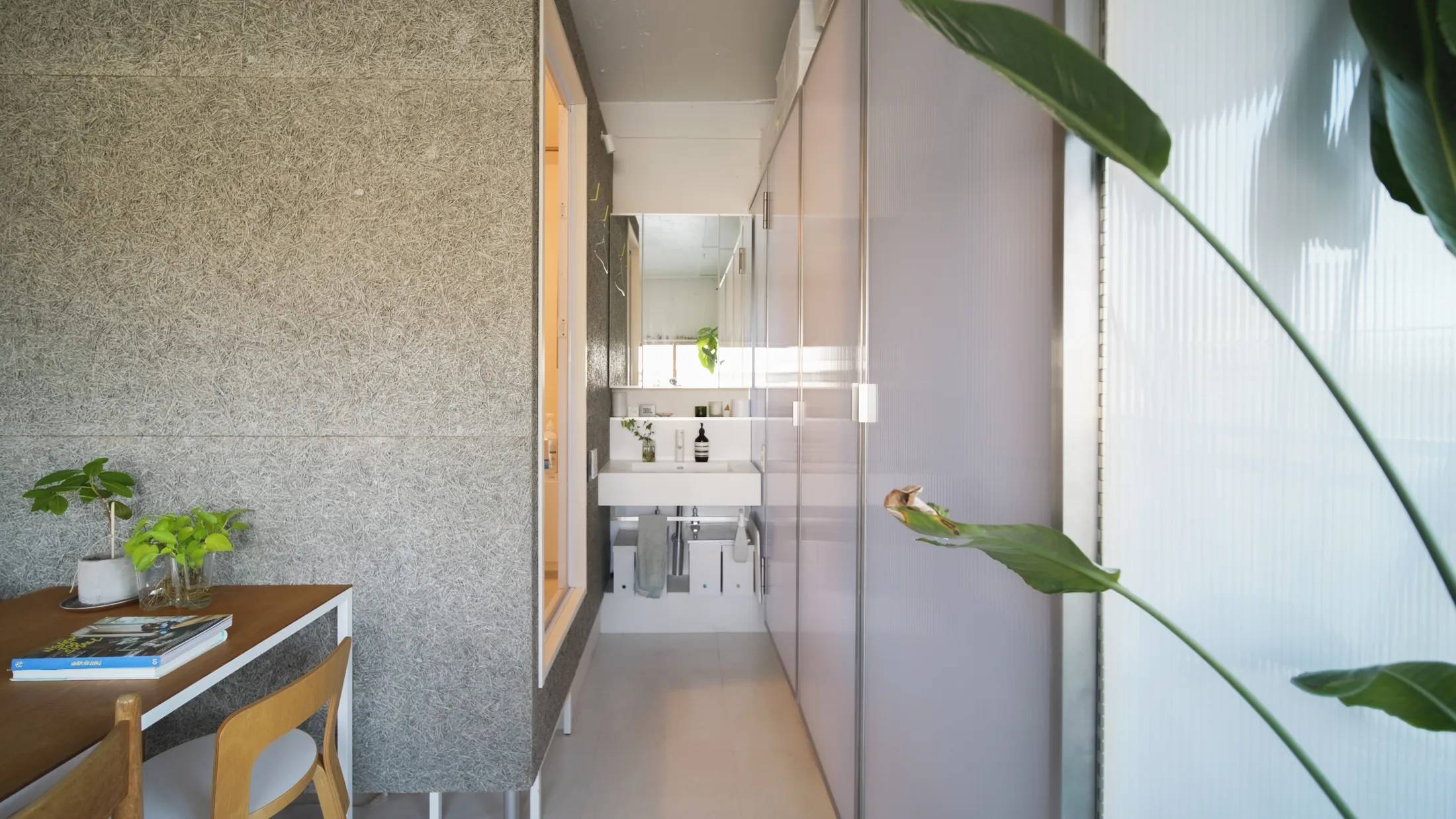 Their secret to a tranquil home comes down to a few key elements. Instead of rebuilding interior walls, they brought in a number of large furniture units to delineate the space. One box conceals a bathroom, finished in grey wood-fibre cement board with natural water- and sound-resistant properties. How does a box on legs contain the bathroom? Odaki explains: “Normally, a bathroom needs space to accommodate drainage under the floor and ventilation ducts above the ceiling, but by leaving the ducts visible and minimising the space for the drain pipes, the design looks like furniture. People are often surprised to find a bathroom inside.” Another box combines the toilet and storage, built from translucent polycarbonate so that light from the kitchen window filters softly through. The wardrobe, made from pale basswood plywood, doubles as a divider between the sleeping and living areas. Even the kitchen has been designed as a furniture piece, with a stainless-steel countertop and silver sheet-wrapped doors that unify it with the other built-in elements.