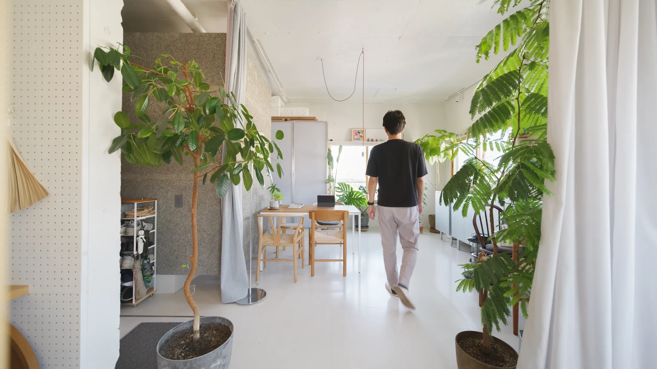 Now, the entrance to the home starts with a delightful visual surprise. The inside of the front door is painted a friendly pink, which is noteworthy as the rest of the home is defined by soft neutrals and greenery. “The door is painted pink with the idea of replicating the ‘Anywhere Door’ in the anime Doraemon,” Takato explains. “A door that leads you anywhere and gives you an exciting feeling of going on an adventure.” If Somosomo House is an adventure, then it’s a calm and serene ride.