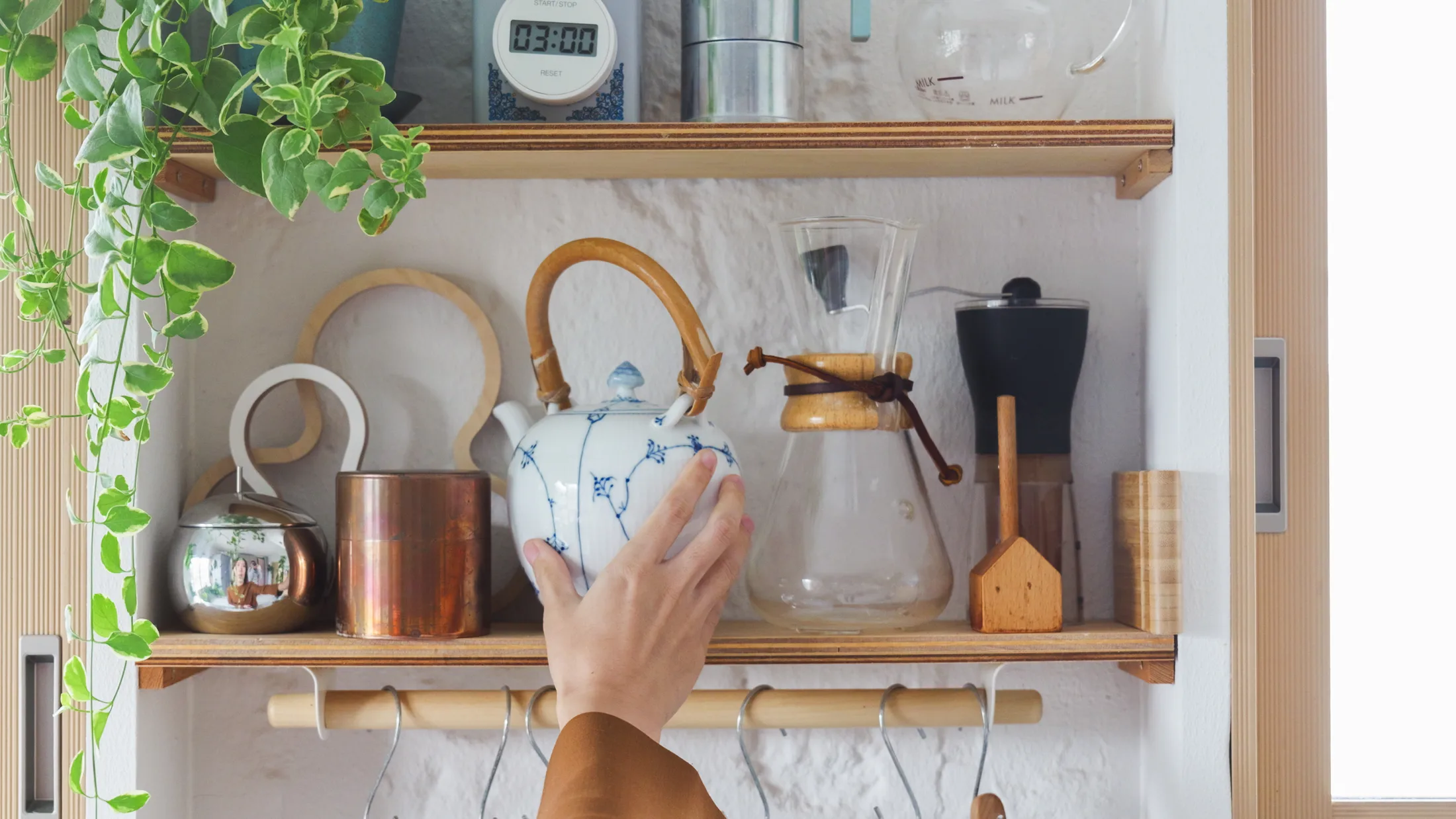 Tucked between the wardrobe and the wall, a compact study nook reveals the couple’s love of creating and problem-solving. They installed a pegboard wall above the desk for easy access to their tools. “Often people don’t like to see their tools,” Odaki says, “but as DIY is something we like to do, we use it as an opportunity to display them.” The same mix of practicality and detail continues in the kitchen. Takato and Odaki built a small rolling island in the same silver tones as the unit, using it to store the rice cooker and as a moveable workspace. “The trolley’s casters are transparent – I thought it would be less noticeable. I was quite particular about the design. It has a lock at the back so it doesn’t move even during earthquakes,” Odaki adds.