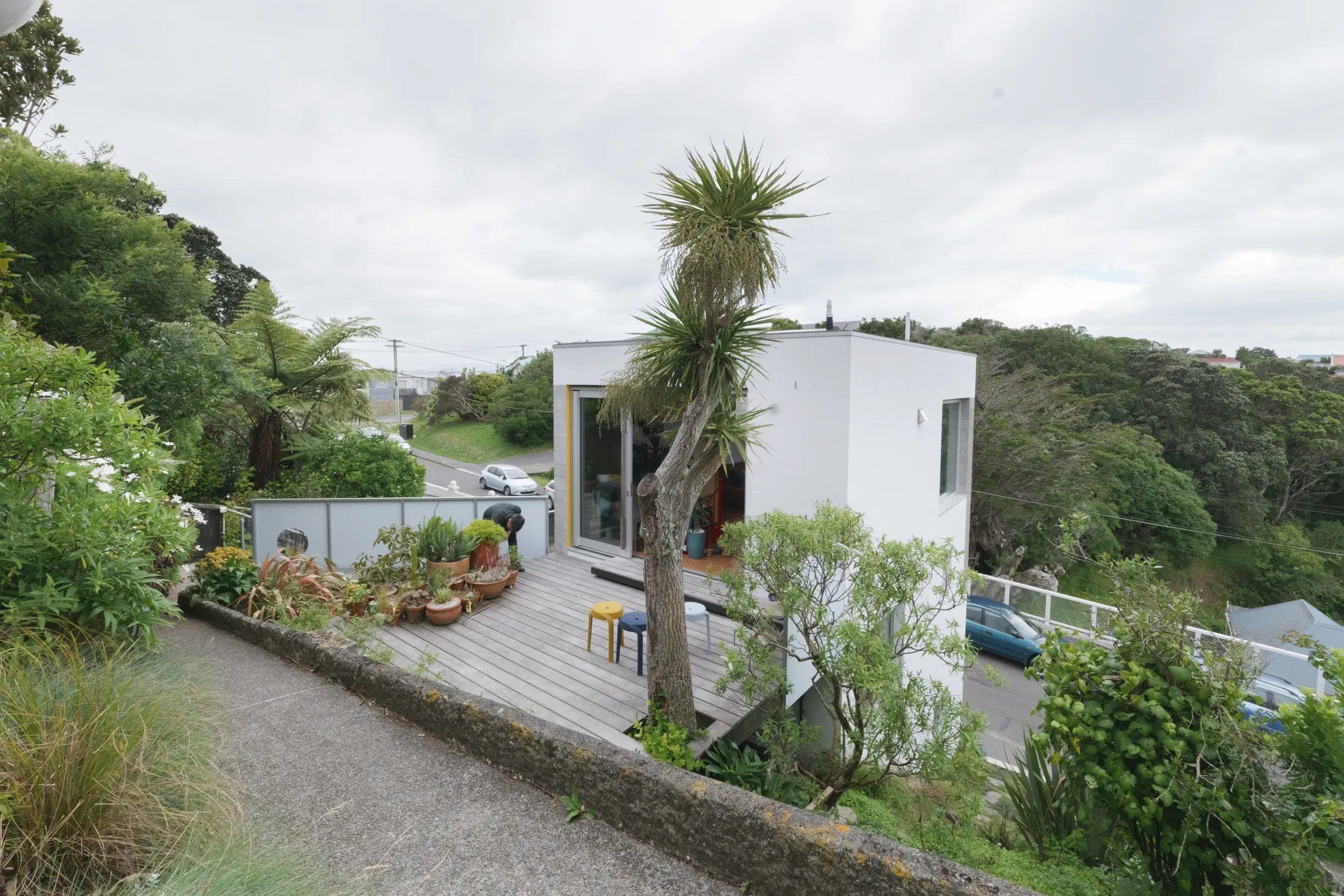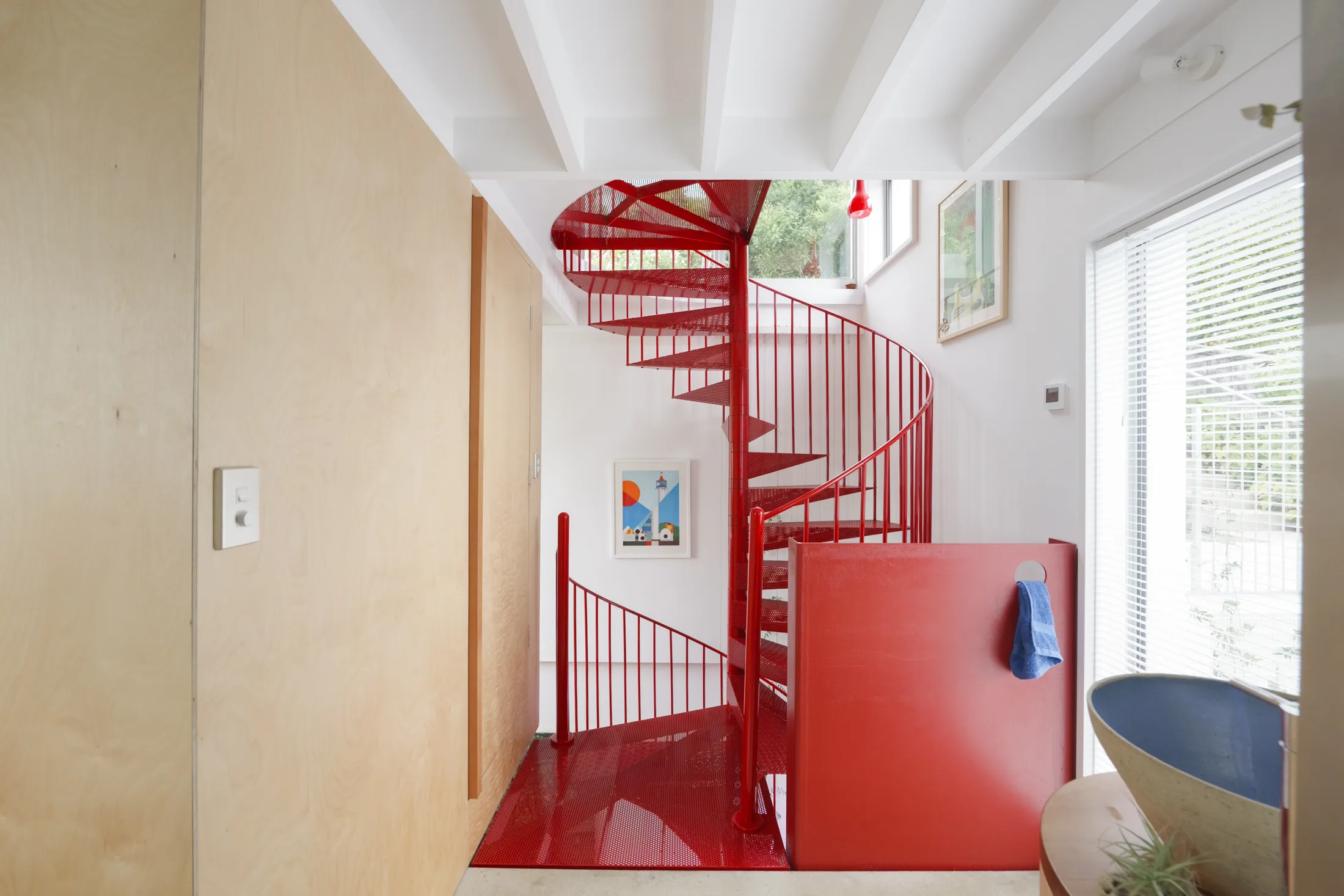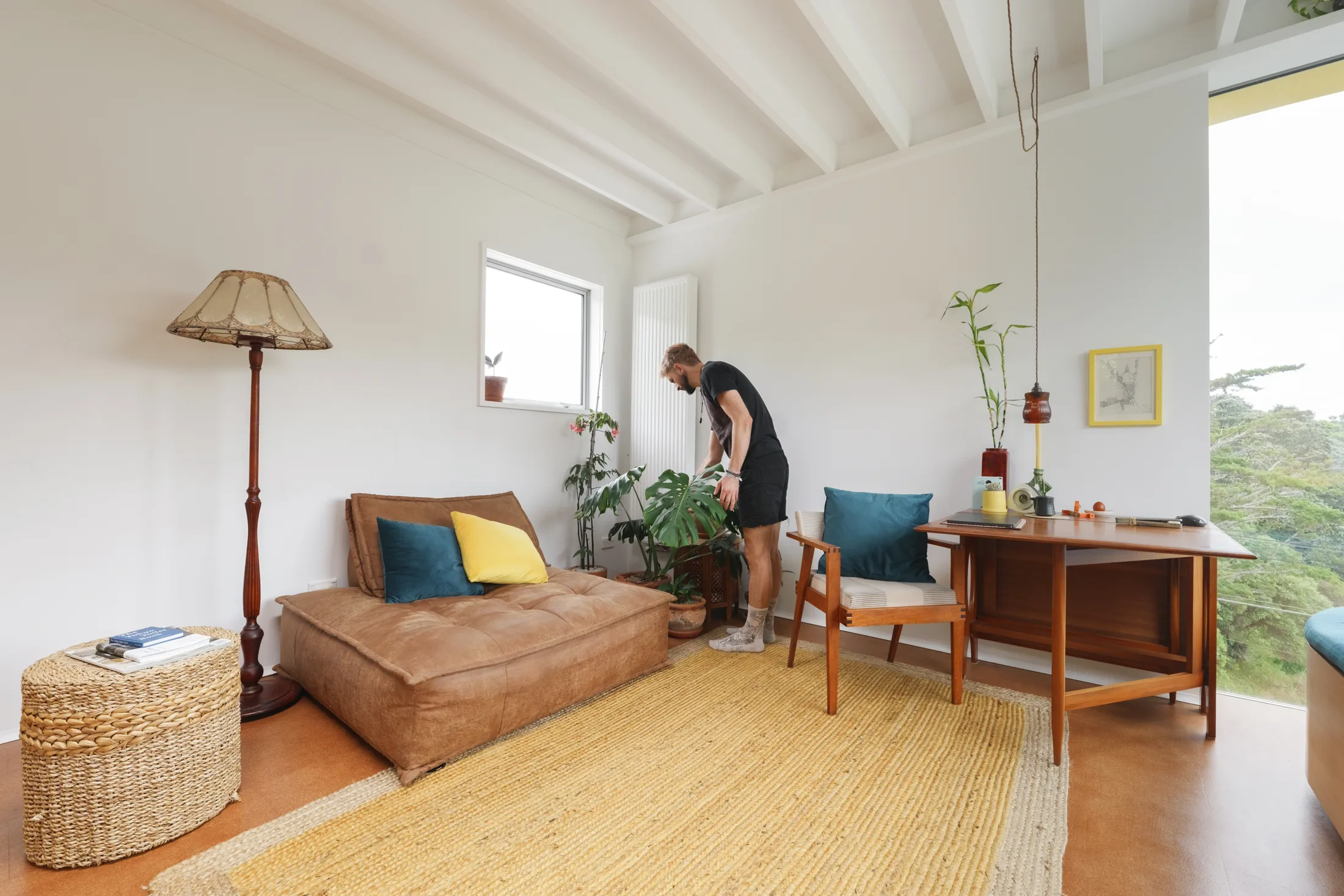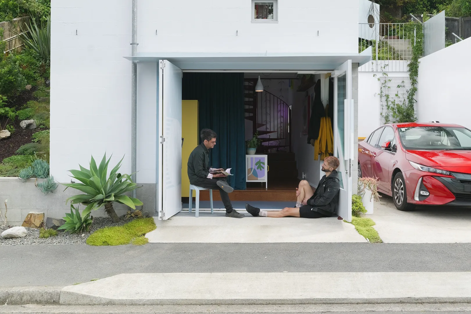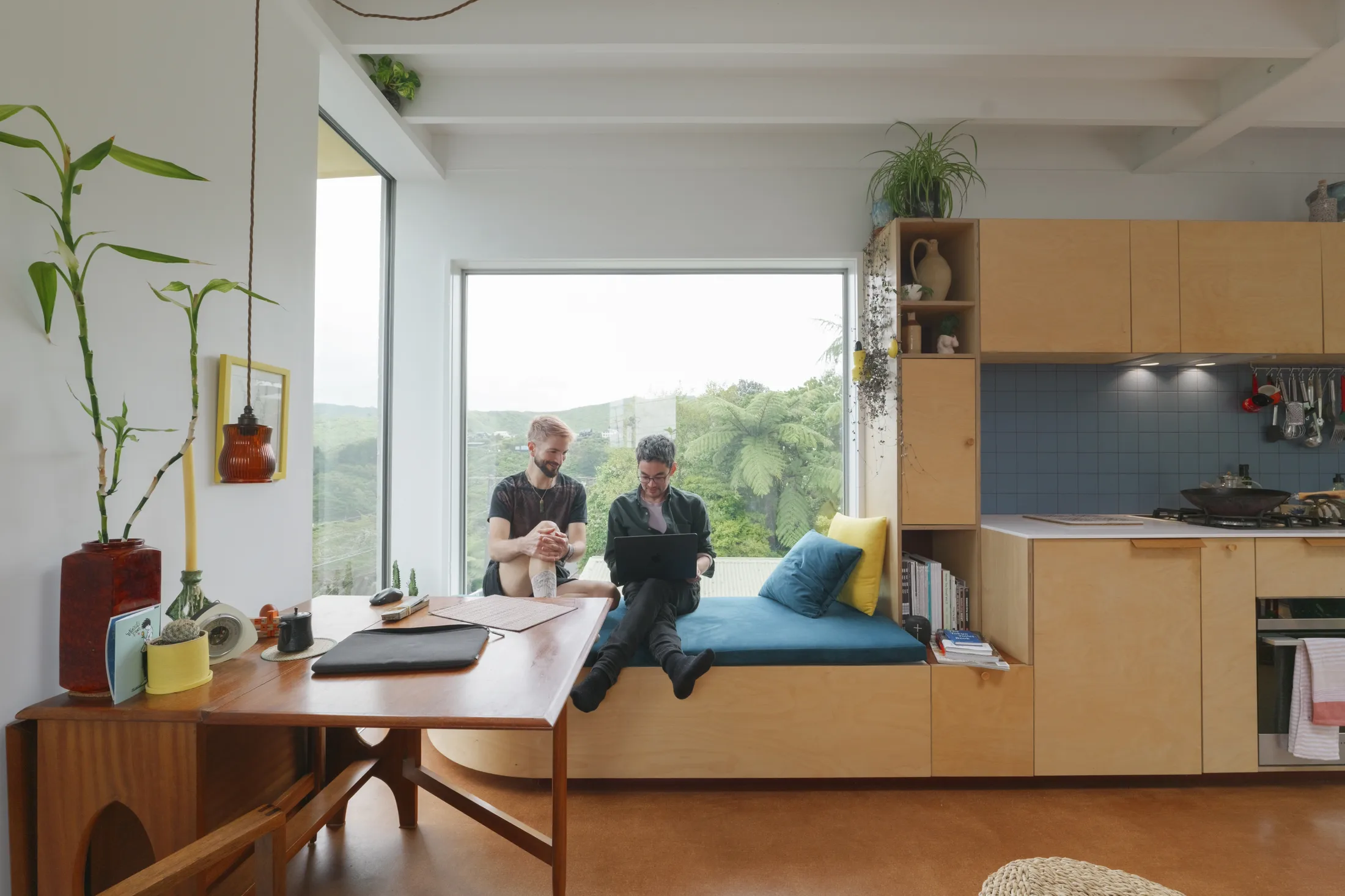 After a childhood spent spotting architect Roger Walker's turrets and shapes poking out of the Wellington hills with his dad, Micah wanted to bring the same sense of joy to their tower. Constructing his own version out of blockwork – "they're modular, go up quick, and are pretty cheap" – the facade was livened up with whimsically punched windows, including a deliberately tiny "joke window." Never missing an opportunity for play, even the sloping land to the side of the house found a second life as a "Kiwi fairy garden."