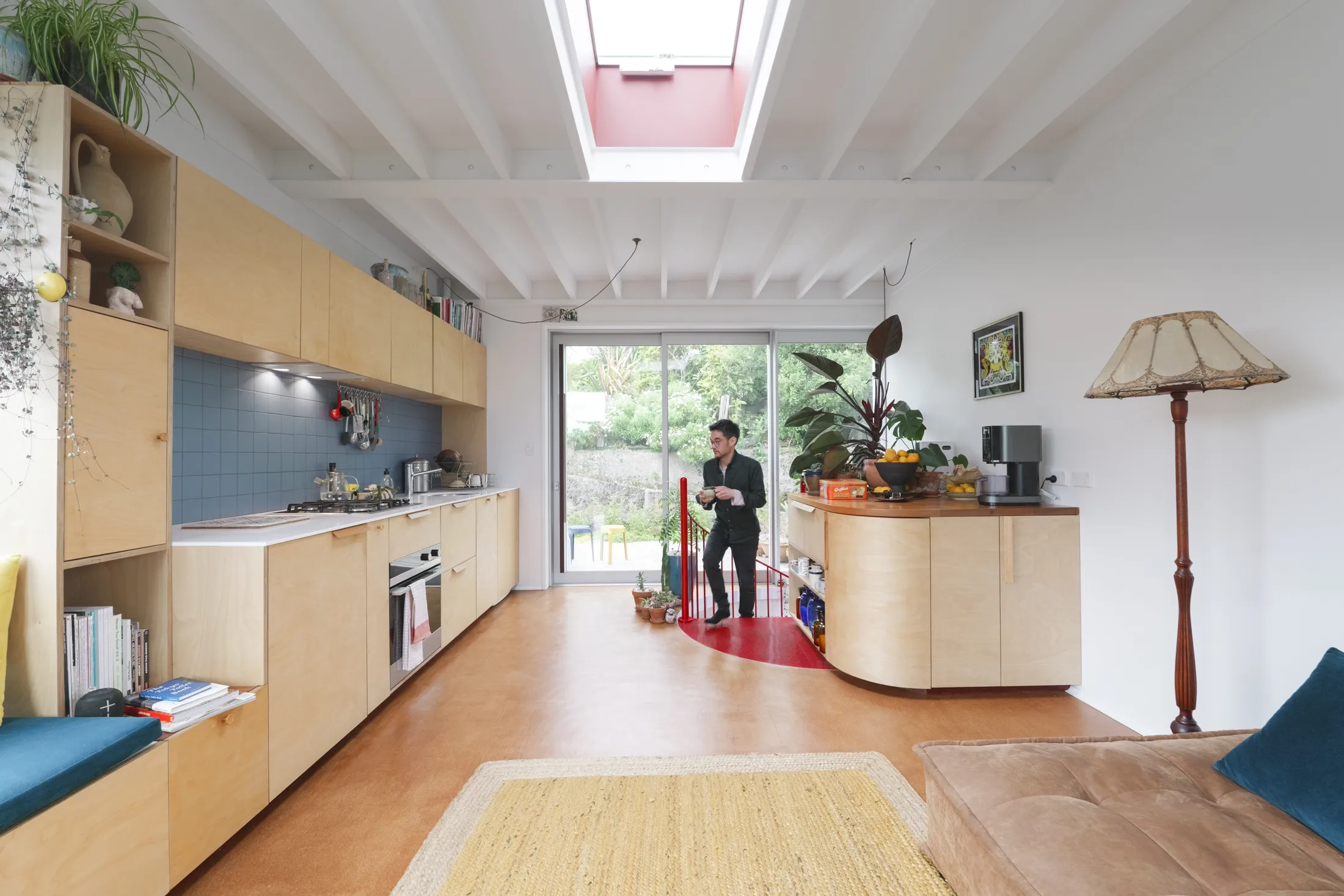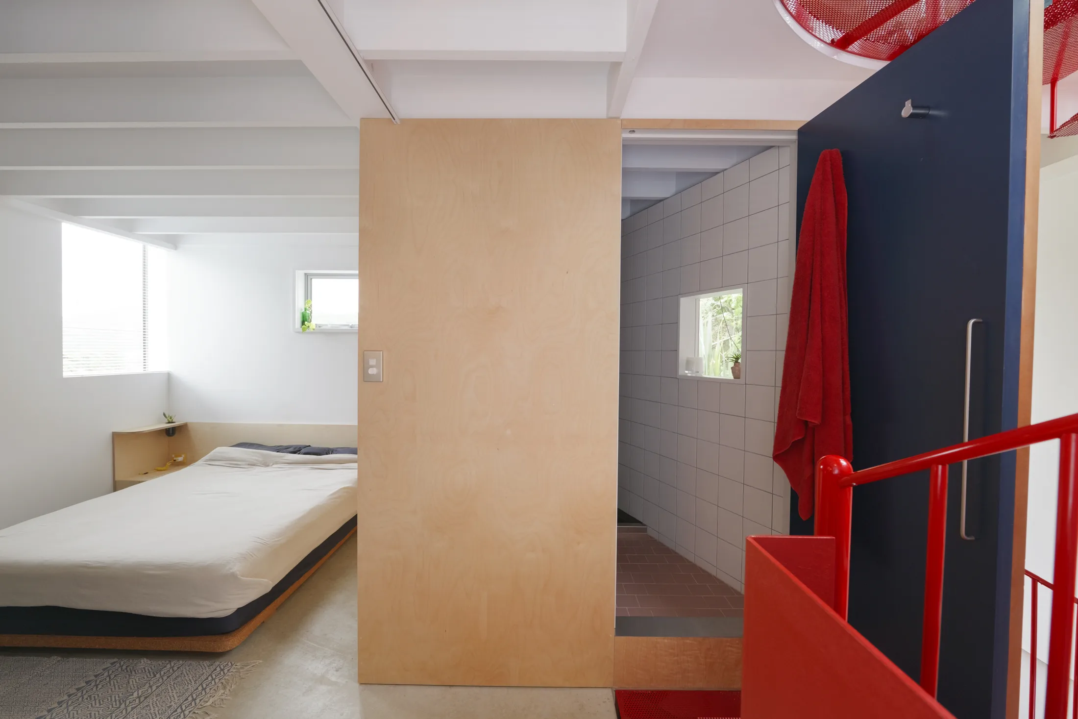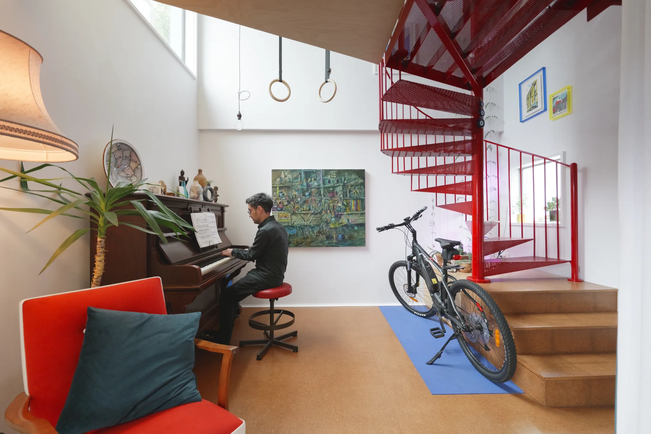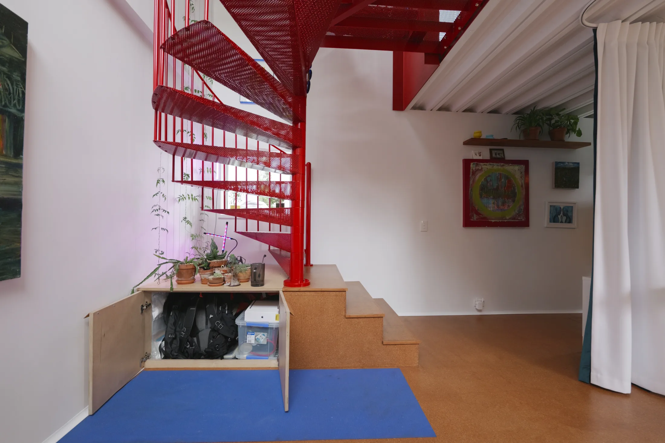 The double bifold garage doors were a council requirement – the home had to provide two car parks. But instead of sacrificing a third of the house to a vehicle, Micah designed the entire ground floor to fit a car – though it never has. Instead, the garage opens into a flexible Genkan-style entrance, with a spot to hang keys, and even a trampoline. Underfoot, a floating floor (that can be removed, say, for a car) is laid with cork and provides discreet shoe storage as well as insulation. Behind the bordering blue curtain is Ivan's hair salon, and behind another curtain, the laundry – complete with a laundry chute from the bedroom above. When guests stay, the salon equipment is wheeled aside, and an inflatable mattress turns the space into a private room.