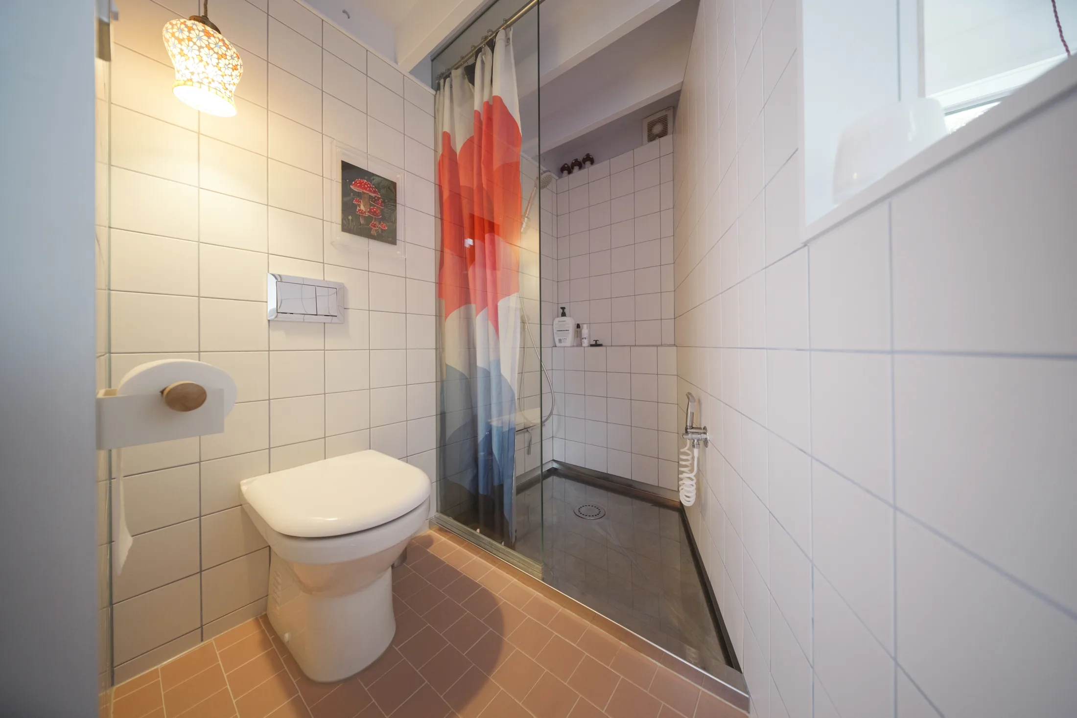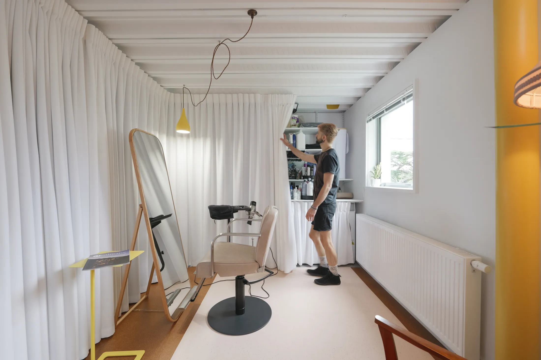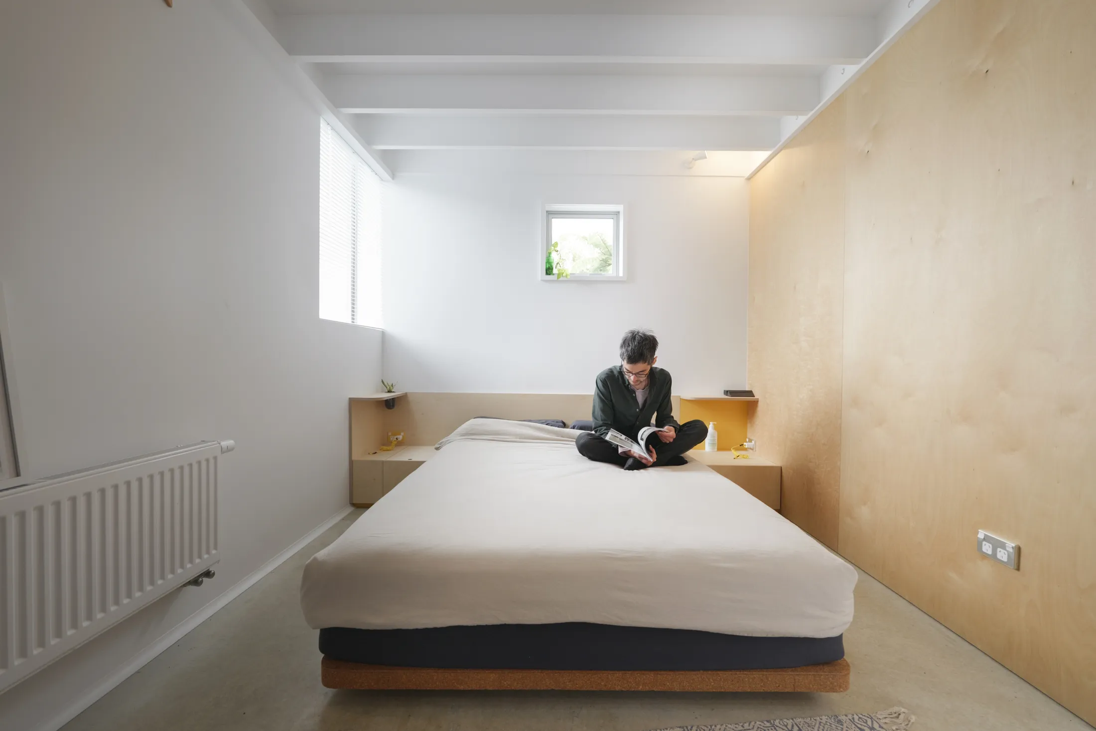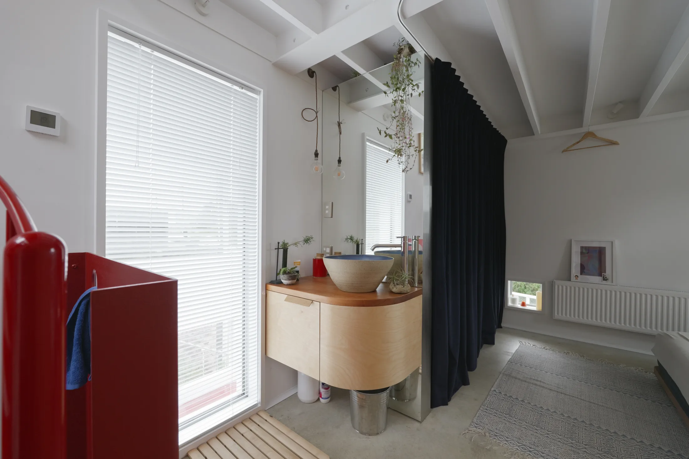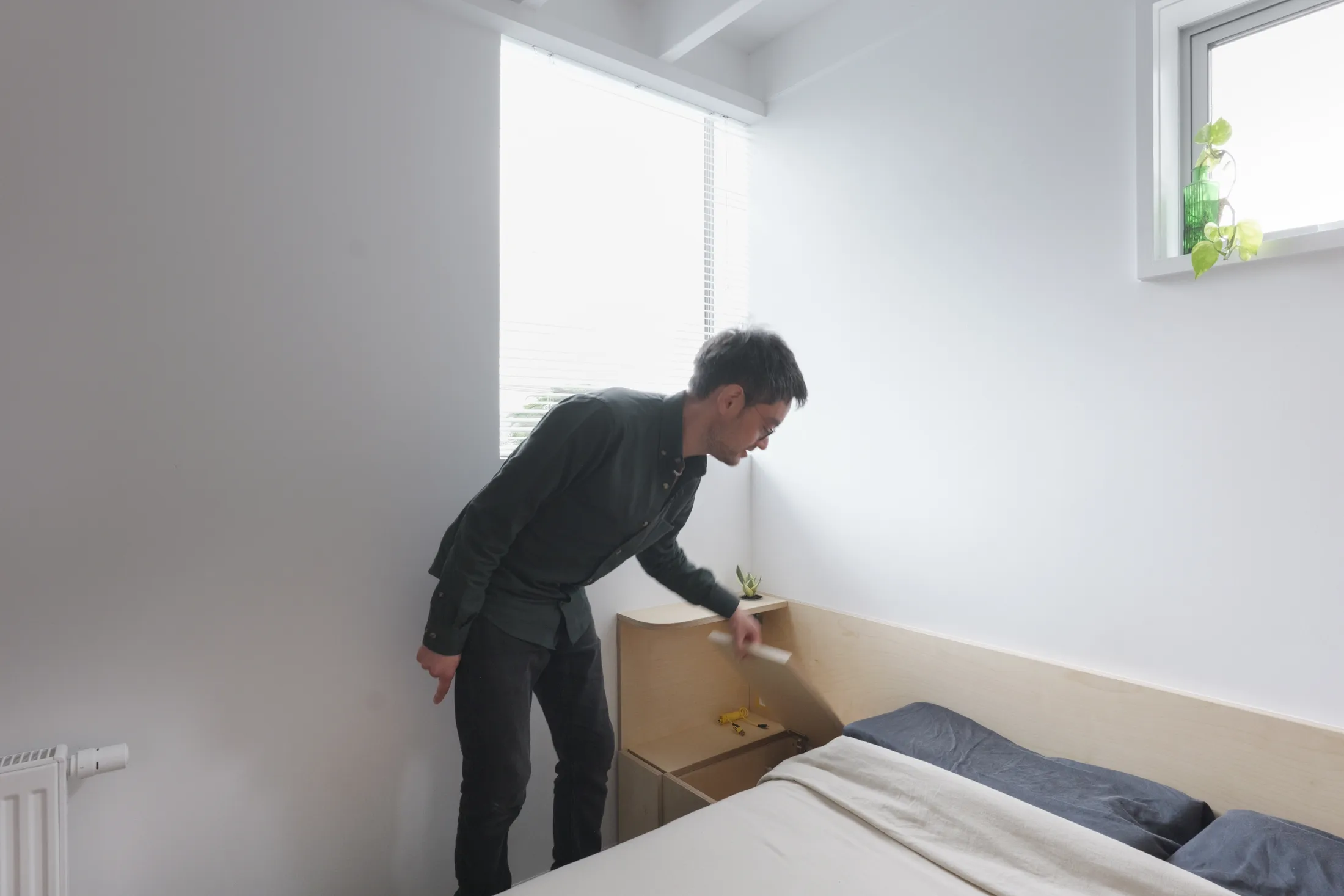 The double bifold garage doors were a council requirement – the home had to provide two car parks. But instead of sacrificing a third of the house to a vehicle, Micah designed the entire ground floor to fit a car – though it never has. Instead, the garage opens into a flexible Genkan-style entrance, with a spot to hang keys, and even a trampoline. Underfoot, a floating floor (that can be removed, say, for a car) is laid with cork and provides discreet shoe storage as well as insulation. Behind the bordering blue curtain is Ivan's hair salon, and behind another curtain, the laundry – complete with a laundry chute from the bedroom above. When guests stay, the salon equipment is wheeled aside, and an inflatable mattress turns the space into a private room.