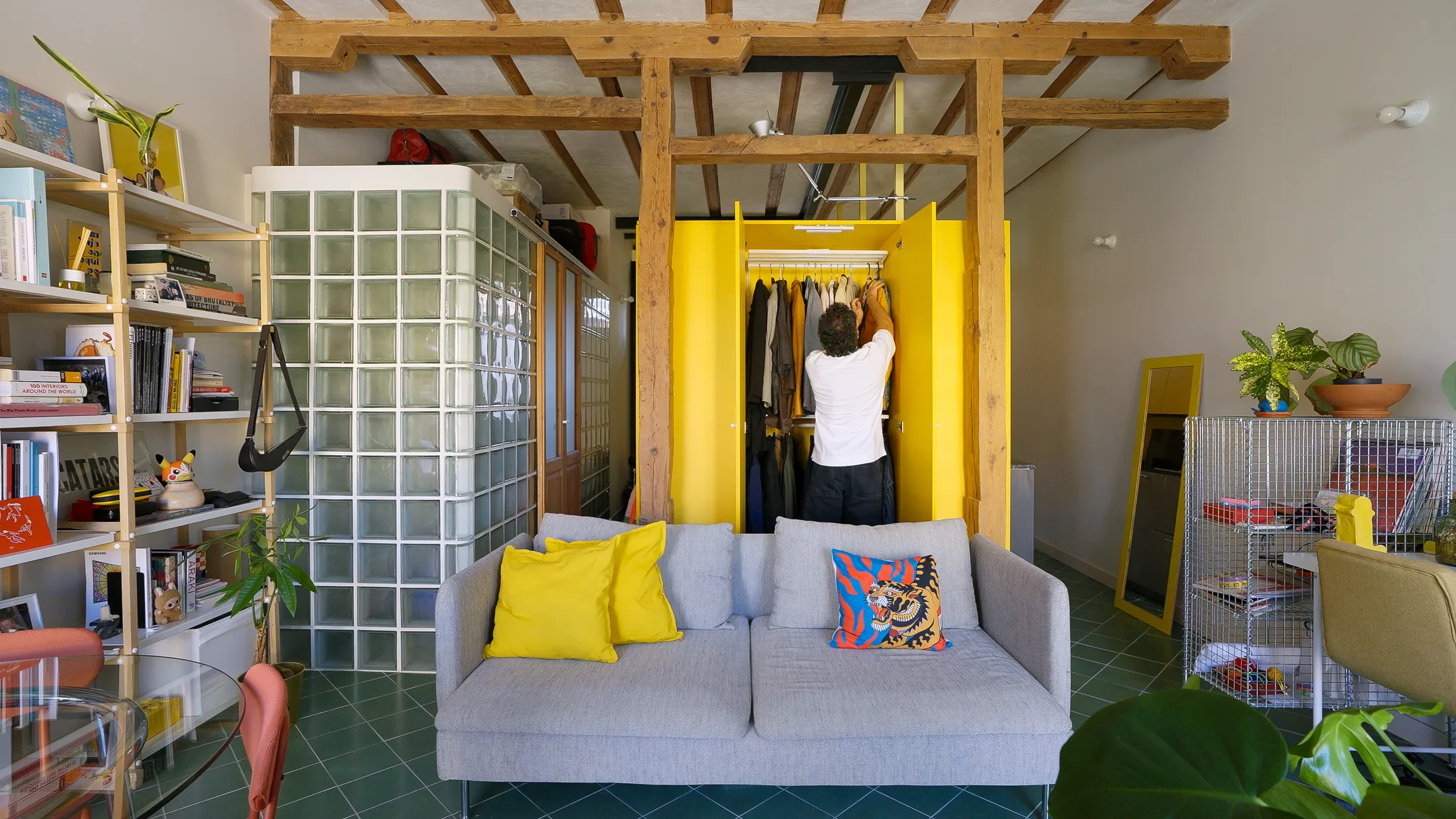 In practice this was achieved by two new pieces: a bold yellow unit that wraps through the space with the kitchen on one side and wardrobes on the others, and a glass-block volume that encloses the bathroom. This glass-block also allows daylight to pass through and at night glows like a lantern into the living room. Antequera elaborates: “I don't like direct light, I find it very uncomfortable, so in my projects I always try to create this kind of ambient or indirect lighting.” By stopping short of the ceiling, both units keep the apartment feeling open, create extra storage above, and clearly define its functions.