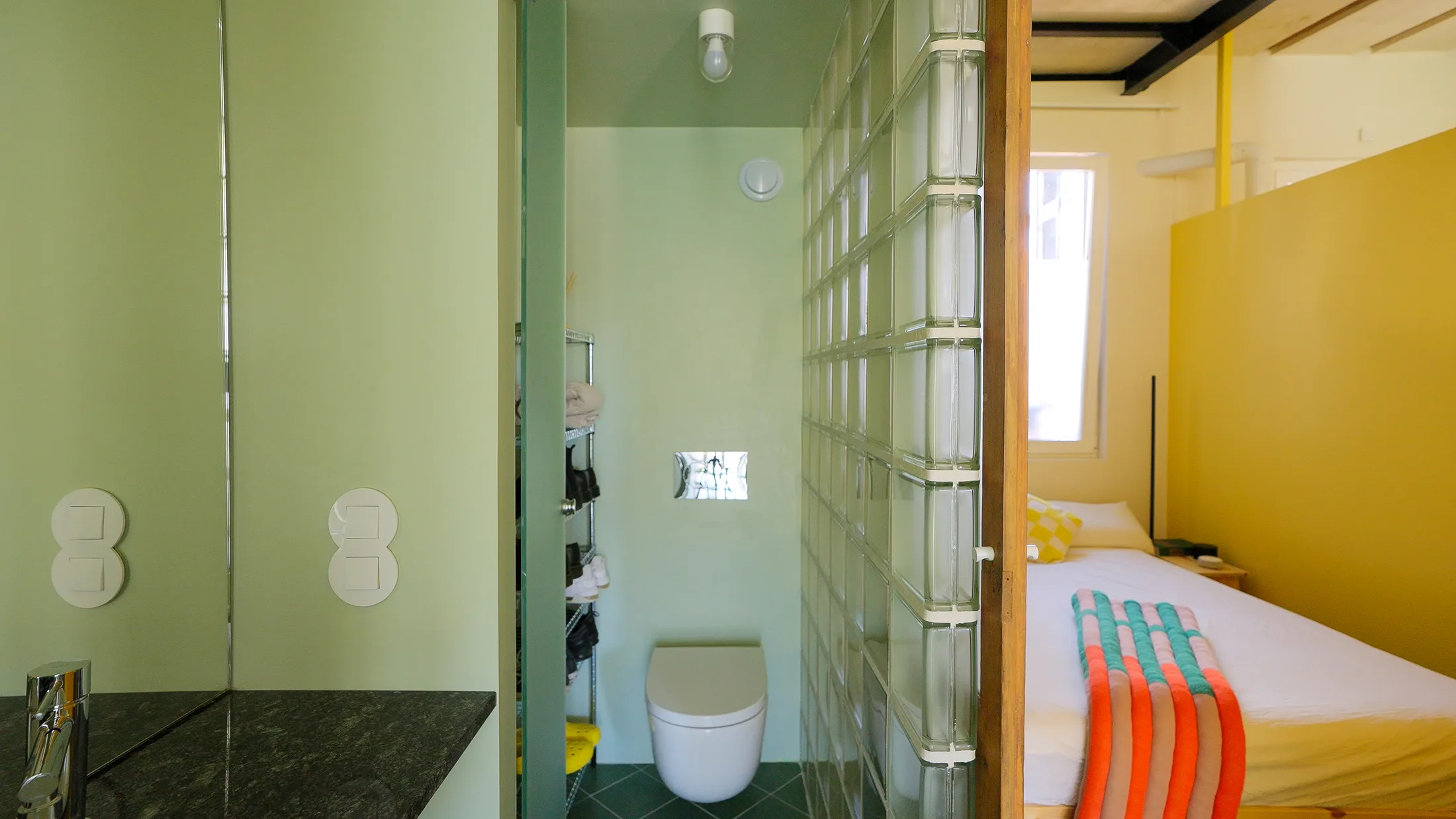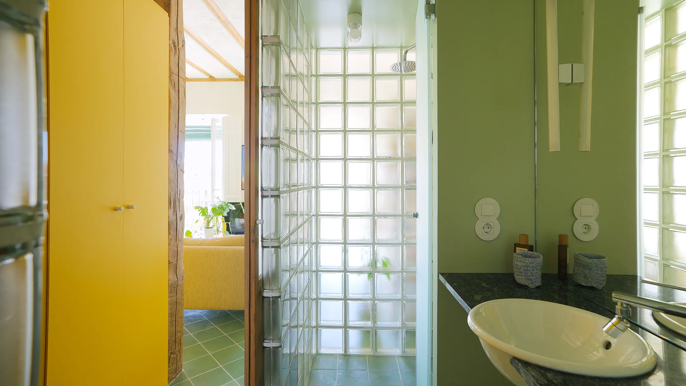 The apartment as a whole is a home of subtle contrasts between old and new, . The bright yellow unit (an IKEA hack) is set against the restored green hydraulic tiled flooring which is typical of corrala buildings. Black granite worktops anchor both the kitchen and the bathroom, balancing the illumination of the glass-block bathroom volume. And restored doors salvaged from the apartment now slide open to the bathroom, where their history is offset by the no-nonsense practicality of a stainless steel IKEA shelving unit for shoes and cleaning supplies. Antequera has chosen design points that emphasise the corrala’s 19th-century character, while also highlighting the clean lines and contemporary materials introduced in the renovation.