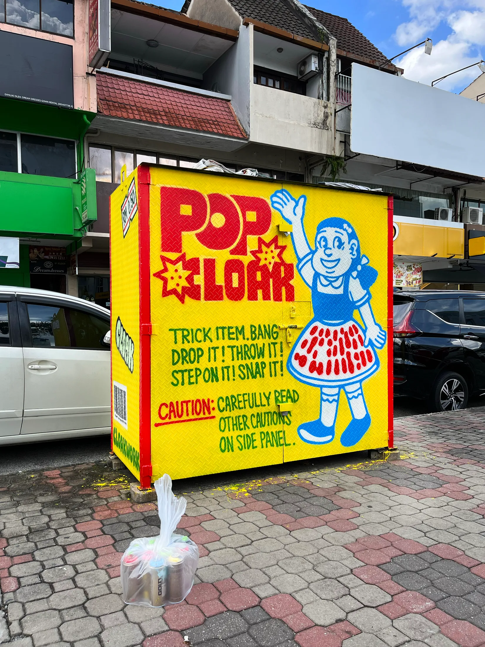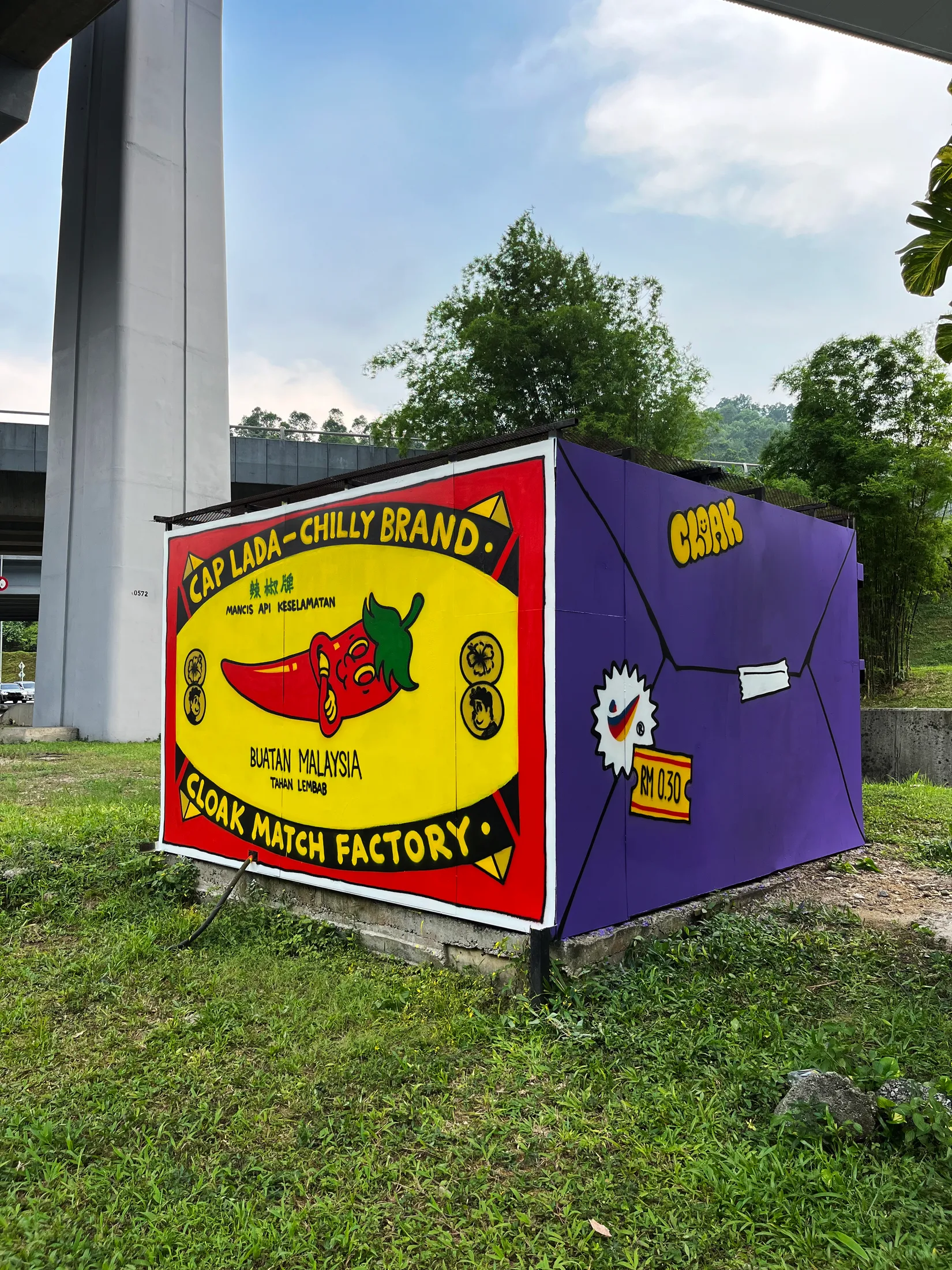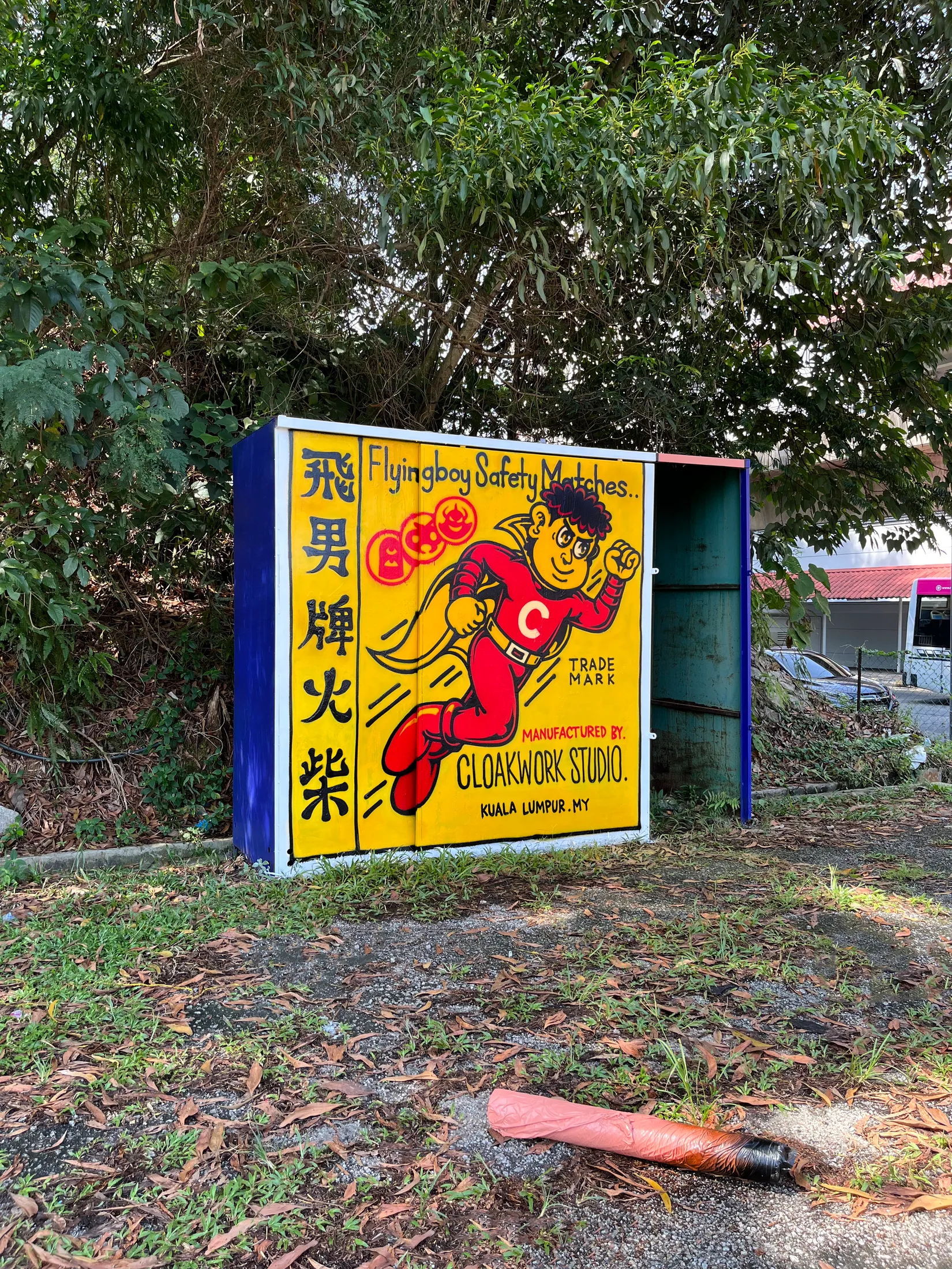 Chern’s work is instantly recognisable: playful, character-driven, and steeped in a distinctly Malaysian sense of humour. From a disused shed transformed into a giant vintage safety matchbox to a nostalgic rendering of an old-school kopitiam-style cafe to a cheeky parody of everyday brands and icons, his art channels the textures and quirks of local life. He blends graffiti with graphic design and storytelling, inserting cartoon-like characters into surreal, scene-setting environments. But his murals do more than brighten walls, they tell stories that resonate with passersby, drawing on childhood memories, pop culture and the rhythms of urban Malaysia. There’s an unmistakable affection in his work – for nasi lemak packets, tin toy boxes, old-school logos – that evokes the warmth and wit of shared cultural memory.