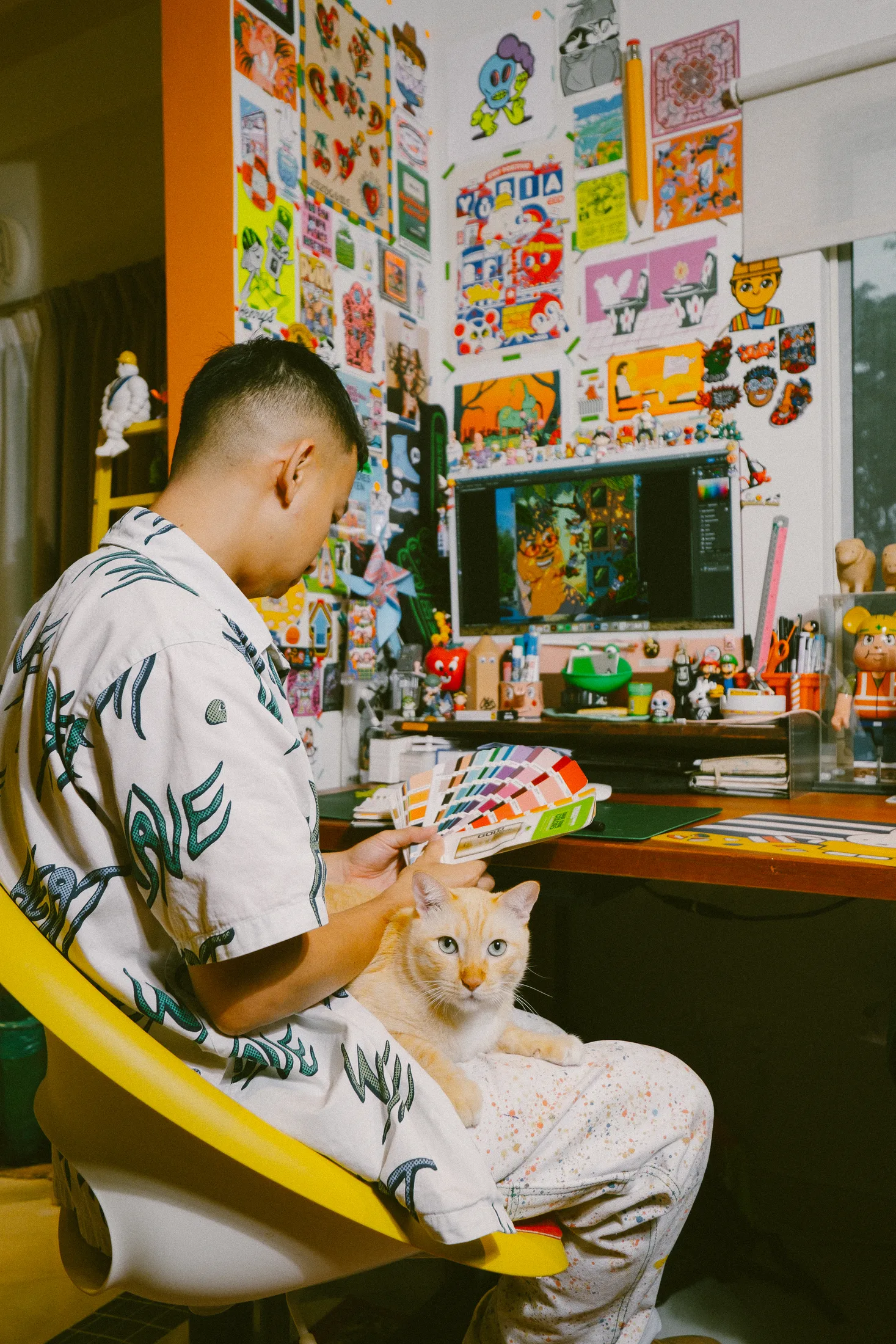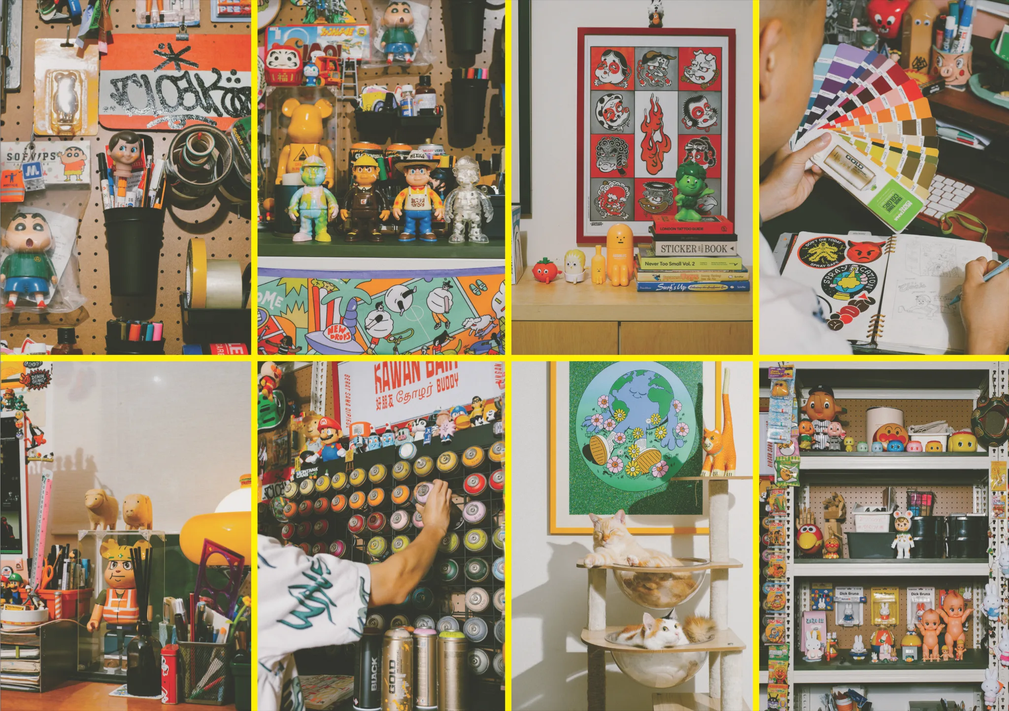 Born and raised in KL, Chern grew up in a city that always felt like it was in motion. “It makes me restless too,” he laughs. “It pushes me to create.” As a student commuting daily by train, he passed graffiti-covered riverbanks that doubled as jam spaces for artists from around the world. “There were new masterpieces every day. I was fascinated.” His entry into graffiti was instinctive: more drawn to images than words, he pursued a degree in illustration and painted his first tag, “Chern,” on a grey wall in KL using unsold spray cans from his father’s hardware shop.