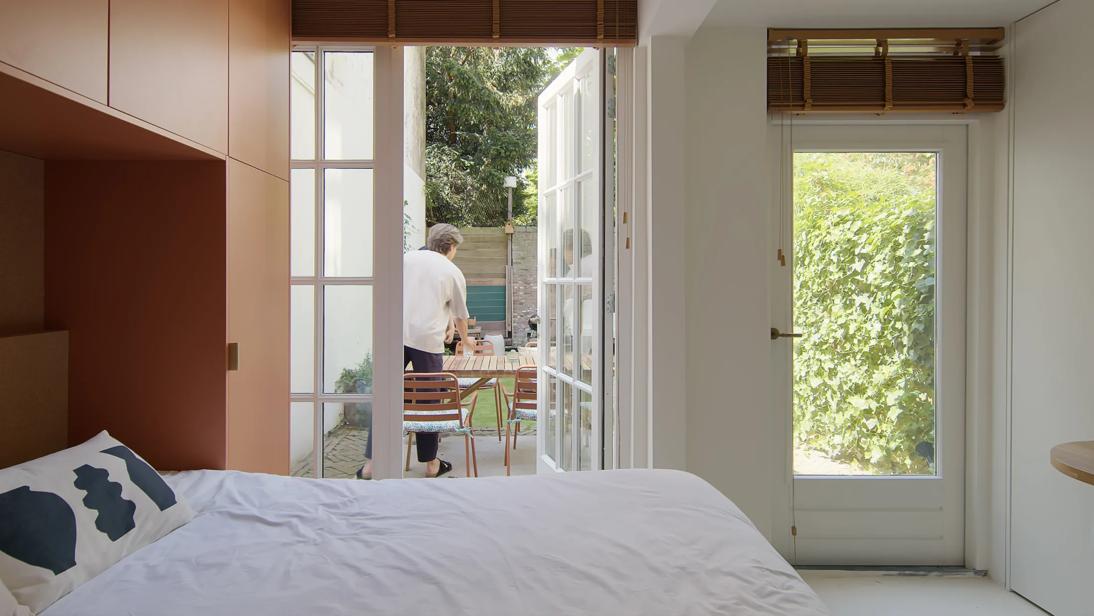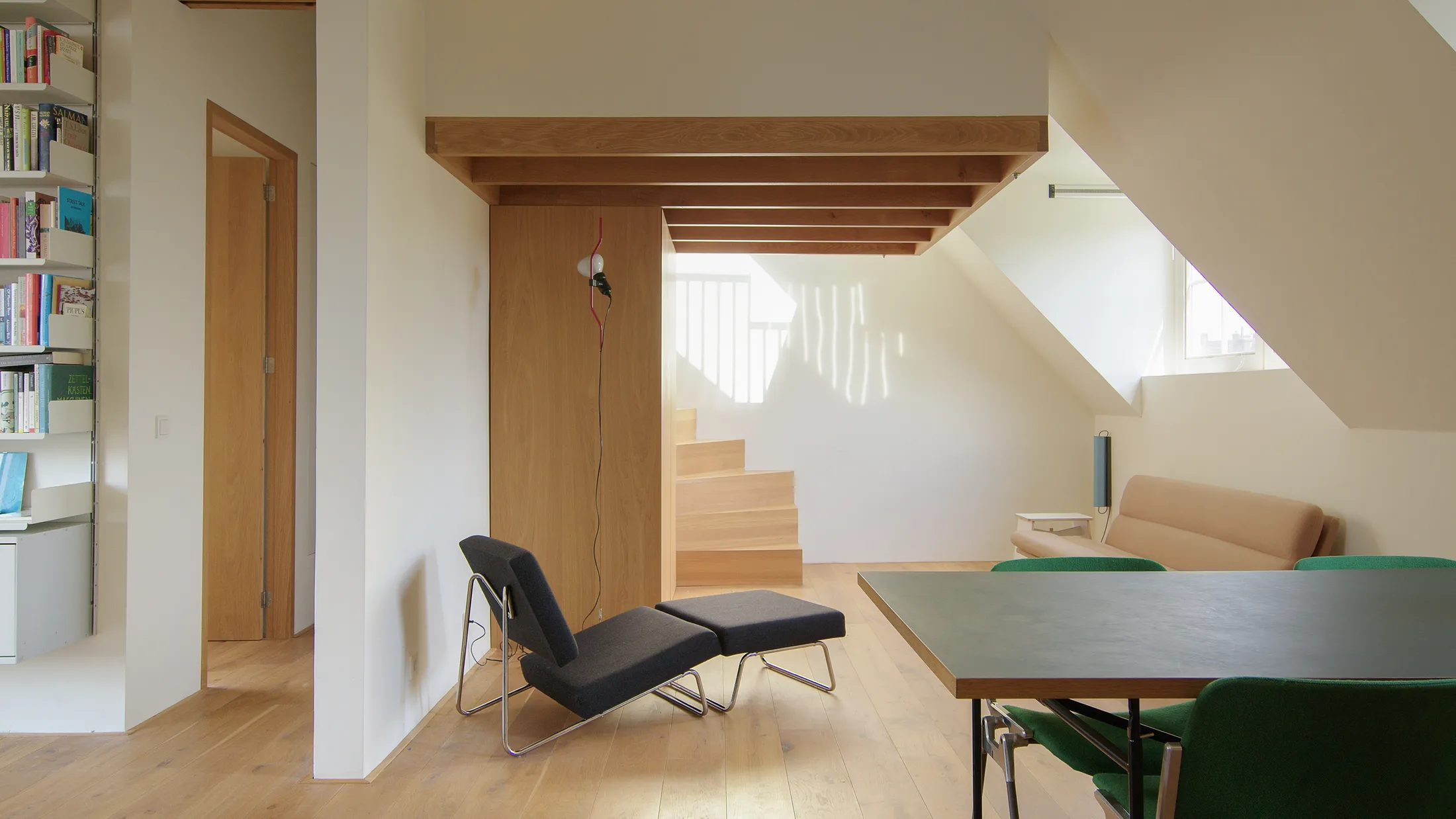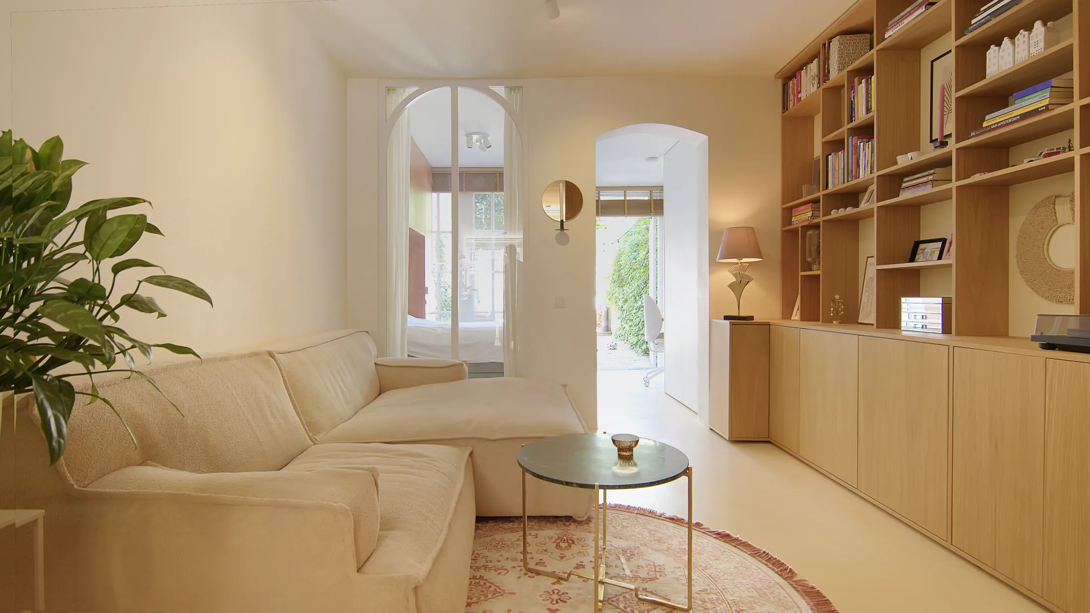 Designer and carpenter Marijn Kruikemeier took a once-empty shell in Amsterdam’s Jordaan and turned it into an elegant yet casual ground-floor home. Working within the constraints of a long, narrow plan in a 1905 social housing building, Kruikemeier and his partner Liya Yang built the apartment around a central, custom-built oak unit. The unit houses the bathroom, kitchen appliances, and technical systems, dividing the space without enclosing it. The result is a series of generous-feeling rooms that flow from the street-facing dining area to the kitchen, living space, and bedroom, with light entering from both ends. This sense of generosity is reinforced by the choice of full-size furniture, a long galley kitchen designed for cooking and entertaining, and a bedroom that opens directly onto a private garden at the rear.