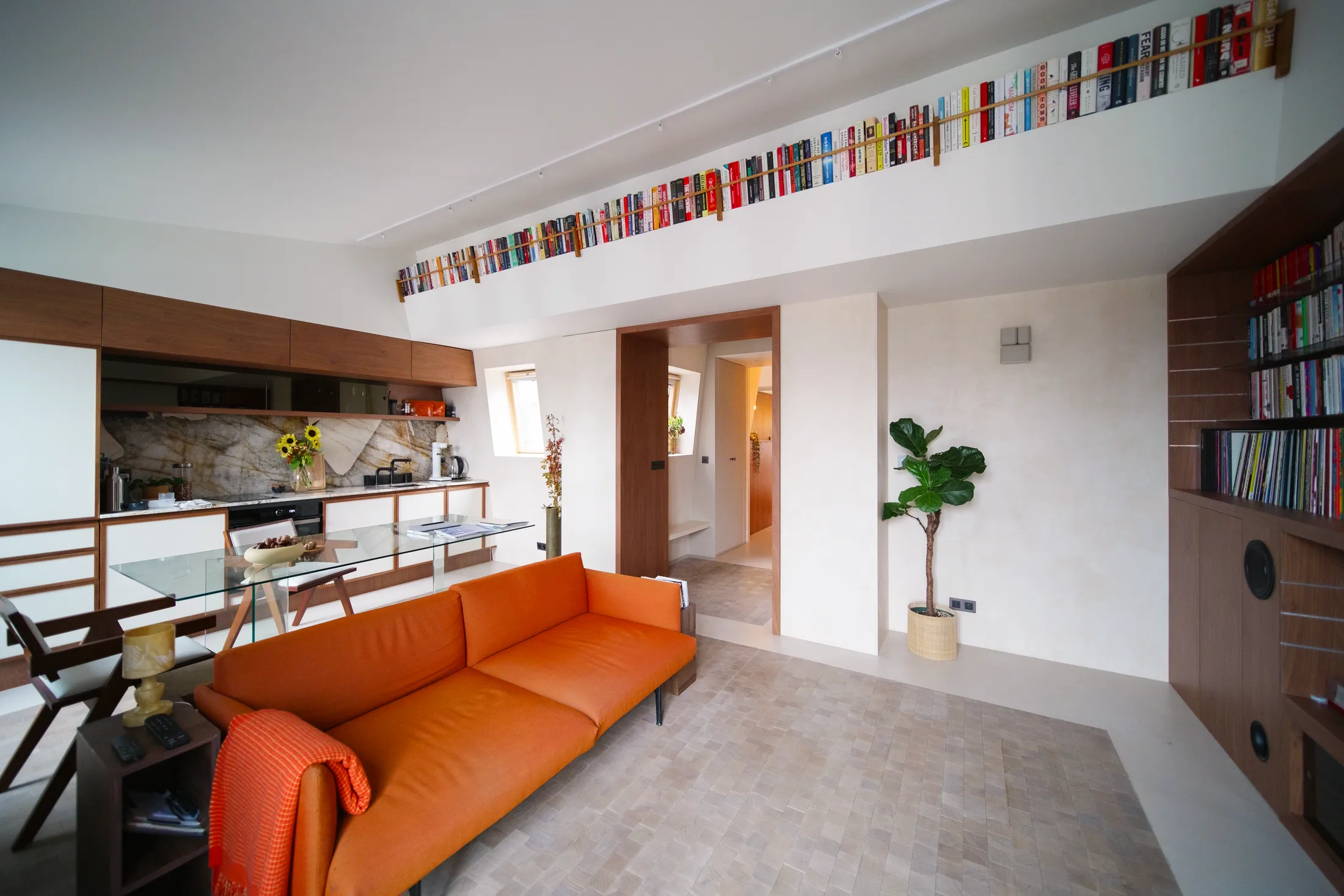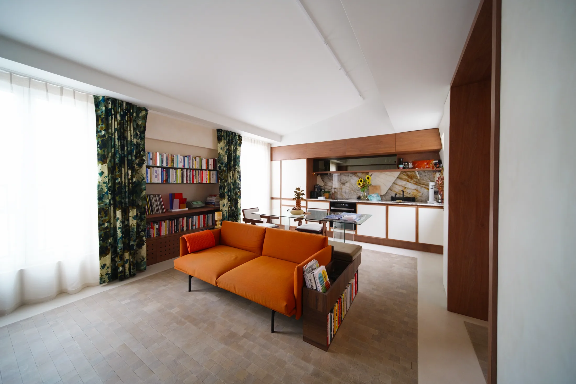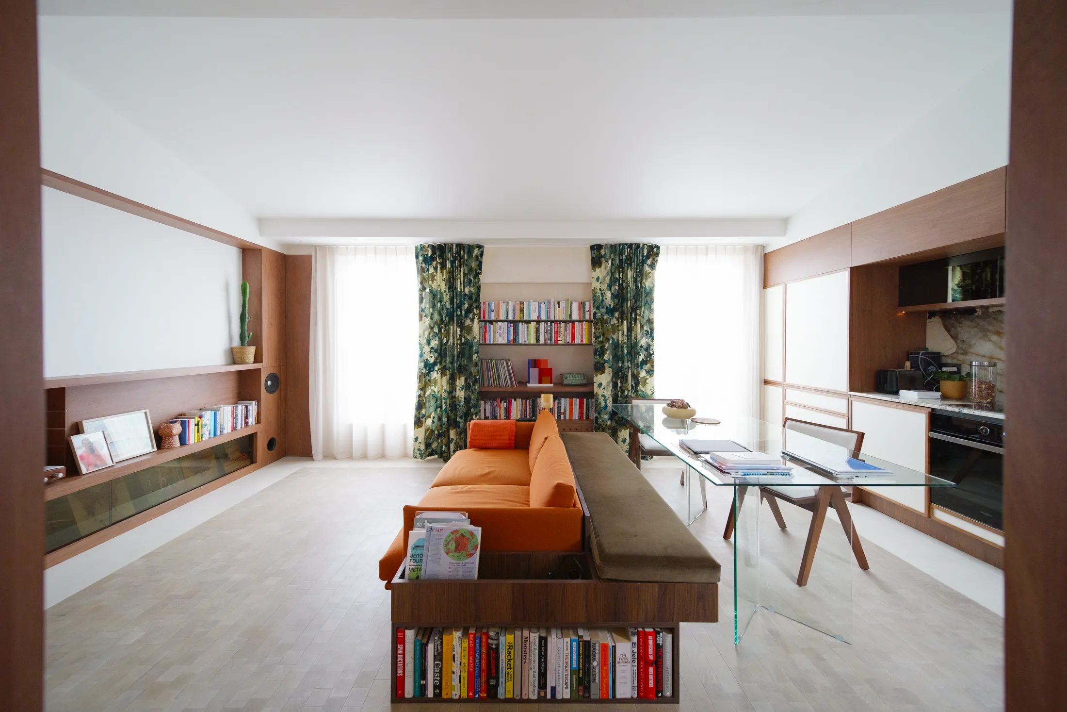 The piece extends toward the dining area, where it becomes a built-in bench, reducing the need for extra dining chairs and keeping the space visually light. At the same time, the sofa’s shelving integrates storage for books and objects, anchoring the living zone while maintaining openness.