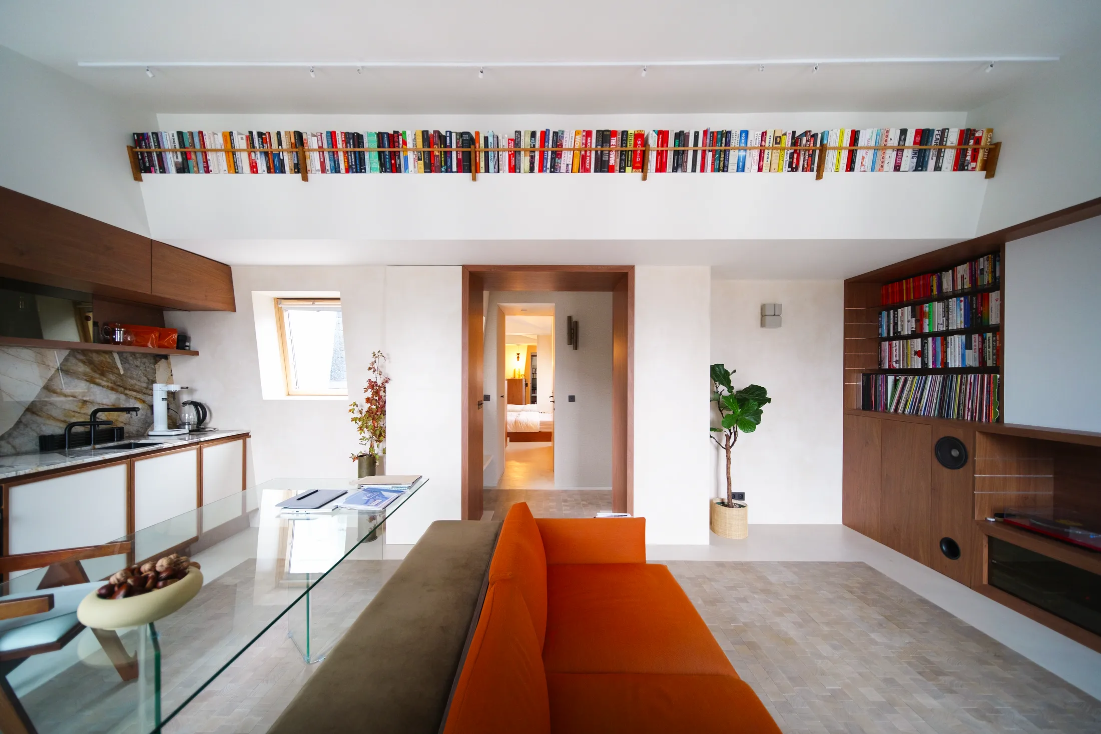 It’s a clever example of how a single piece of furniture can do the work of multiple elements — creating structure, storage and seating without clutter. On tighter budgets, a similar effect can be achieved by arranging off-the-shelf furniture in a continuous line, using alignment rather than construction to define zones.