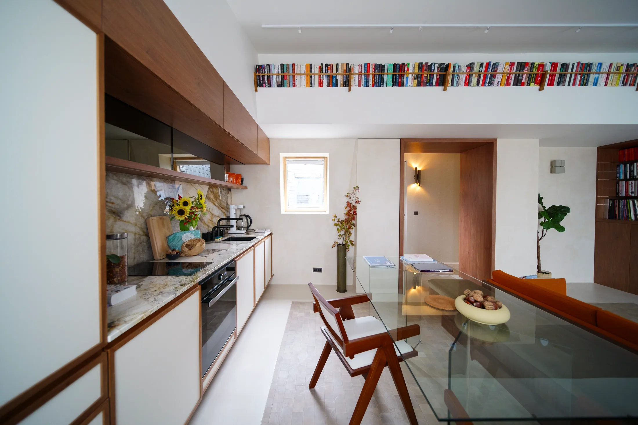 In a compact open-plan space, separating living and dining areas without adding walls can be a challenge. Here, a bespoke furniture piece wraps around the sofa, combining bookshelf, side table and bench seating in a singular piece of furniture.