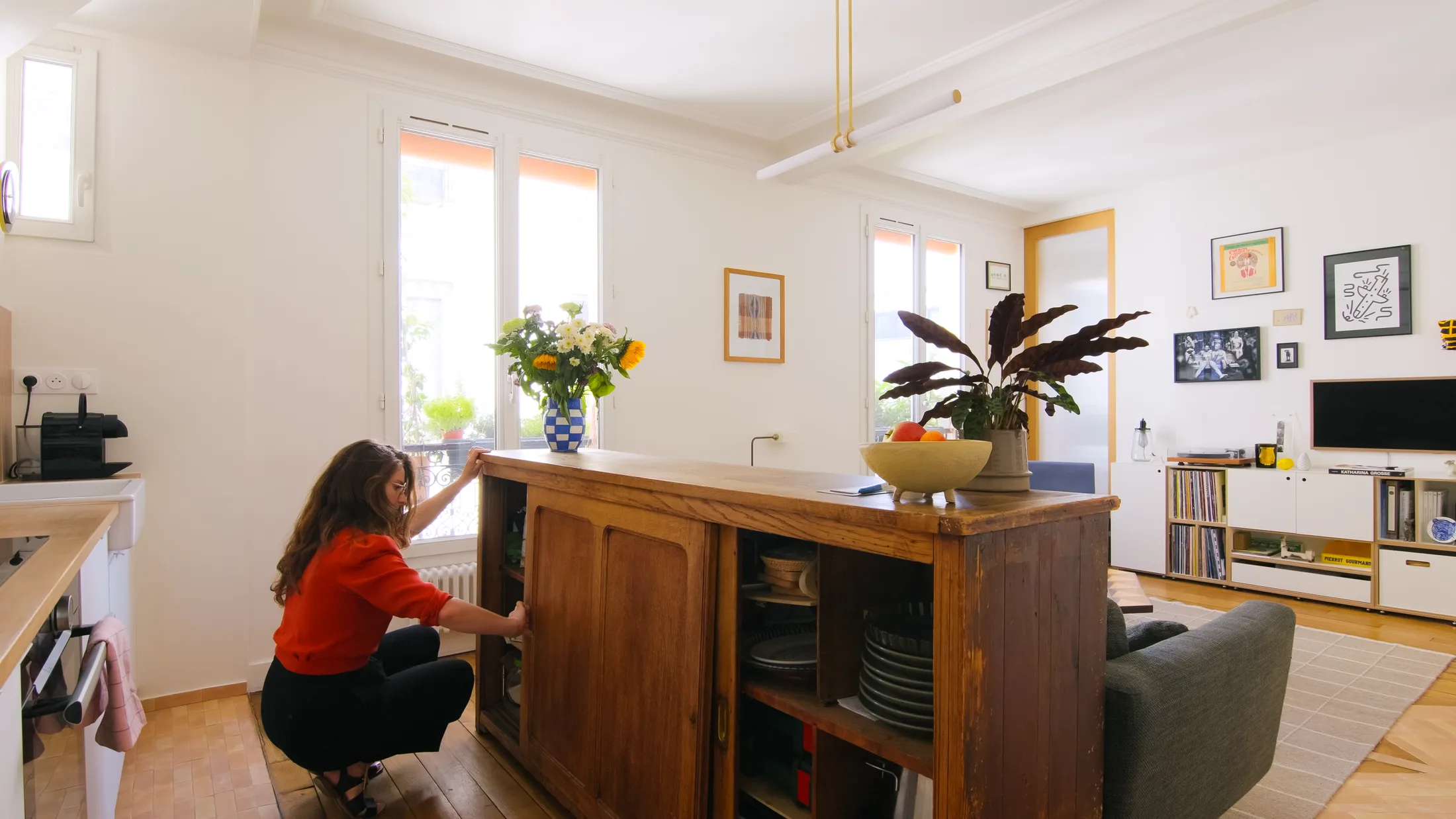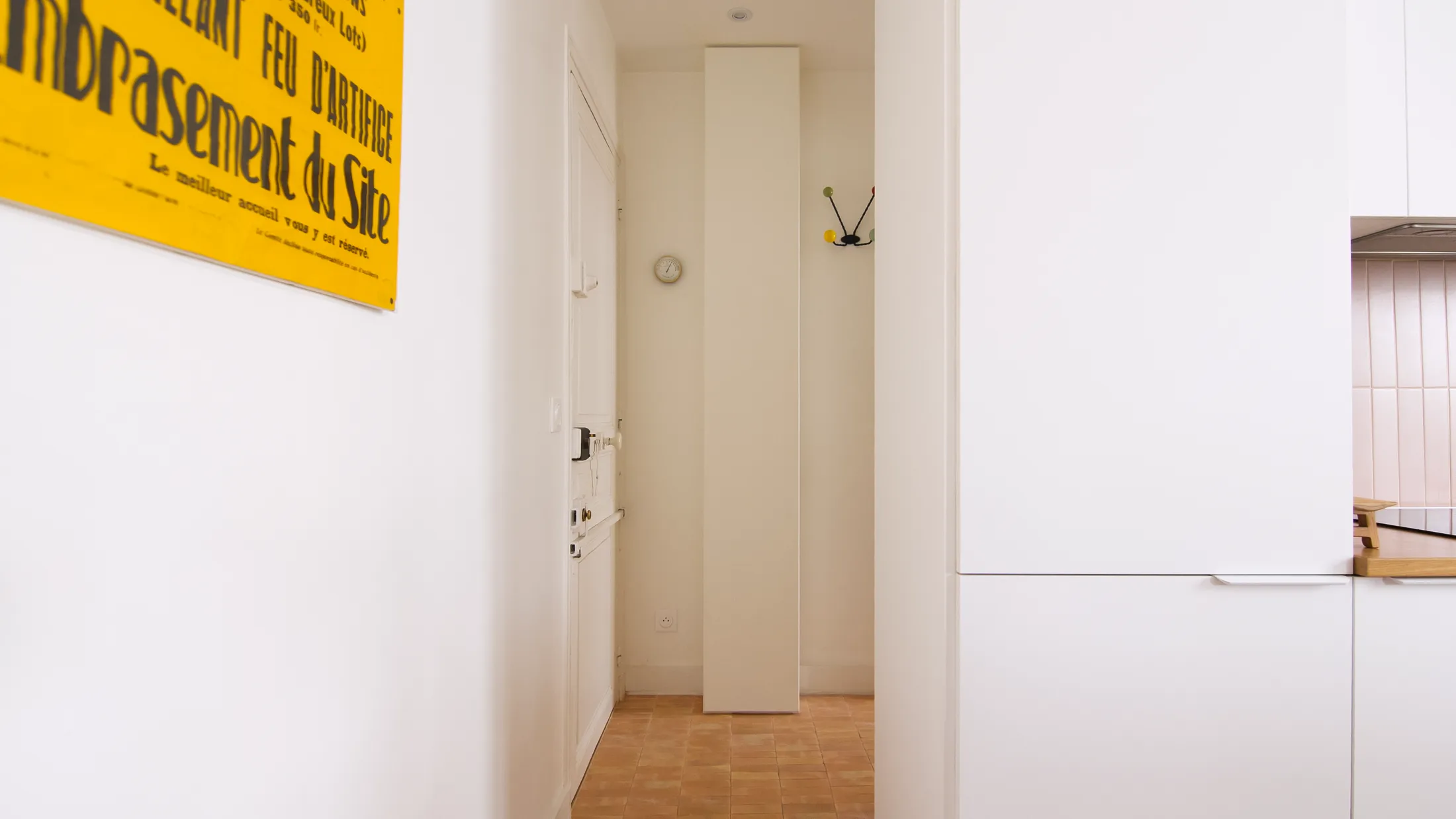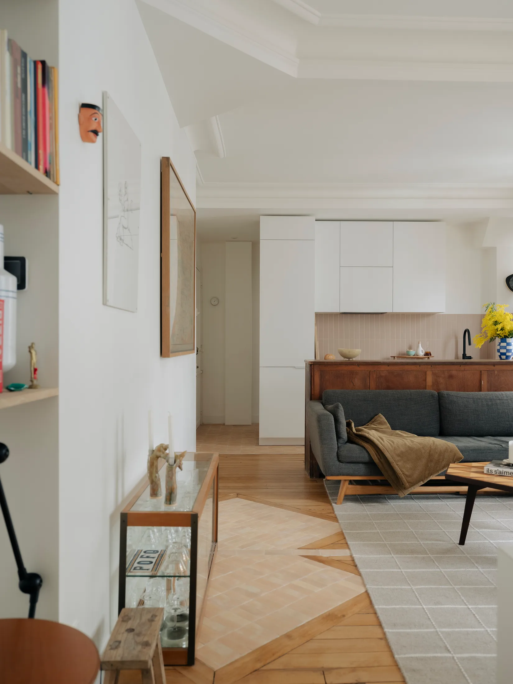 Having rented the apartment for 20 years before buying it, the owners knew exactly what didn’t work for them: small, enclosed rooms, poor flow and a layout that hid the apartment’s full 12-metre length. Maison Insula’s renovation strips the space back to its essentials, removes partitions and reorganises the spaces and their functions around a single central wall.