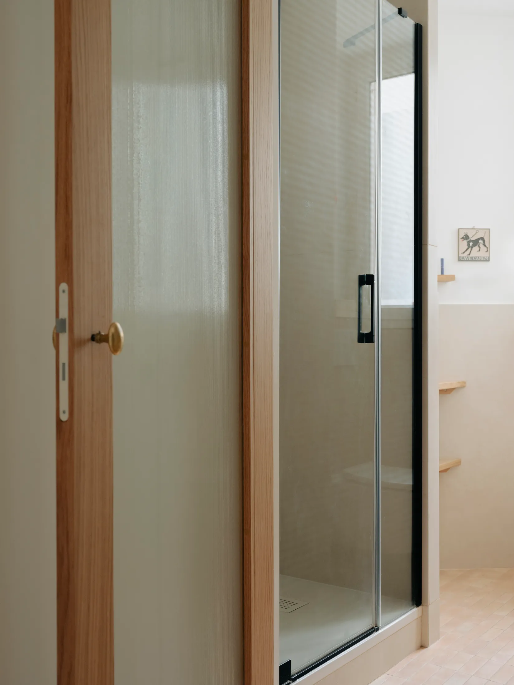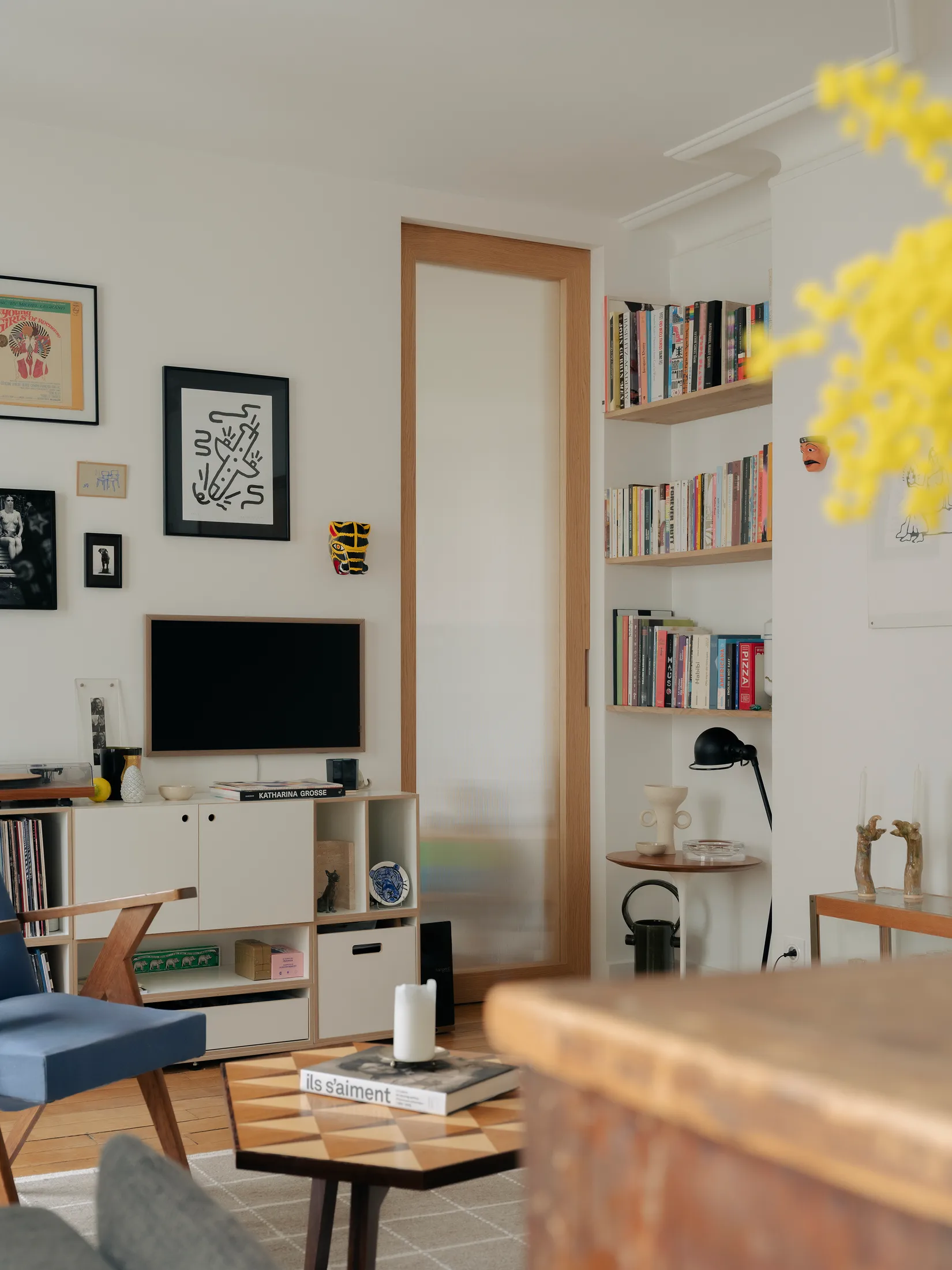 The apartment’s new layout allows flow between spaces, restores light, depth and cross-ventilation. Sliding glass pocket doors, integrated storage and carefully placed furniture replace traditional divisions, creating a home that feels open, yet adaptable. Rather than erasing its past, the new design keeps details and traces of it — from fireplace imprints to parquet flooring — allowing memory and modern living to coexist.