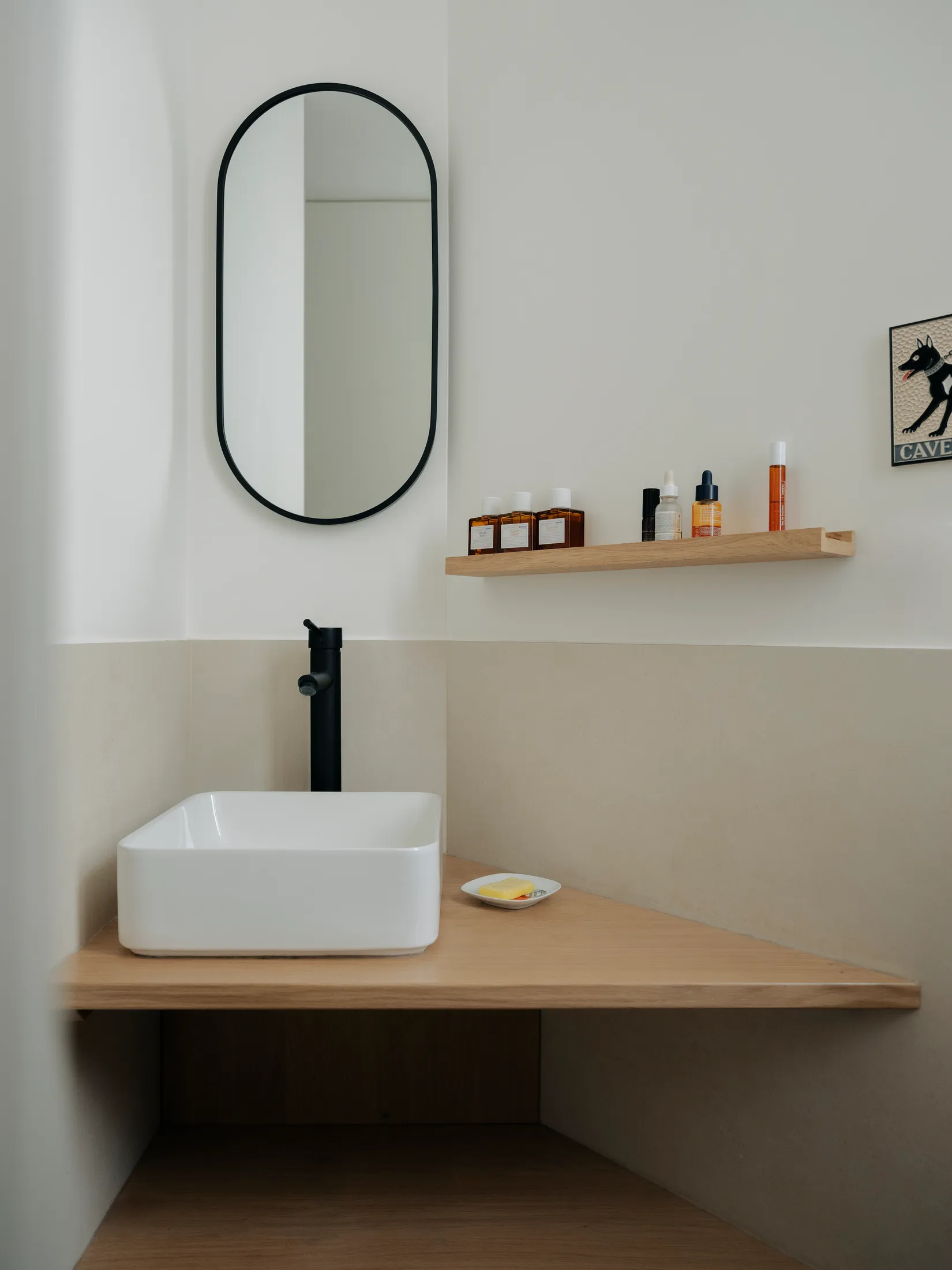 At the heart of Garcia’s redesign is a single, carefully positioned wall that replaces the apartment’s former maze of small rooms. Rather than dividing up the open-plan layout, it reorganises it. Movement between spaces now happens freely instead of along a single corridor, creating multiple paths and perspectives. It also allows the full 12-metre length of the apartment to be viewed from the entrance — something that was previously impossible.