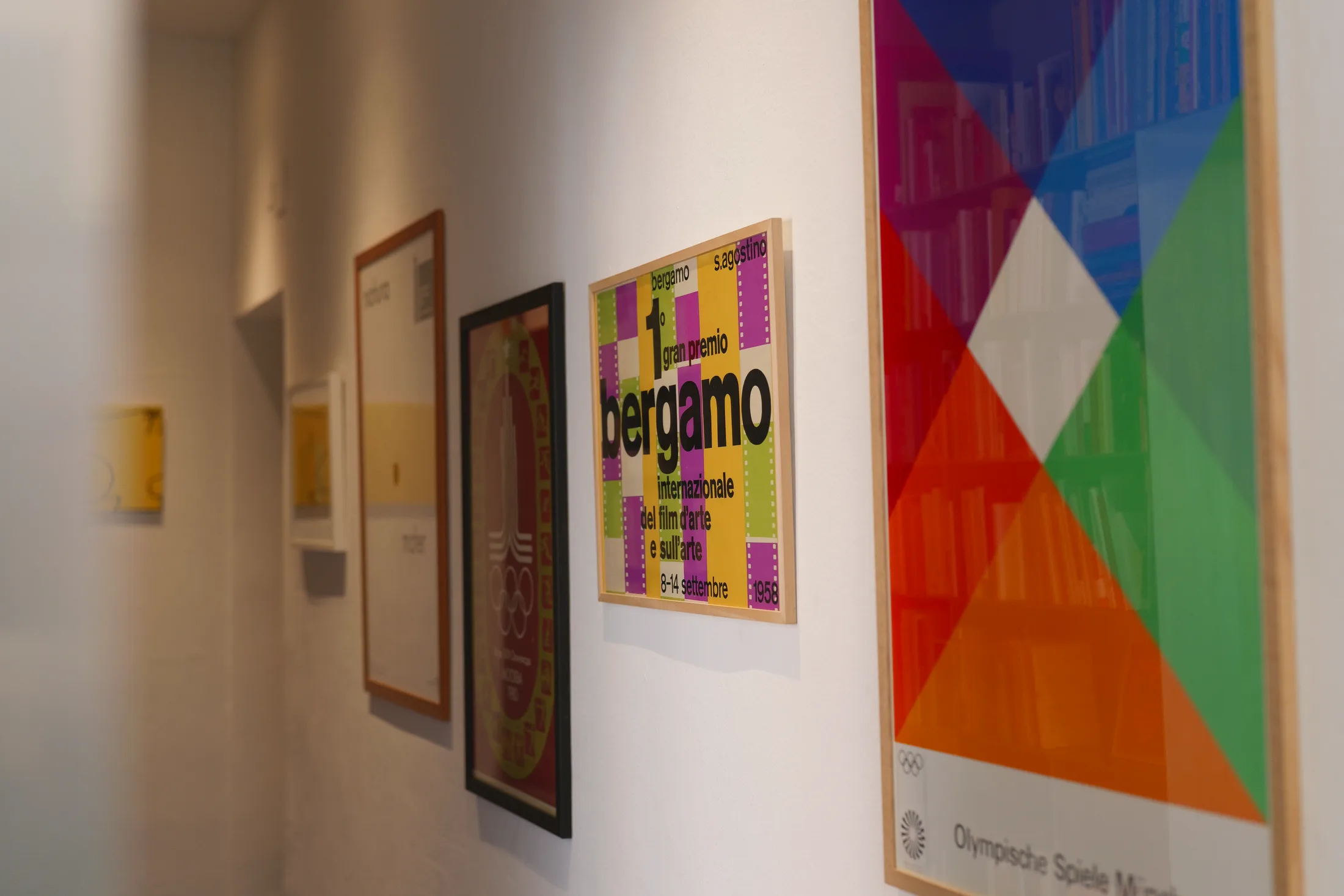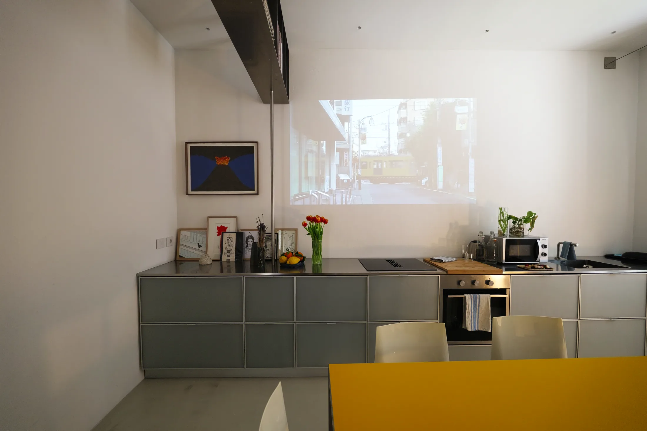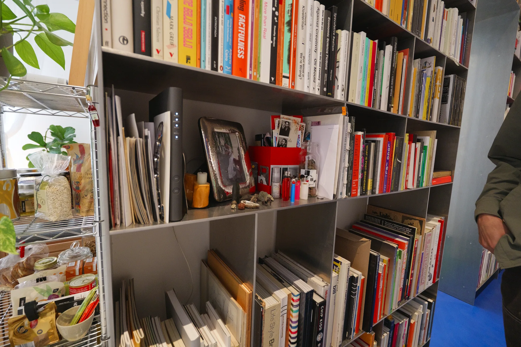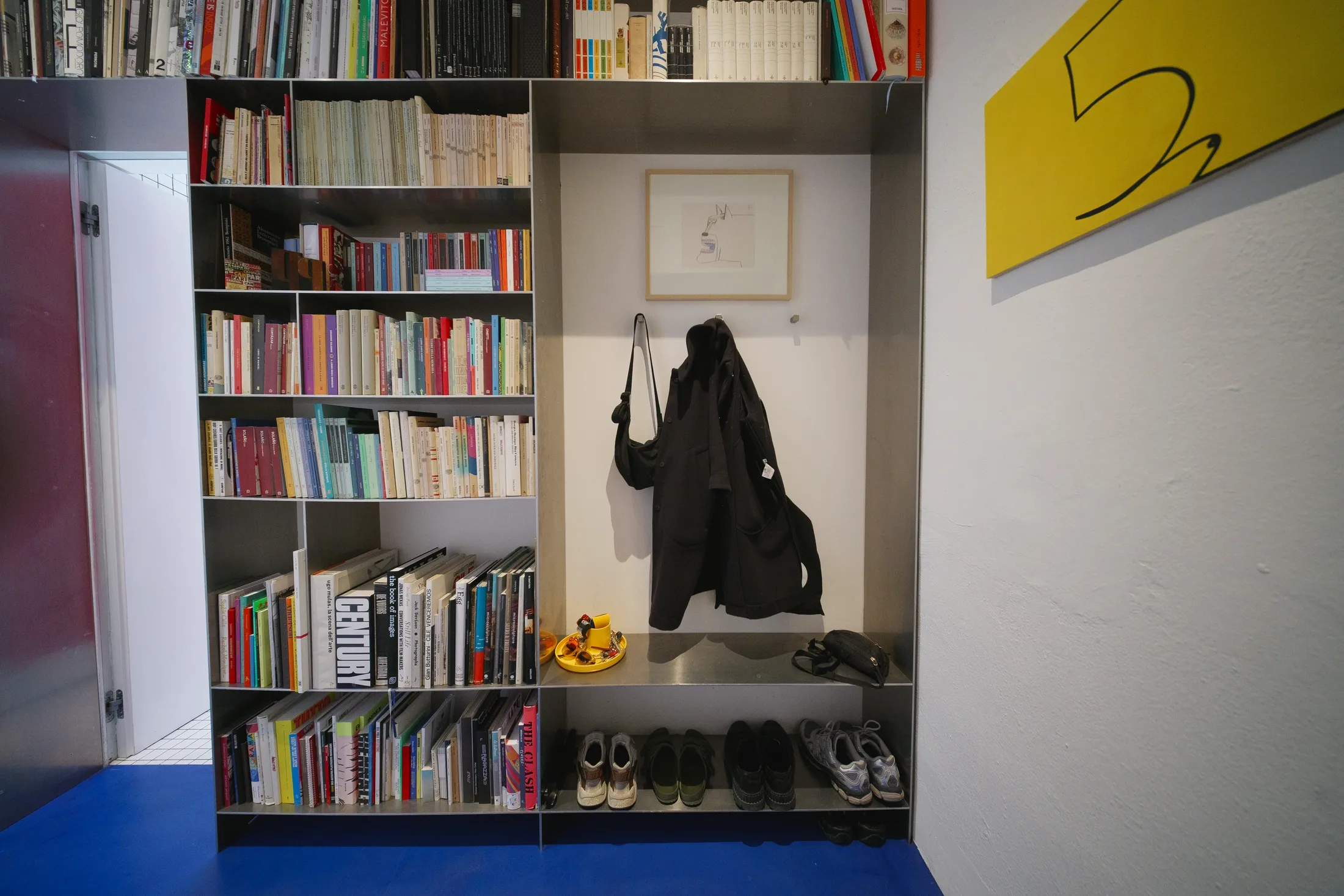 At the entrance, Cavalleri and Bianchini use a low metal shelf, part of the full-height shelving wall, to hold keys, sunglasses, and wallets. From there, the hallway stretches into a long, narrow passage. Together with Associates Architecture, they designed a custom aluminium bookshelf that runs the full-length of the corridor, made by specialist metalworkers and sized precisely to fit their largest books. Hung from the ceiling rather than sitting on the floor, it keeps the space feeling open while giving their extensive collection a clear structure. Along the opposite wall, they display framed posters and artworks by friends and collaborators, turning the walk to the rest of the home into a daily gallery visit. “The bookshelf is the backbone of the house. It guides you all the way to the end of the corridor,” Bianchini explains.