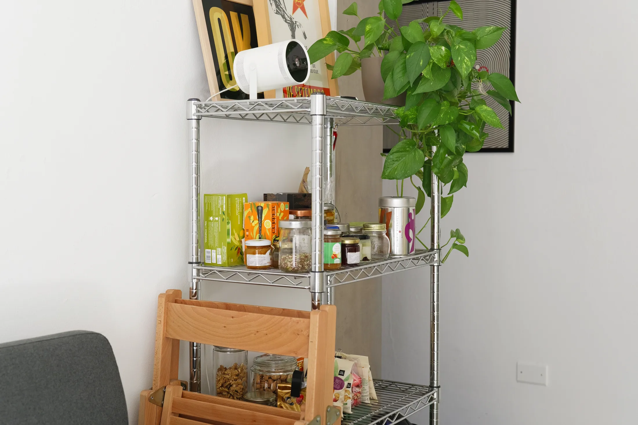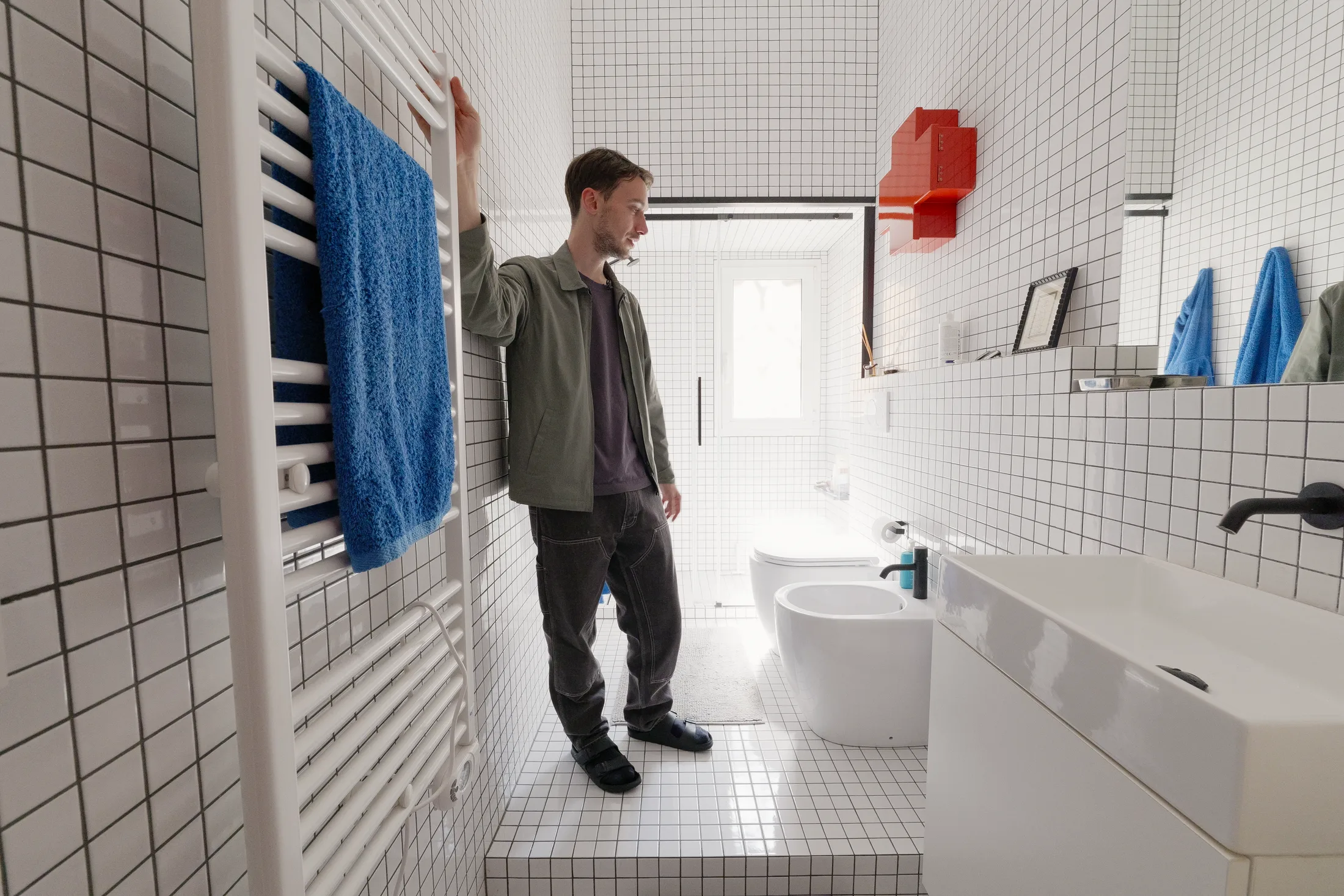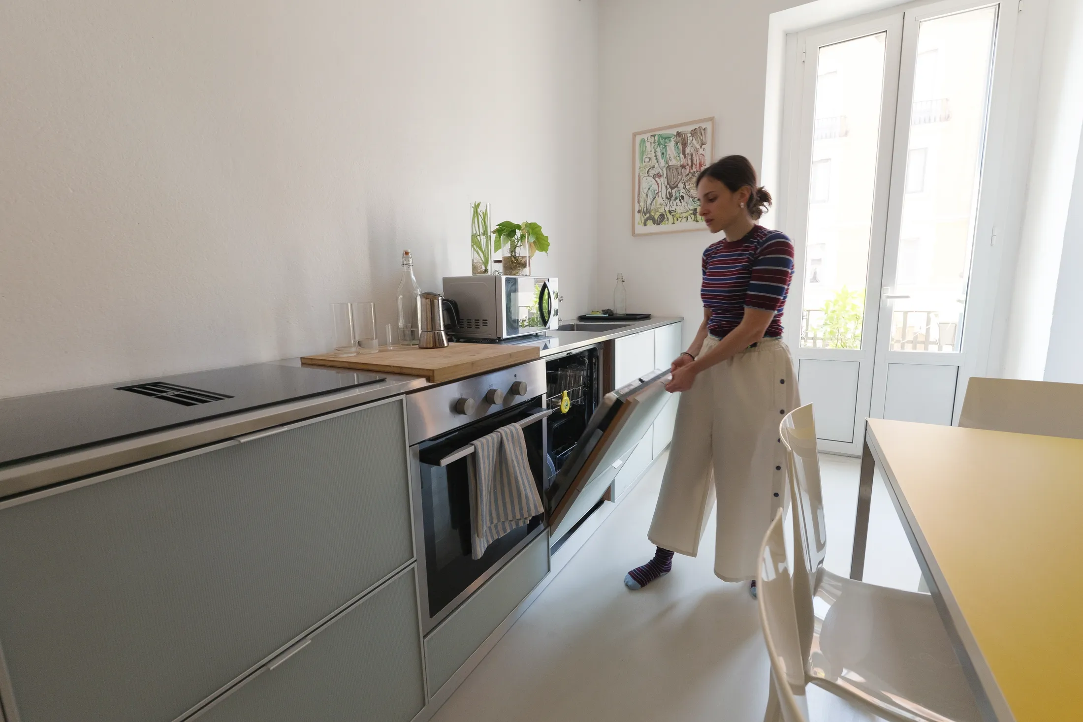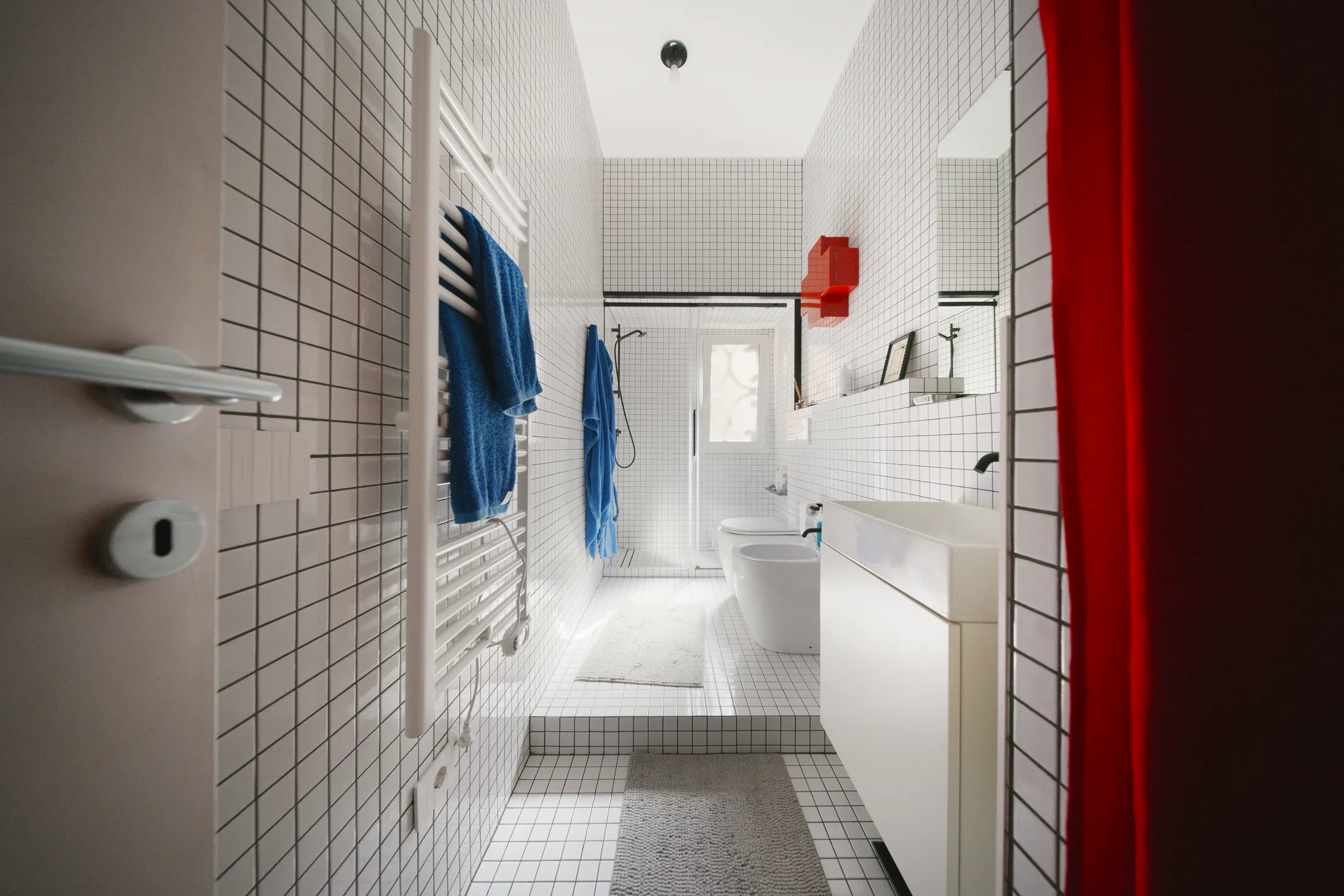 At the entrance, Cavalleri and Bianchini use a low metal shelf, part of the full-height shelving wall, to hold keys, sunglasses, and wallets. From there, the hallway stretches into a long, narrow passage. Together with Associates Architecture, they designed a custom aluminium bookshelf that runs the full-length of the corridor, made by specialist metalworkers and sized precisely to fit their largest books. Hung from the ceiling rather than sitting on the floor, it keeps the space feeling open while giving their extensive collection a clear structure. Along the opposite wall, they display framed posters and artworks by friends and collaborators, turning the walk to the rest of the home into a daily gallery visit. “The bookshelf is the backbone of the house. It guides you all the way to the end of the corridor,” Bianchini explains.