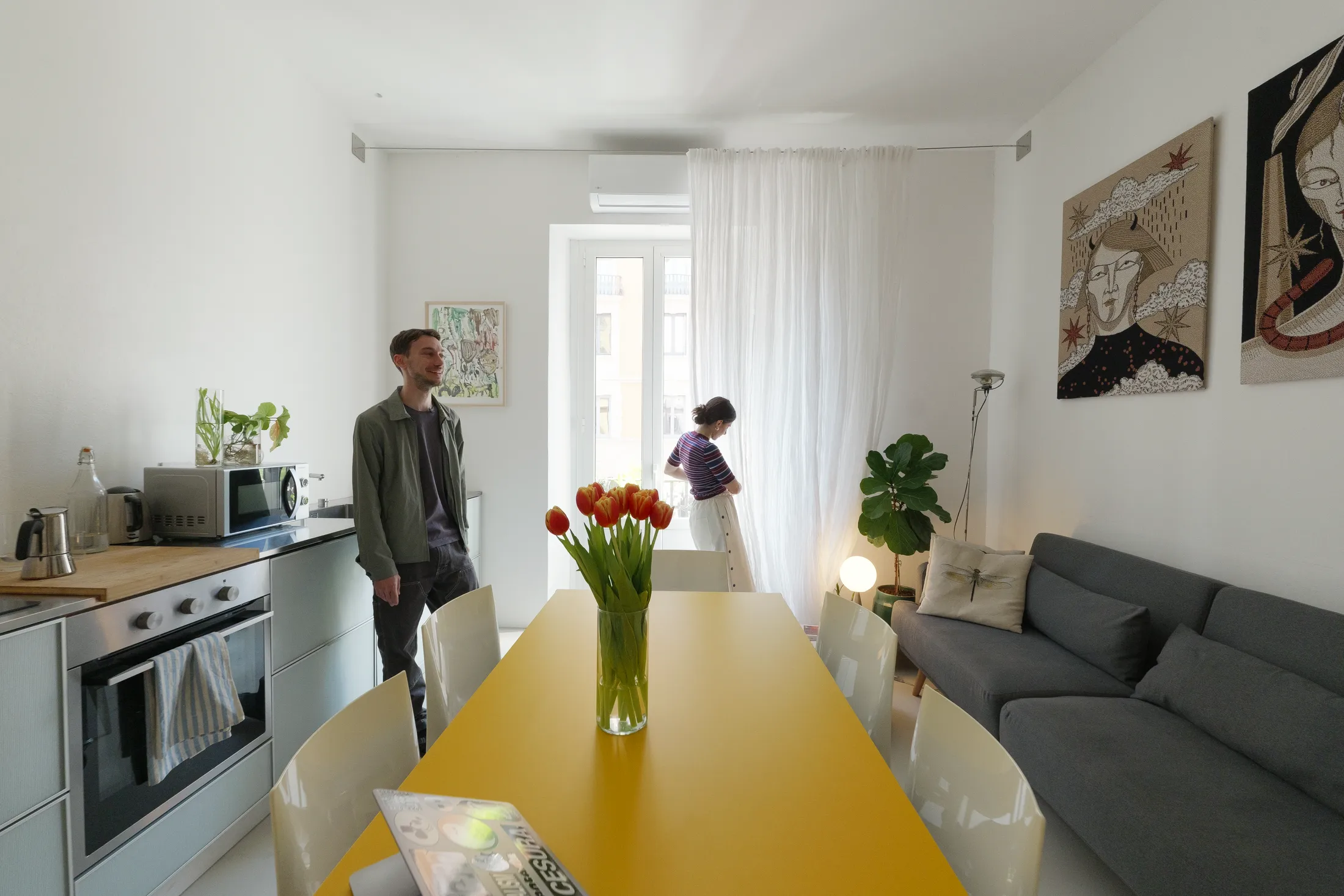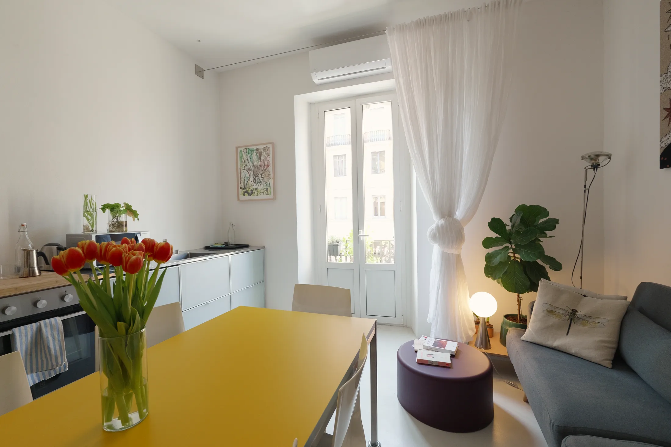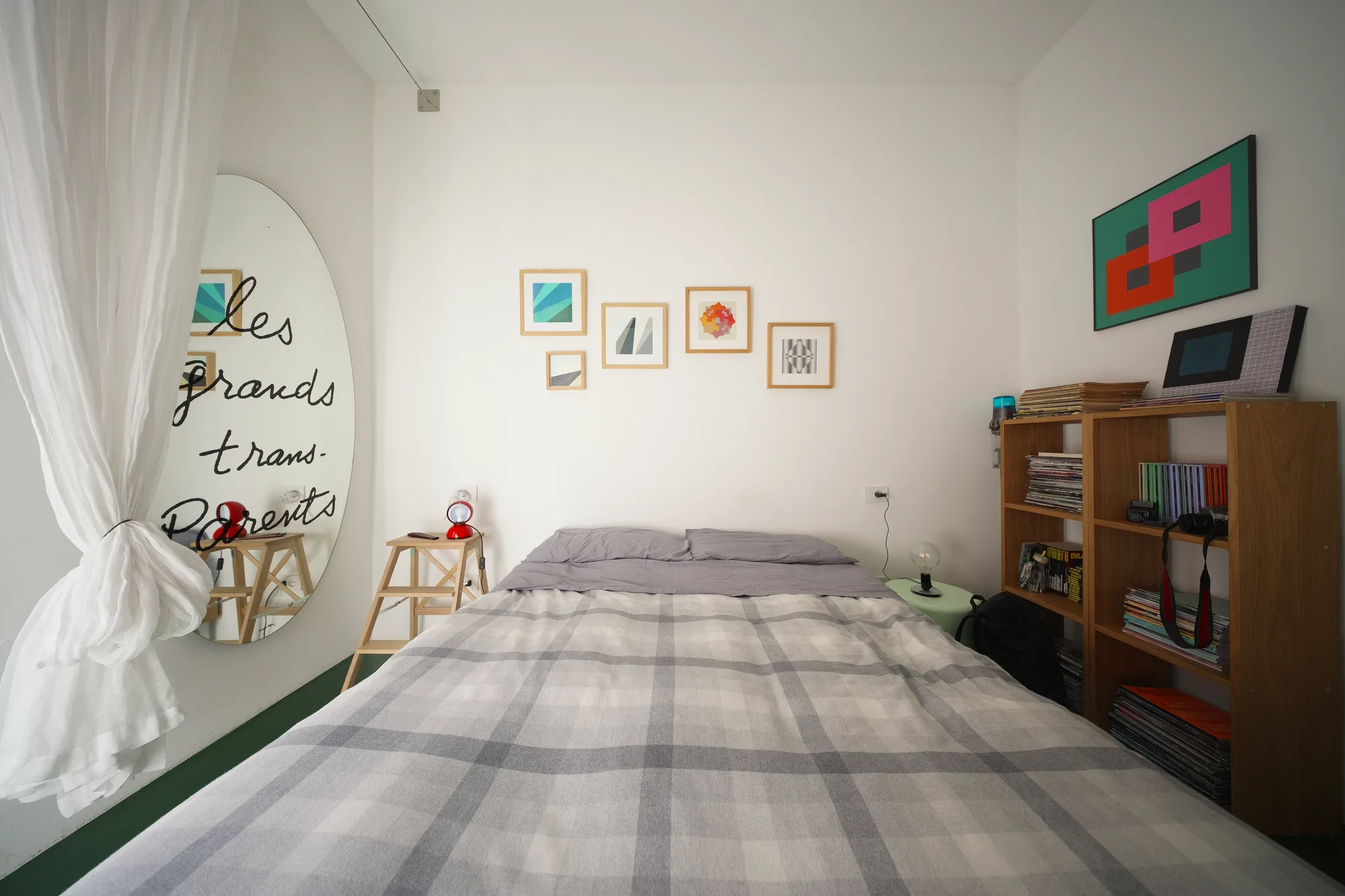 Giovanni Cavalleri and Cecilia Bianchini, founders of Milan-based graphic design studio Paper Paper, bought their 45sqm/484sqft apartment as a place to slow down and unplug from the city around them. Working with friends at Associates Architecture, they renovated the one-bedroom flat with a clear goal in mind: to make it feel airy, flexible, and easy to live in, while giving their art and book collections a central role. Rather than separating functions into rigid rooms, the couple designed the apartment so the same compact space can shift from quiet nights in to long dinners with friends and the occasional overnight guest. Much of their space draws on personal history, from curtains taken from Cavalleri’s mother’s house to second-hand furniture and artworks gathered over time. It’s a home that’s practical without feeling restrictive, and playful without being precious – organised around how they actually live, host, and move through a small space.
