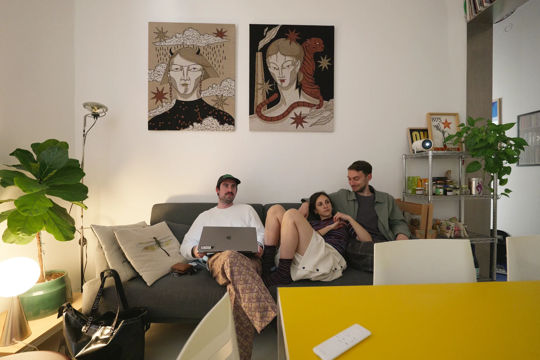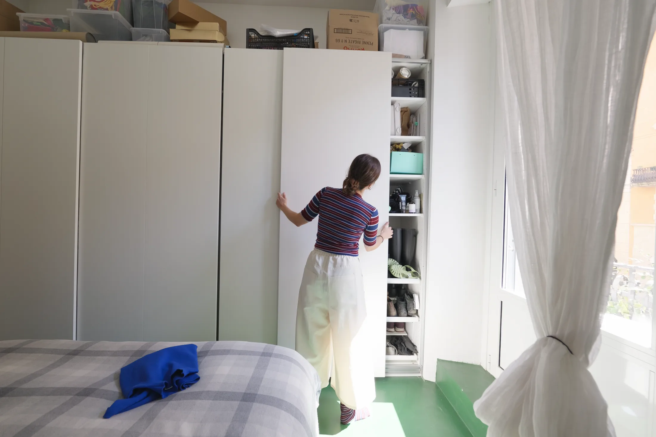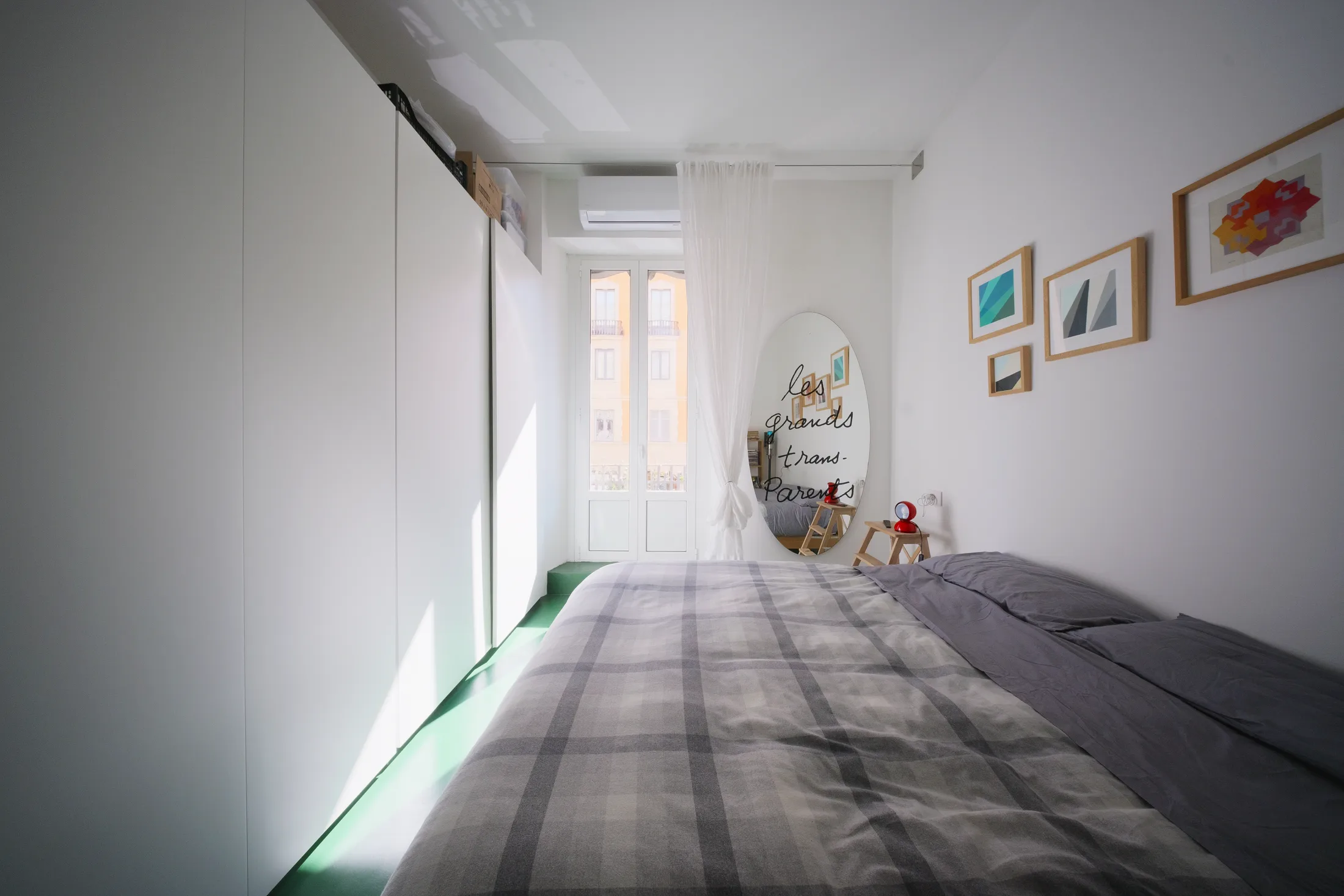 Giovanni Cavalleri and Cecilia Bianchini, founders of Milan-based graphic design studio Paper Paper, bought their 45sqm/484sqft apartment as a place to slow down and unplug from the city around them. Working with friends at Associates Architecture, they renovated the one-bedroom flat with a clear goal in mind: to make it feel airy, flexible, and easy to live in, while giving their art and book collections a central role. Rather than separating functions into rigid rooms, the couple designed the apartment so the same compact space can shift from quiet nights in to long dinners with friends and the occasional overnight guest. Much of their space draws on personal history, from curtains taken from Cavalleri’s mother’s house to second-hand furniture and artworks gathered over time. It’s a home that’s practical without feeling restrictive, and playful without being precious – organised around how they actually live, host, and move through a small space.