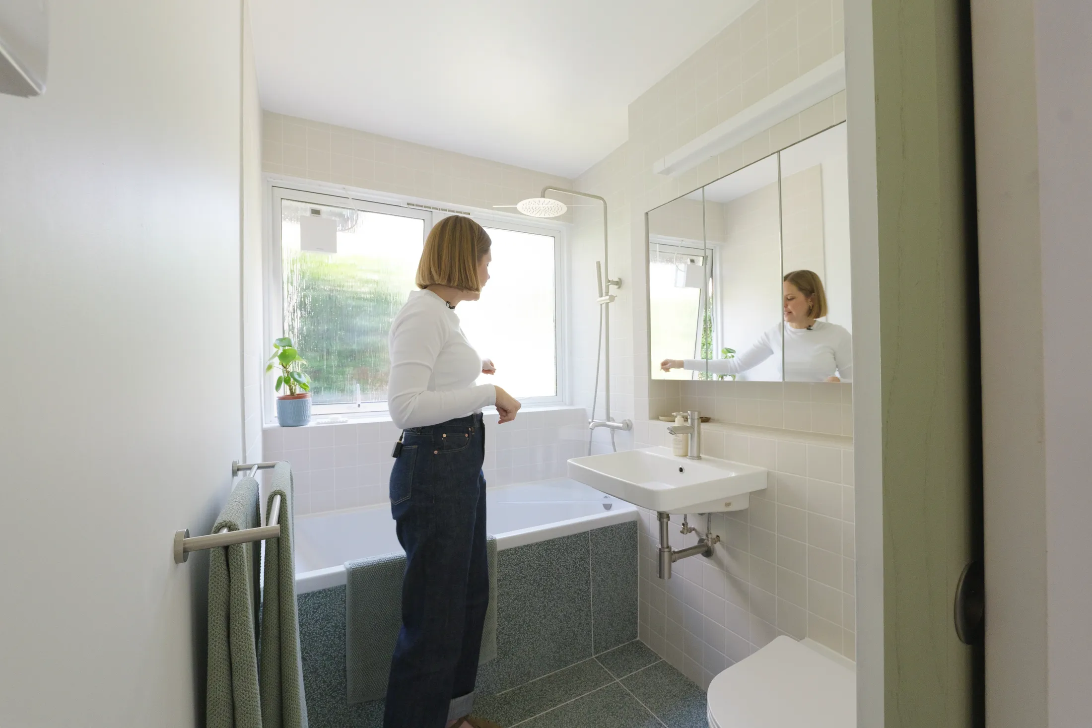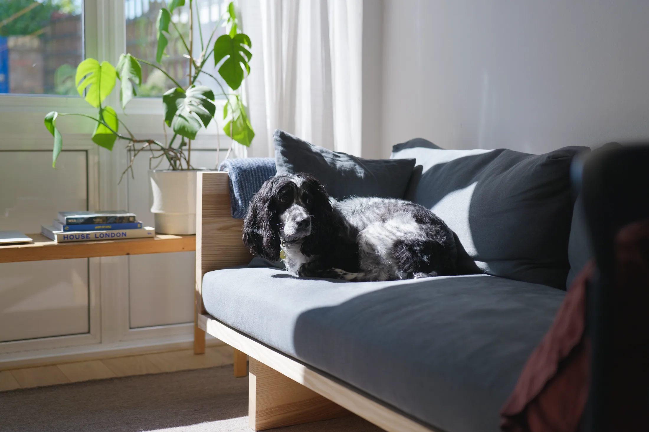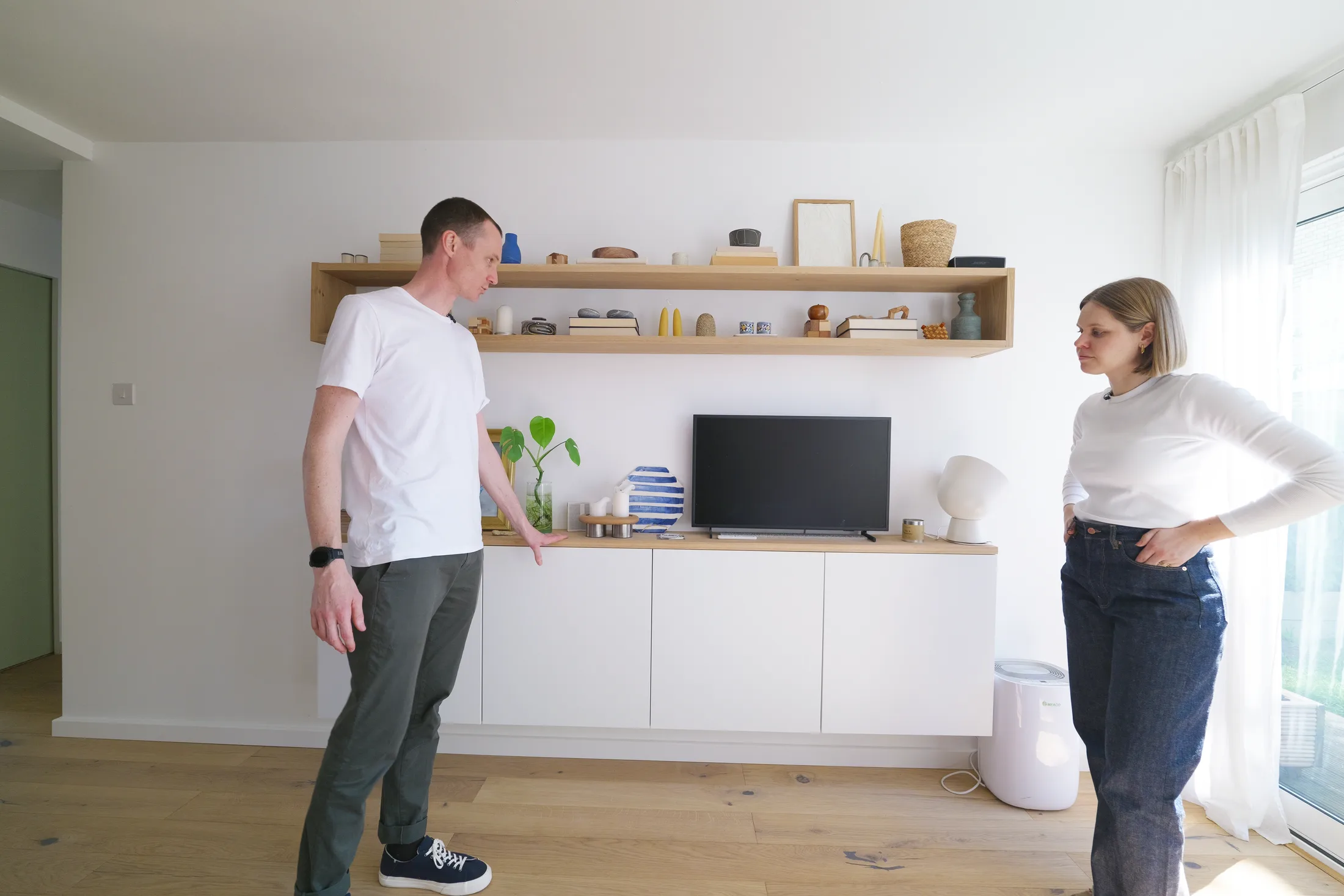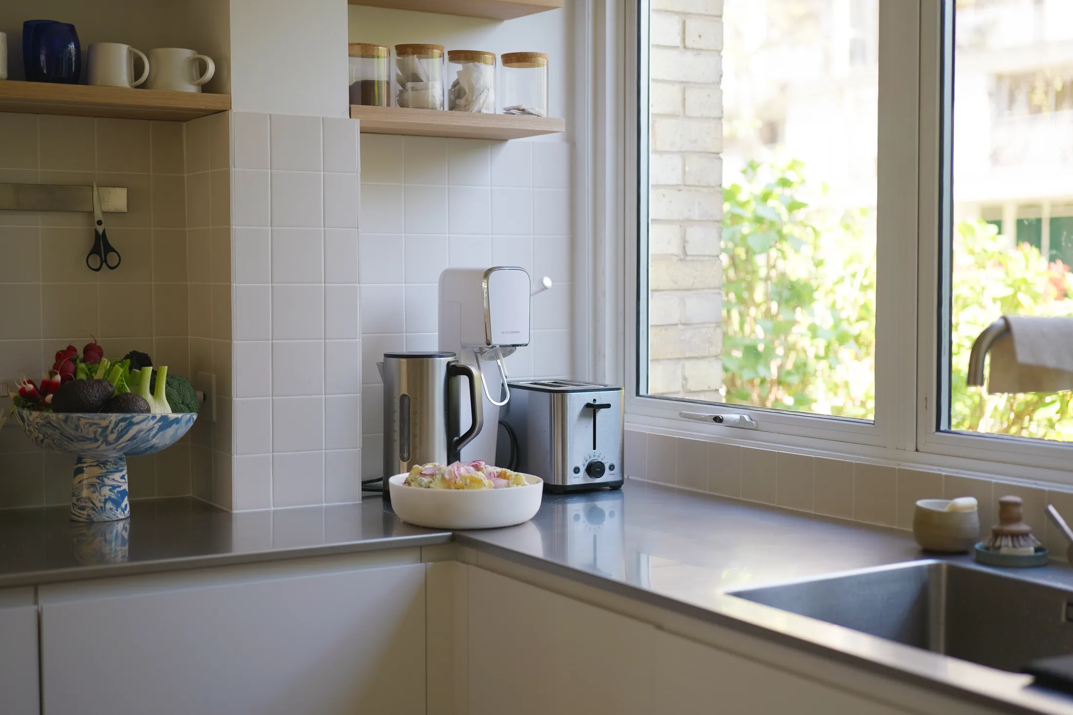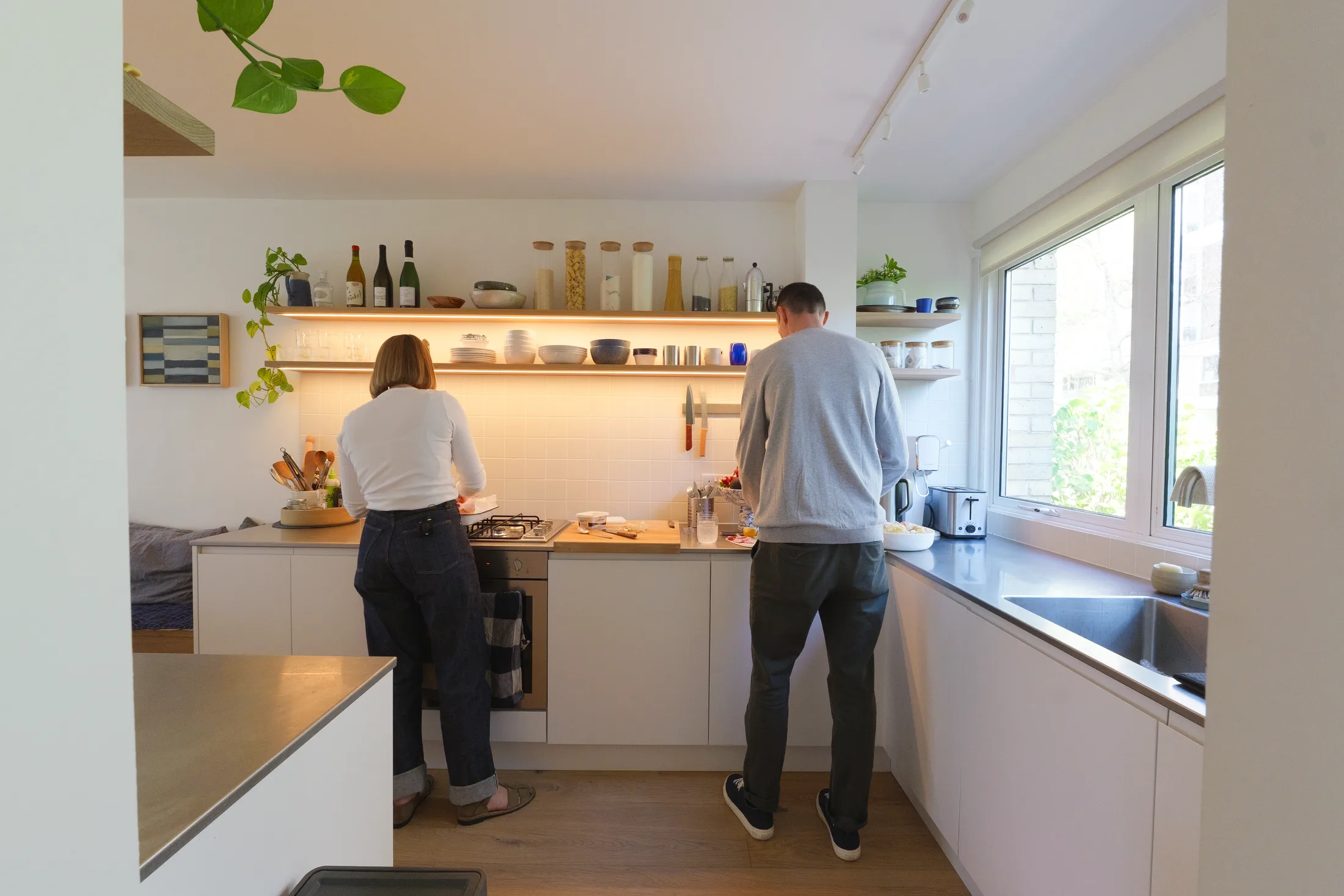 Celeste Bolte, founding director of SALT, and engineer Pete Fisher weren’t sure their move to a 46sqm/495sqft London flat, even one with rare garden access, would work – until they began transforming it themselves, one room at a time. With invaluable help from the architectural firm Loader Monteith and plenty of hands-on renovations, they built a home that does more than its size suggests without feeling small. Every surface earns its keep, from the fold-down desk to the built-in bench seat, yet nothing feels fussy. Bright, practical, and a little improvised – the kind of place where their dog Percy naps in the sun, drinks turn into dinner, and the DIY, imperfections included, feels woven into how they live.