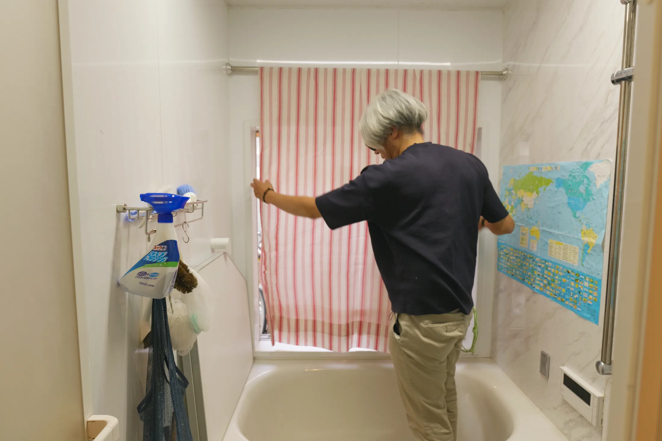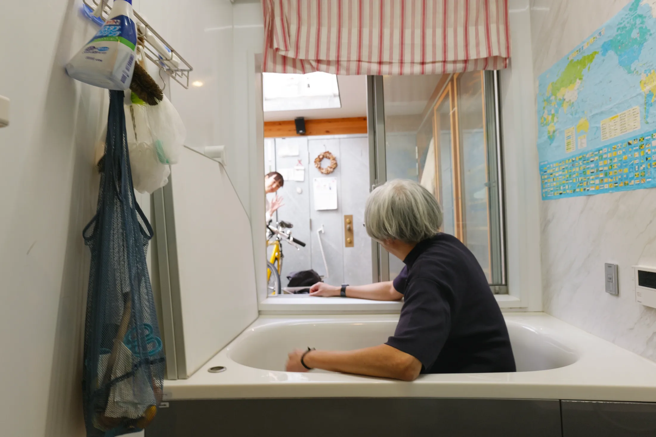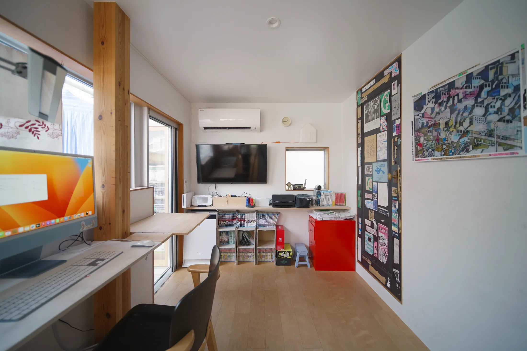 The inverted courtyard sits at the centre of the home. It has no roof, just a piano and a TV (both behind sliding glass doors), a sofa, hanging lights, and whatever plants or artworks are being moved around that week. In good weather, Zajirogh, his wife Minori Takahashi, and their three children, cook, eat, paint, and play here, shifting things around to make space. When the weather turns, Zajirogh pulls a heavy tarp across the opening – a sail on a simple pulley system that has been adjusted and refined over the years. When snow or rain arrives, everything is brought in, the tarp is tensioned, and life turns inward for a while. This space never fully belongs indoors or outdoors, and that’s exactly as Zajirogh intended.
