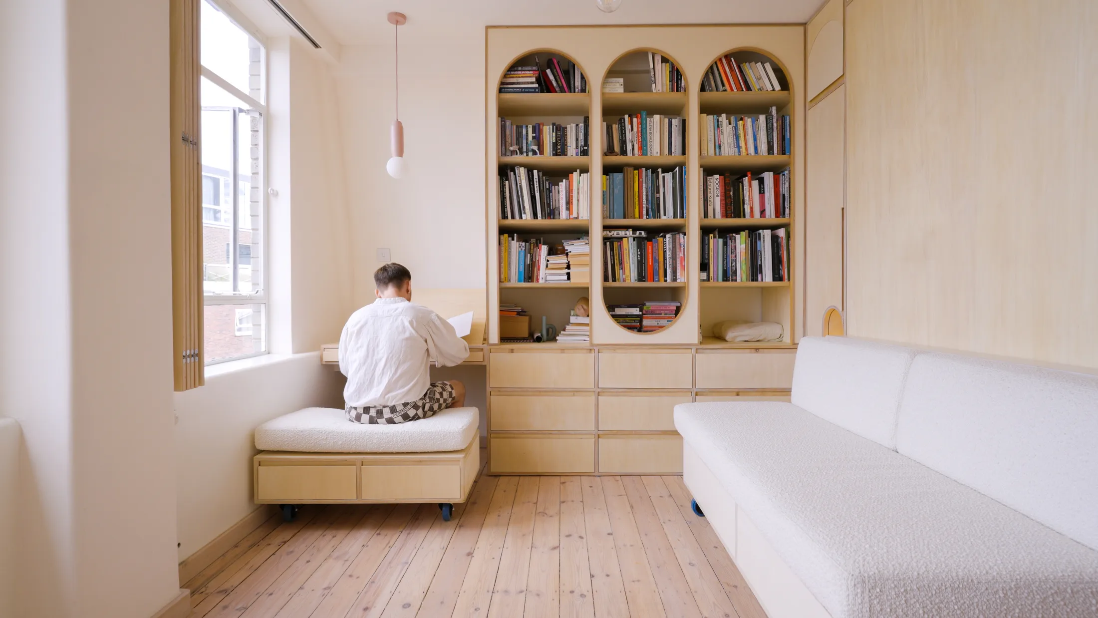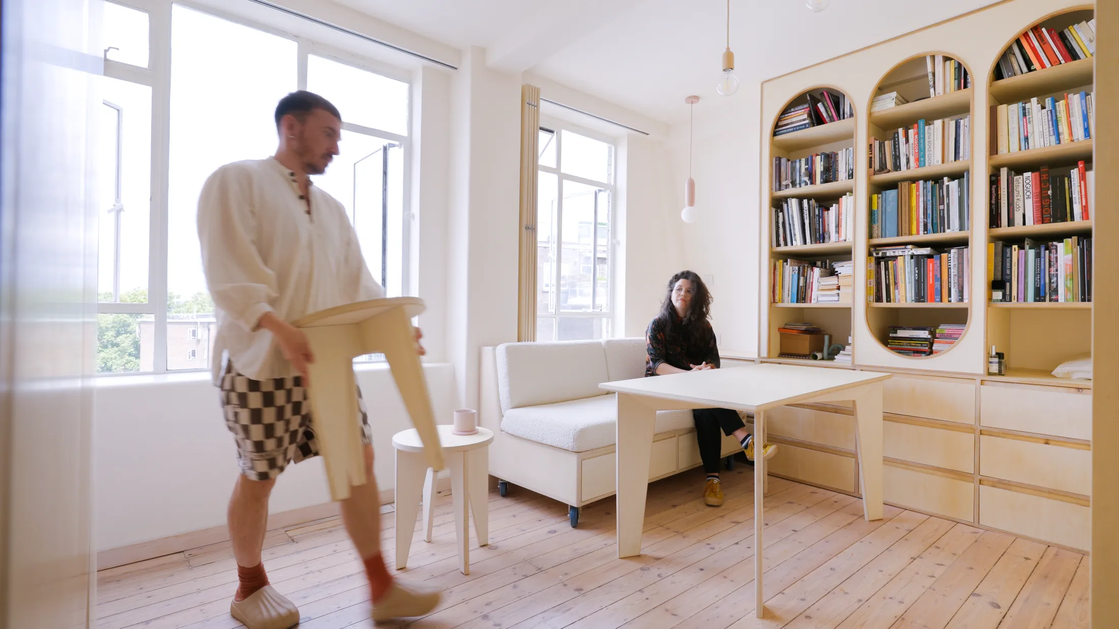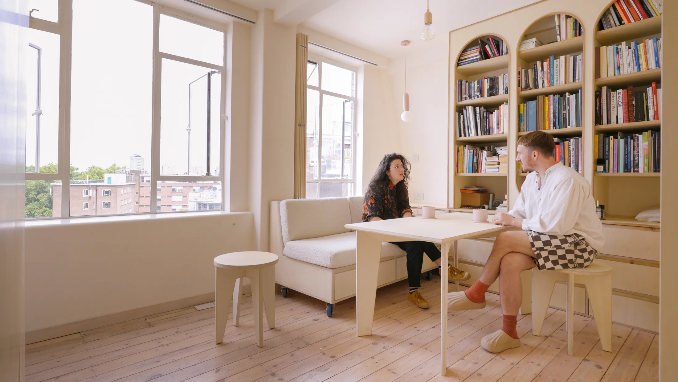 The apartment is home to two well-known, London-based artists, who wanted a space that felt relaxing and tonally muted, a calm counterpart to their vibrant, colour-filled studios. They asked for an inventive design that maximised storage while accommodating zones for living, dining, sleeping, and working all within just 24sqm/258sqft. A puzzle indeed.