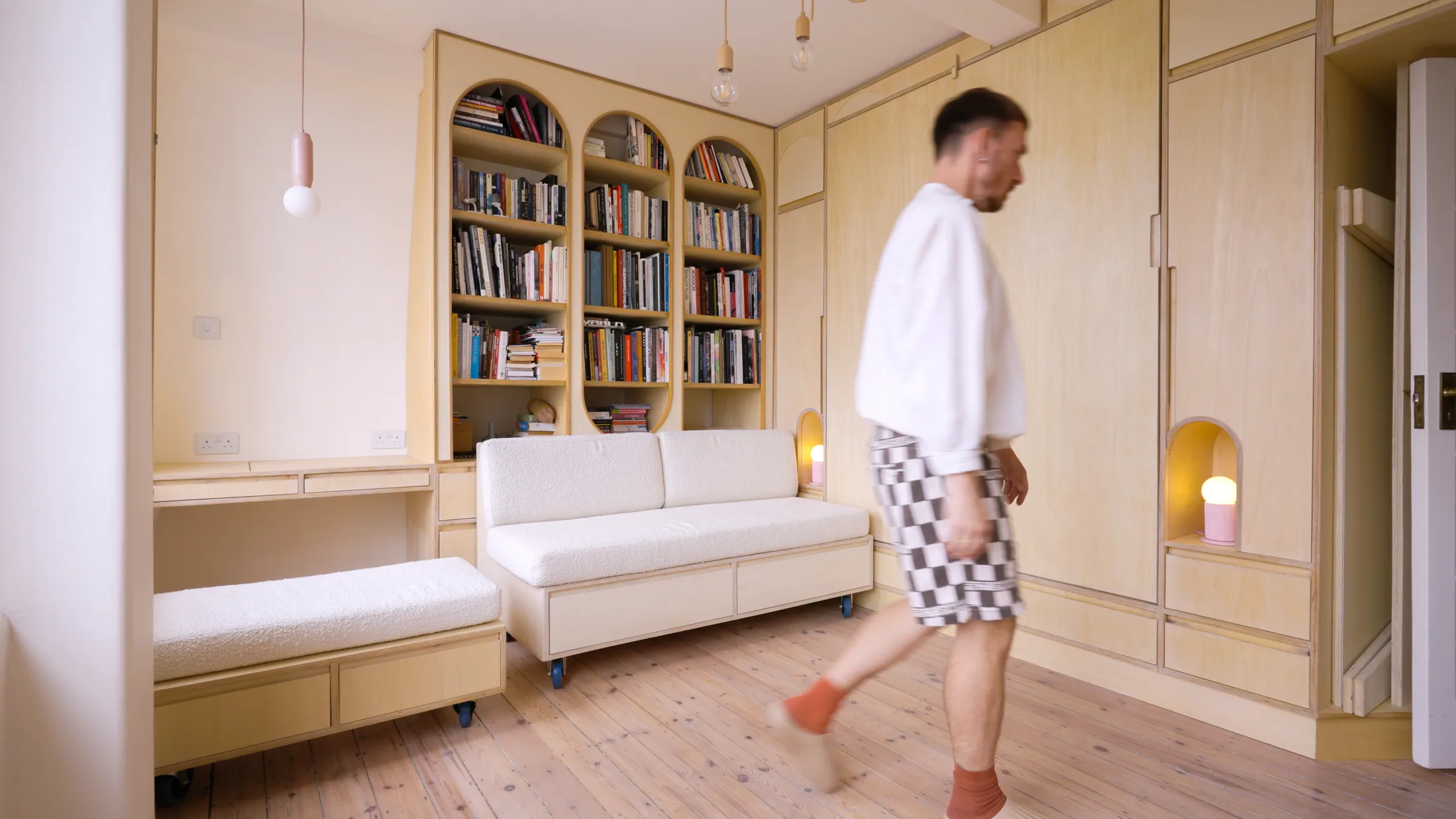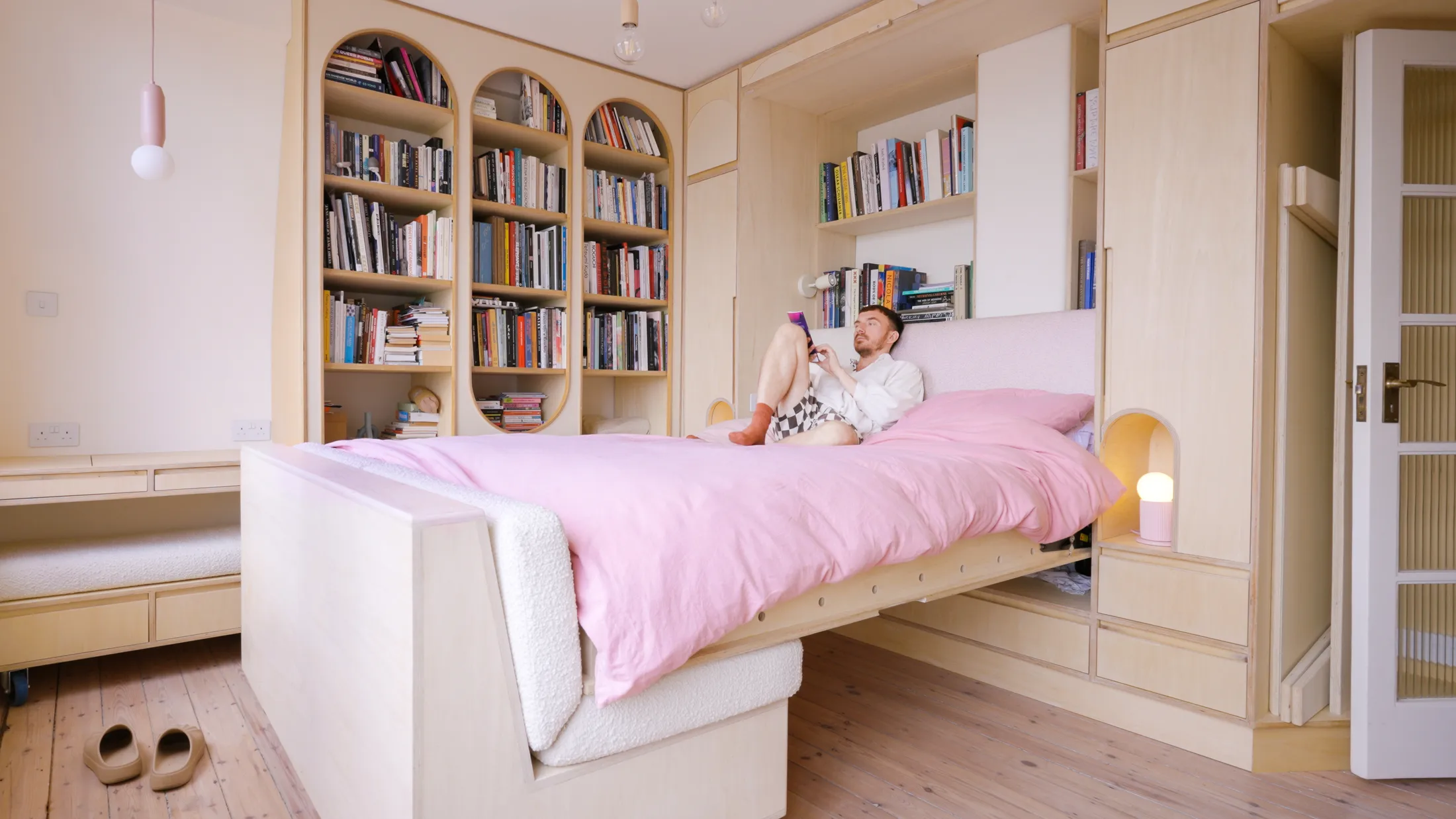 “The joinery within the main space is multi-functional,” Parker explains. “It takes inspiration from a Japandi style with Art Deco referencing and provides a holistic layout for storage.” It’s a home built around flat-pack principles. Floor-to-ceiling cupboards line the walls, with extra storage tucked above the doorway, while a Murphy bed folds down to rest neatly on the sofa below. When friends come to dinner, a cross-shaped flat-pack table and stools unfold from the joinery to transform the living area into a dining space for six. The joinery conceals drawers, shelving, and niches for lighting and switches. Its pale tone softens the geometry, allowing the furniture and walls to read as one continuous surface, while the curved detailing nods to the building’s Art Deco roots.