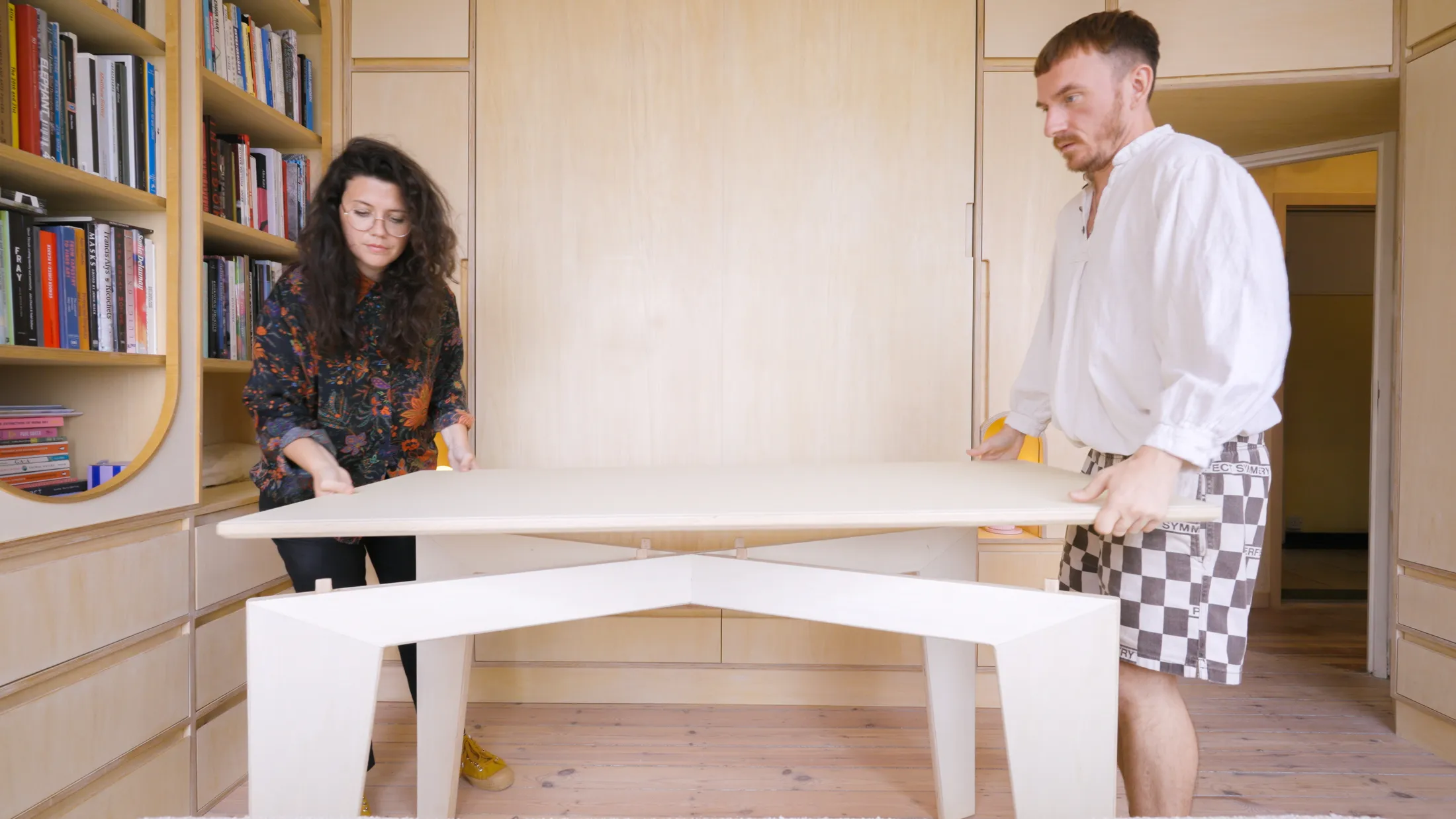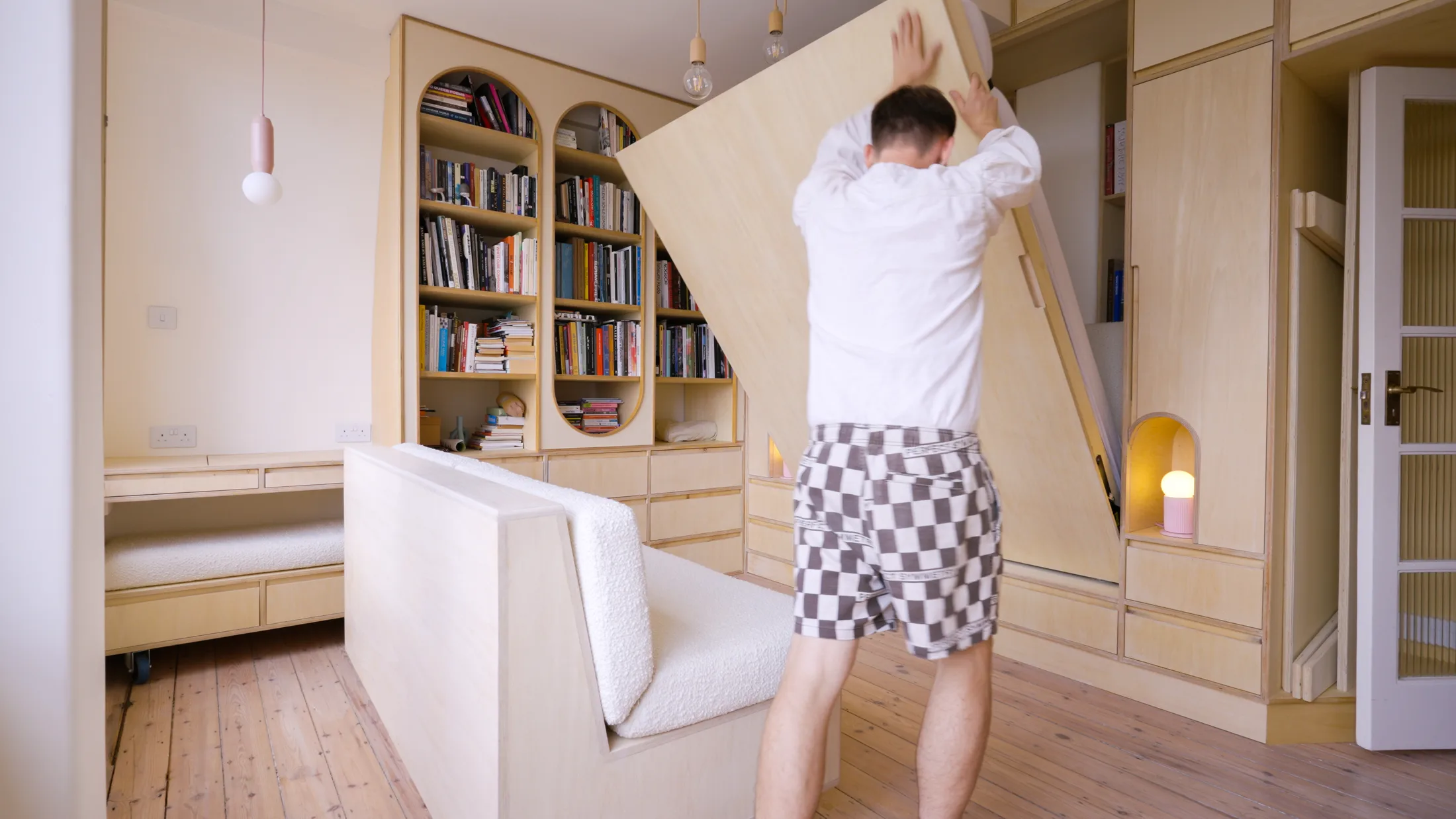 Undeterred by a challenging brief and the constraints of the building’s listed status, Parker, founder of Intervention Architecture, set about transforming the space. “During the renovation we had to retain all structural walls, so the amendments were only fit-out based,” she explains. This included navigating the apartment’s original Art Deco plumbing, which meant the bathroom layout couldn’t be changed either. A final – though by no means inconsequential – constraint was what Parker calls the “almost Parisian-style” Art Deco lift. The small elevator meant limited access to the top-floor apartment for building materials and deliveries. With so many restrictions, Parker turned to modular joinery as both structure and furniture, designing a single plywood system: a wall of CNC-cut, precision joinery that folds, slides, and reconfigures to create spaces for living, working, and sleeping.