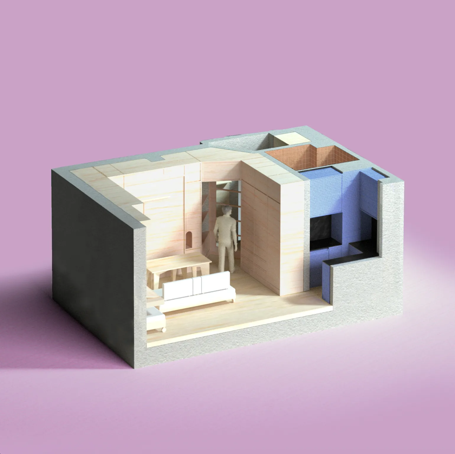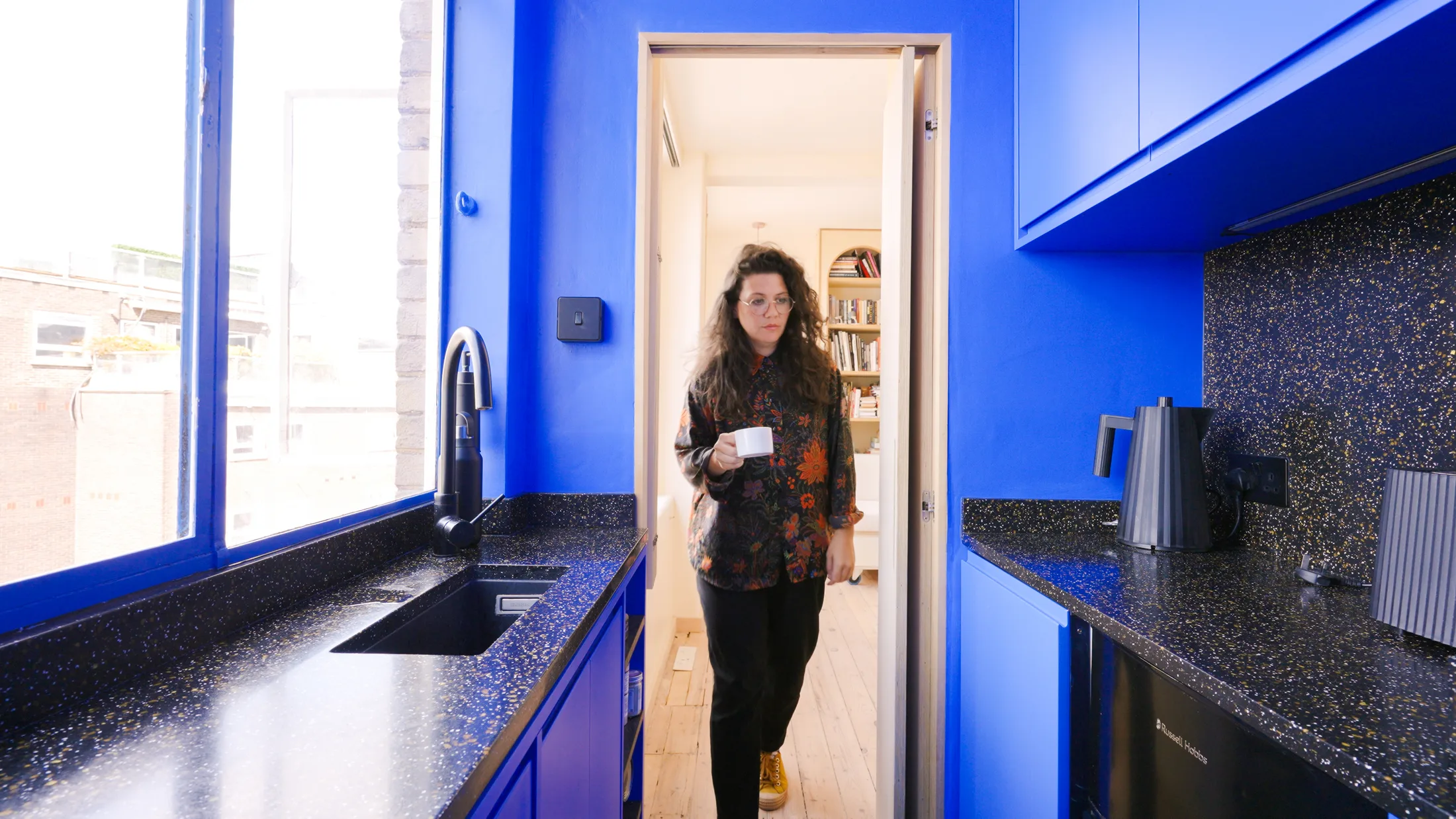Just when the eye has adjusted to the calming monotone of the joinery, it finds the kitchen. Glimpsed through a bi-folding plywood door from the main area, the kitchen is saturated in a Yves Klein Blue providing a bold contrast to the rest of the space. “We wanted to reference the clients’ use of vibrant colours in their day-to-day work,” Parker says. To complement the intensity of the blue, the kitchen features black Corian benchtops flecked with gold and other subtle tones, adding depth and texture to the surface. By continuing the finish up the wall above the hob, Parker turns the small kitchen into a clean-lined composition of deep blue and black.