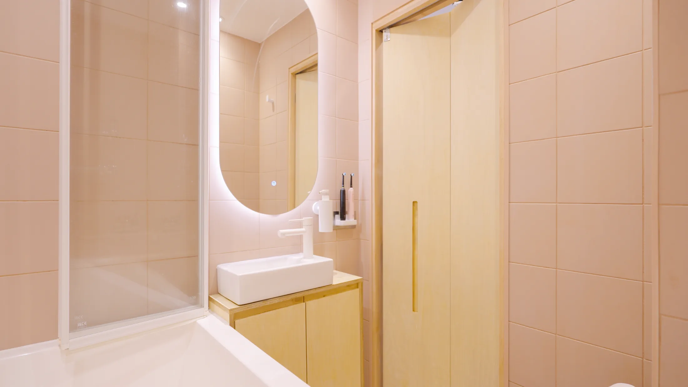 The bathroom is another surprising piece in this inventive puzzle. With the plumbing layout fixed, Parker replaced everything else, keeping only the original towel rail – a beautiful Art Deco piece – and finished the walls in what she calls “piglet pink.” She elaborates: “The overall look and feel of the space is meant to evoke an Art Deco ship cabin. It’s functional but also has this romantic blush pink.” The compact, Japanese-style tub is deeper than a standard bath, allowing the clients to fully immerse despite the limited footprint, while matching tiles flow across the floor, walls, and bath front, to make the space feel larger than it is. Like the rest of the apartment, it balances efficiency with a distinct sense of character.