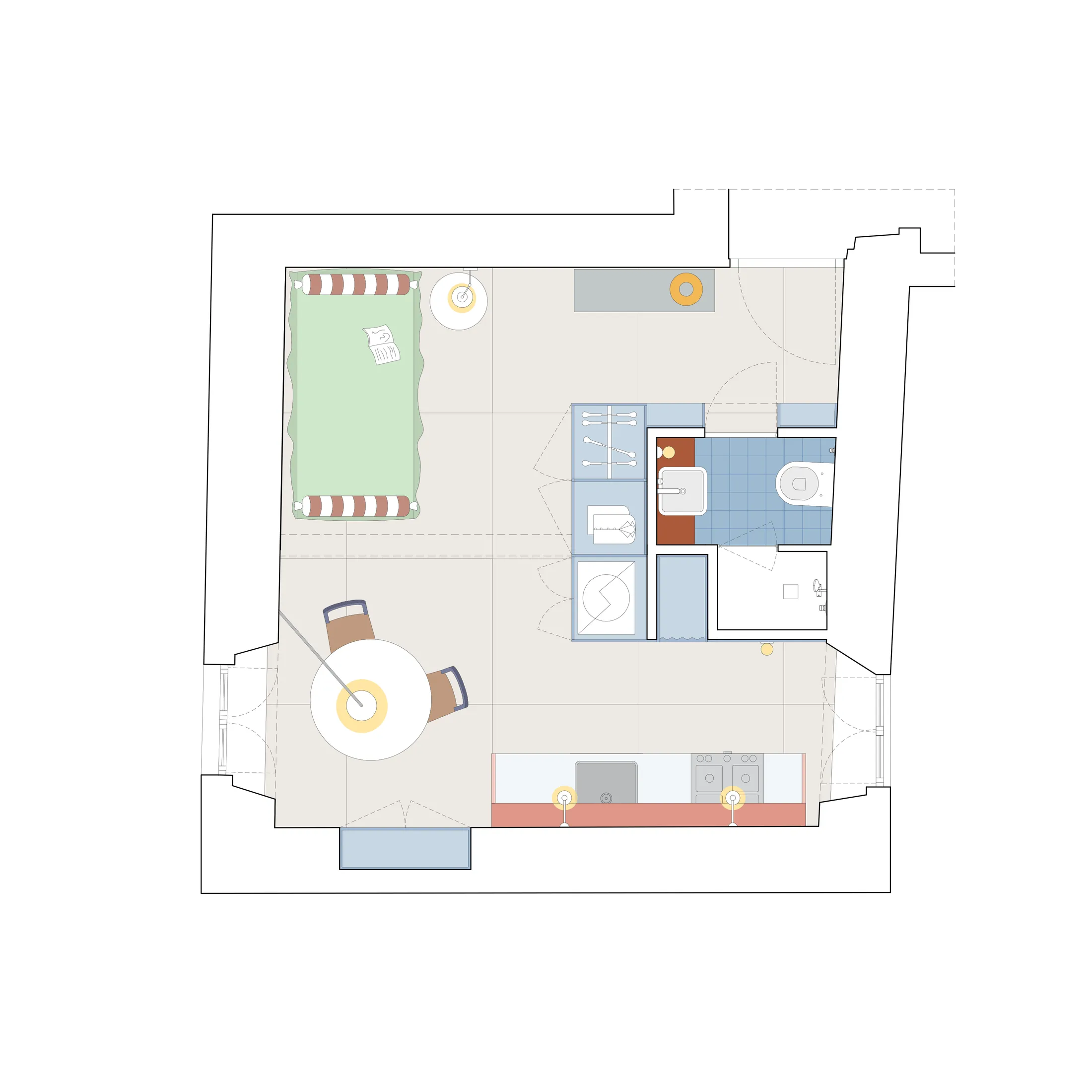 The client’s initial vision for the small studio apartment was linked to both his personal experience having lived in the apartment for a period of time, and his desired use for the property ー renting to medium and long-term tenants. Based on the apartment’s small size, the client also wanted to opt for a minimalist look, both in terms of space and colour which would, in his opinion, offer a broader and more functional perception of the environment.