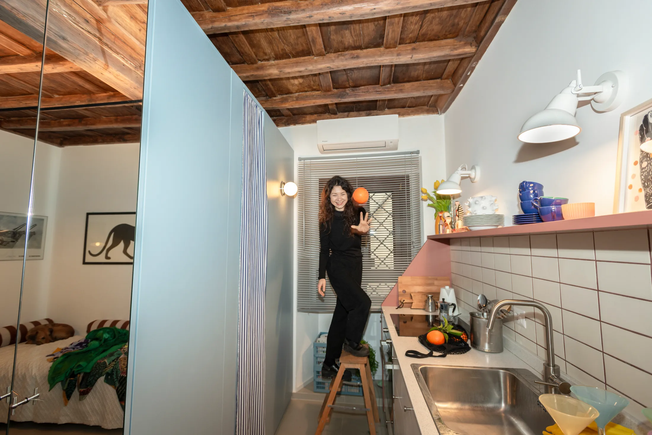 When considering the distribution of the space in an open-plan apartment, it’s necessary to define specific spaces, identify rooms and hierarchise the relationships these spaces have with each other. With little space available to us in Casa Vivamati, we decided to build only one central element: the CUBE, which lying to one side of the apartment’s square floor plan, creates three distinct functional zones: the entrance, the living and relaxation area and the kitchen.