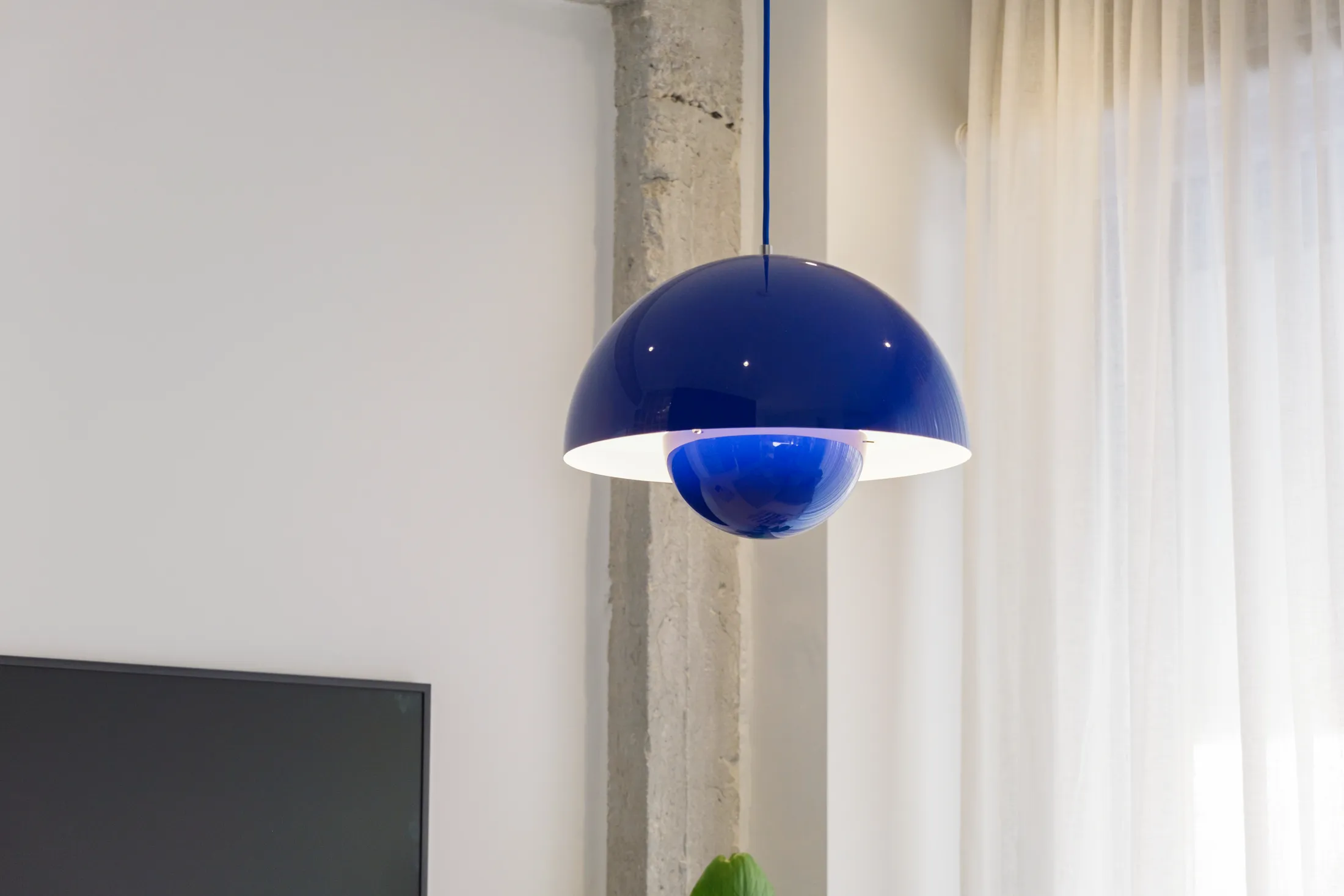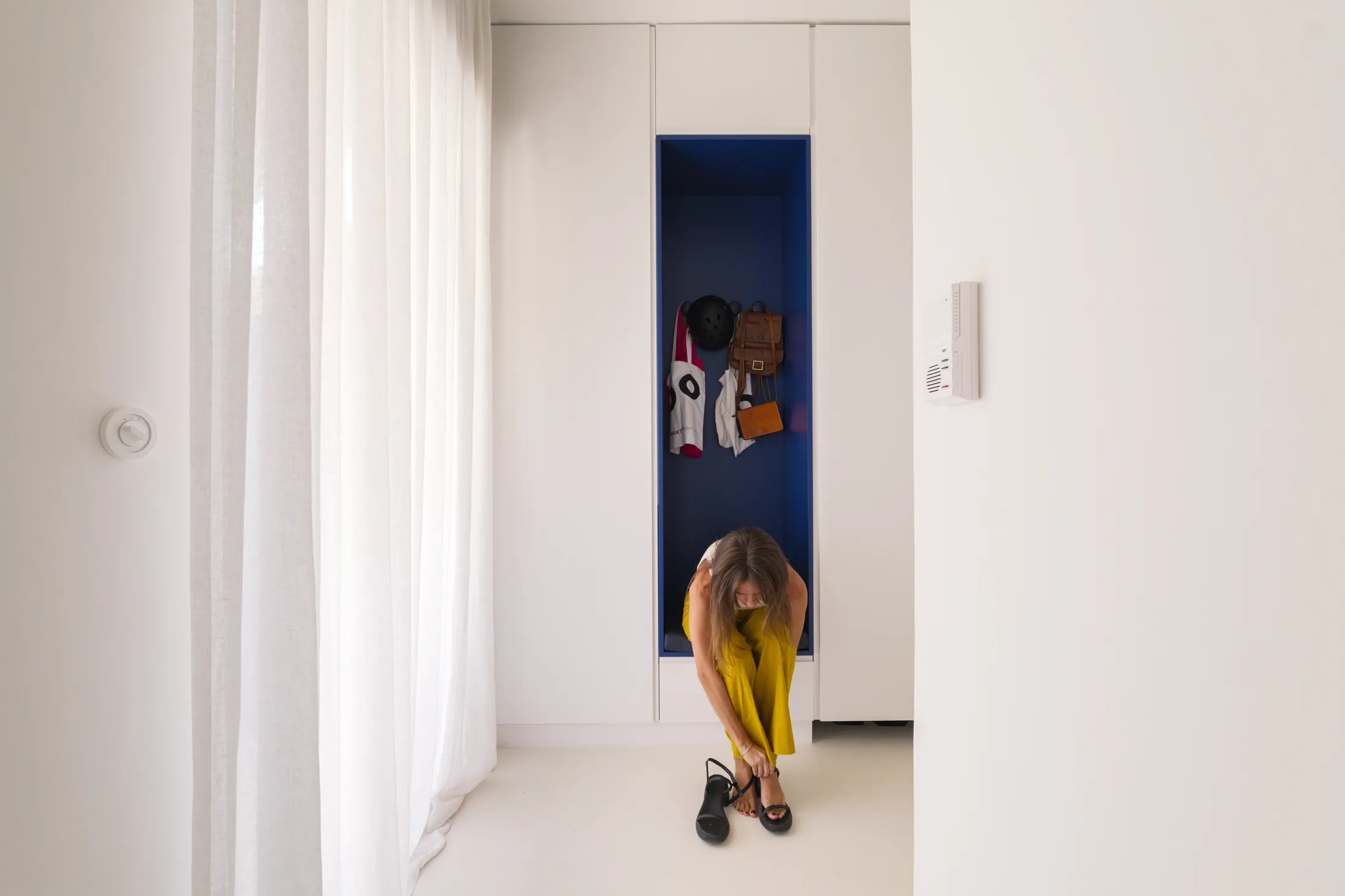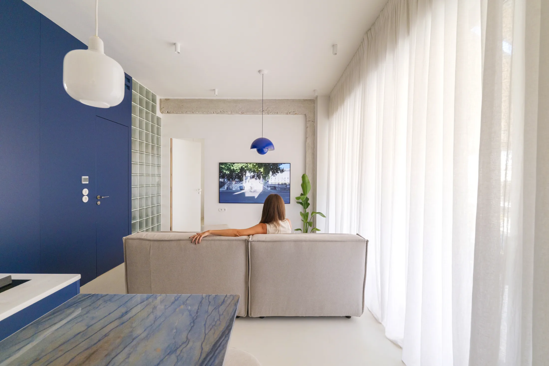 Inspired by the marble of the Panathenaic Stadium, the steel detailing of the Acropolis Museum, and the deep blue Athenian sky, the renovation of this top-floor 1960s apartment balances history, colour, and contemporary design. Designed by architect Elli Athanasiadou of Space Is Around Us, the reimagined layout merges kitchen, dining, and living areas into one open space, defined by a bold blue feature volume and white marble kitchen surfaces. Built-in cabinetry, integrated seating, and fluted glass windows enhance light, privacy, and storage, while exposed concrete columns and vintage-style fixtures subtly nod to the apartment’s mid-century origins. In the bedroom, a wall-to-wall wardrobe and lift-up bed maximise space without clutter, while a spacious terrace overlooking Athens’ two hills extends the living area, complete with a Jacuzzi, custom seating, and retractable awning. The result is a serene urban retreat that channels the city’s ancient spirit through modern design and timeless materials.