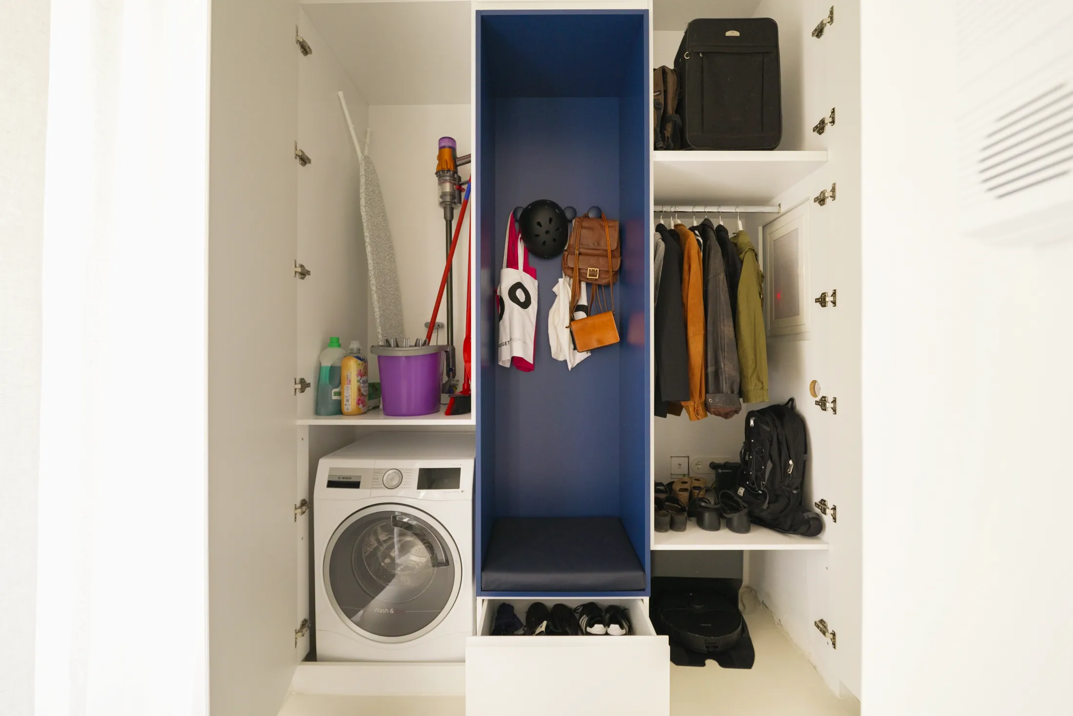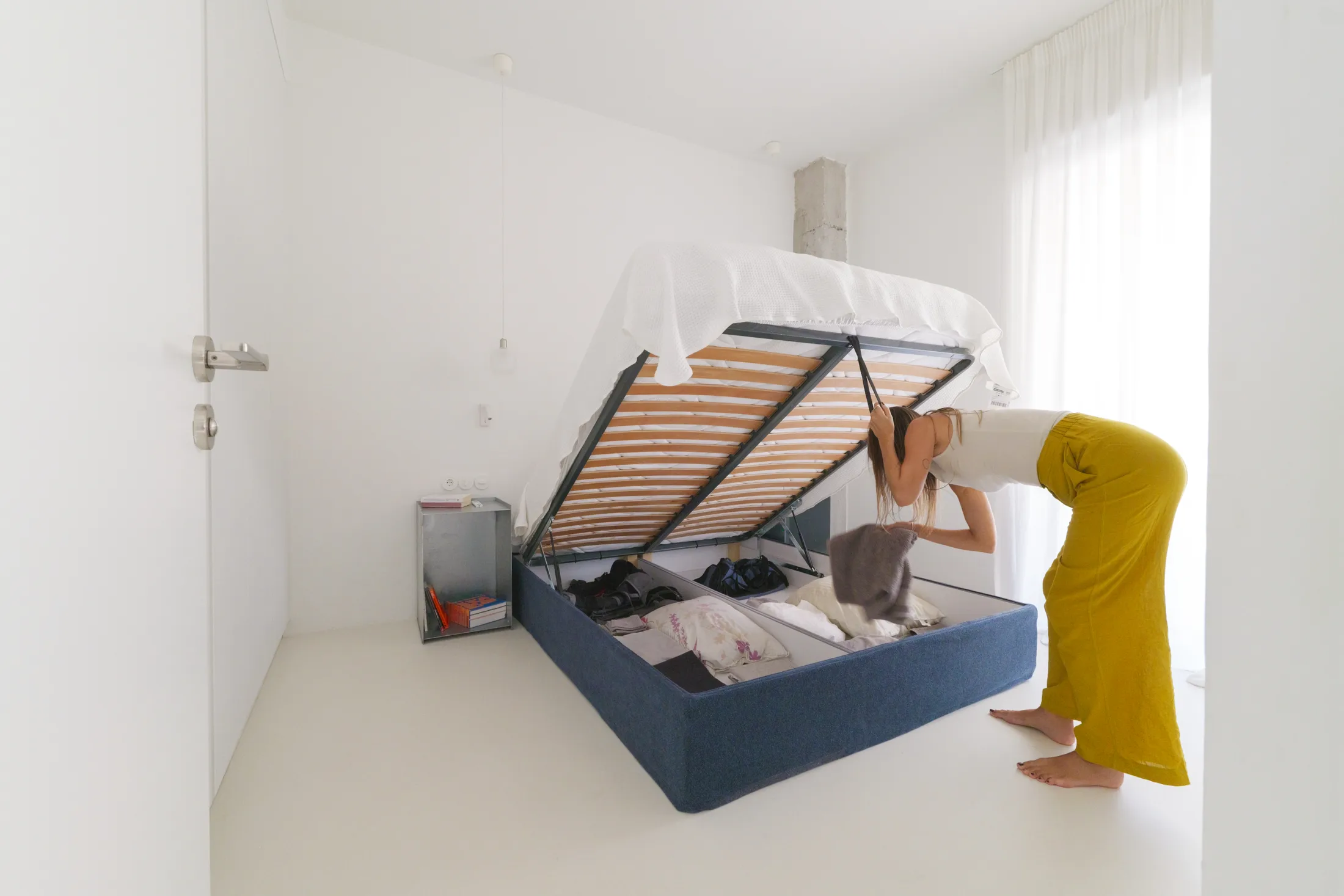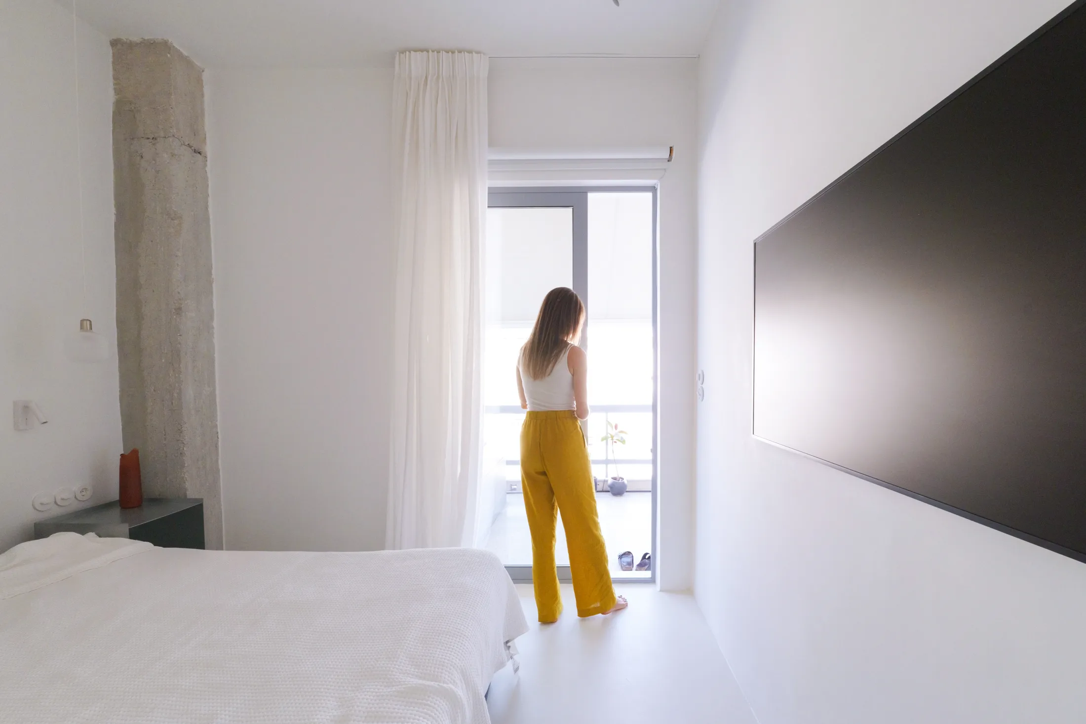 Inspired by the marble of the Panathenaic Stadium, the steel detailing of the Acropolis Museum, and the deep blue Athenian sky, the renovation of this top-floor 1960s apartment balances history, colour, and contemporary design. Designed by architect Elli Athanasiadou of Space Is Around Us, the reimagined layout merges kitchen, dining, and living areas into one open space, defined by a bold blue feature volume and white marble kitchen surfaces. Built-in cabinetry, integrated seating, and fluted glass windows enhance light, privacy, and storage, while exposed concrete columns and vintage-style fixtures subtly nod to the apartment’s mid-century origins. In the bedroom, a wall-to-wall wardrobe and lift-up bed maximise space without clutter, while a spacious terrace overlooking Athens’ two hills extends the living area, complete with a Jacuzzi, custom seating, and retractable awning. The result is a serene urban retreat that channels the city’s ancient spirit through modern design and timeless materials.