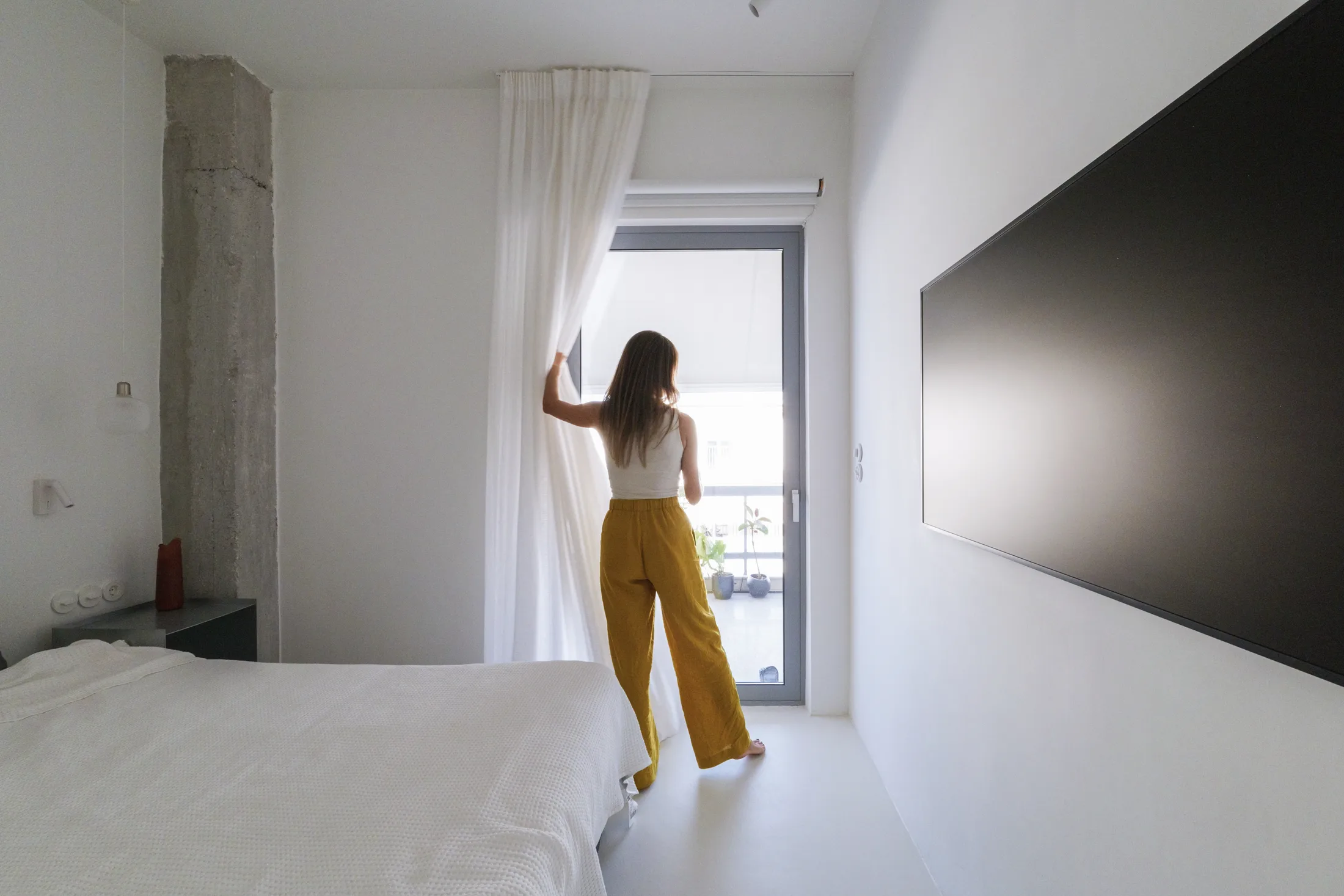 A defining feature of Kyano, the glass-block wall between the bathroom and living area lets daylight filter through by day and casts a gentle glow at night. It adds privacy, texture, and a sculptural play of light that changes with the hours.